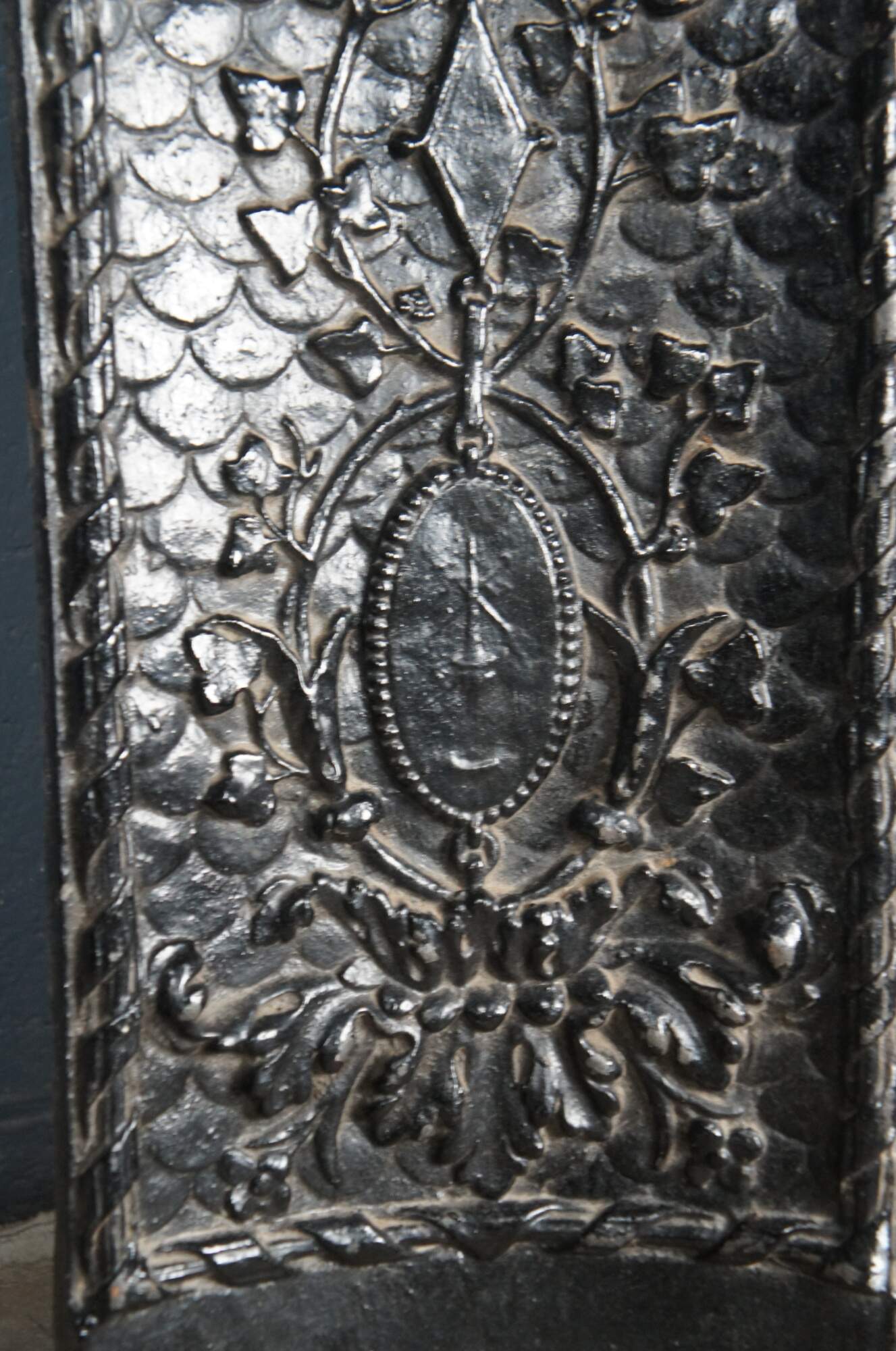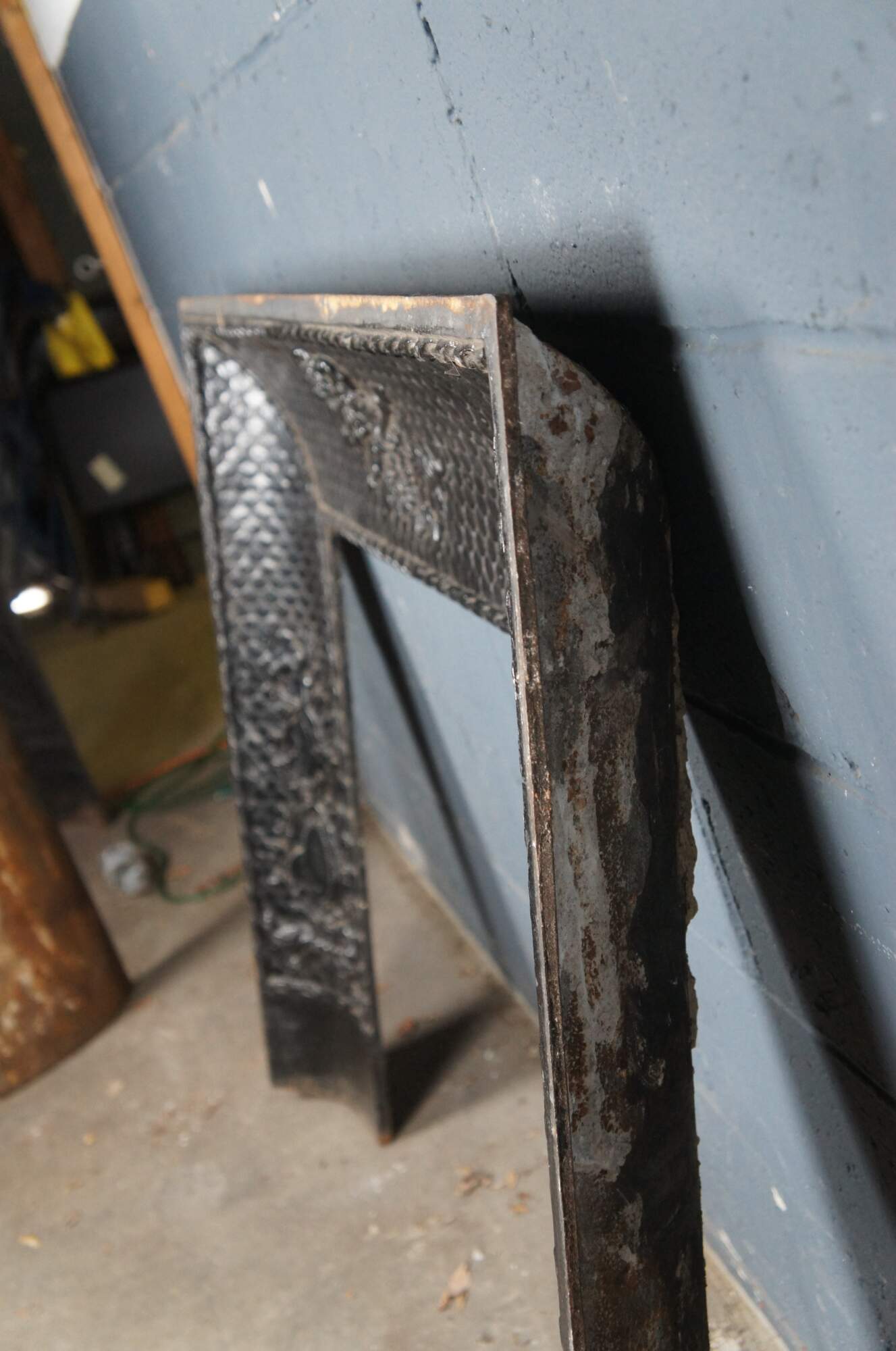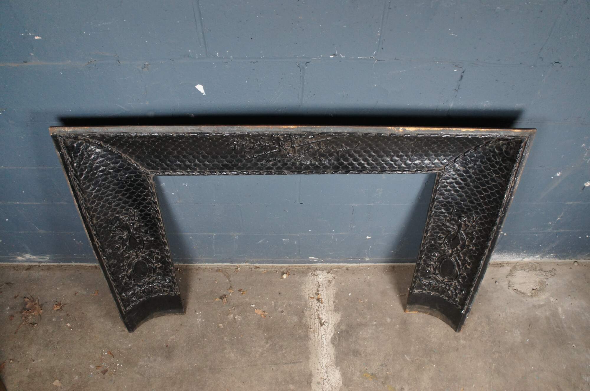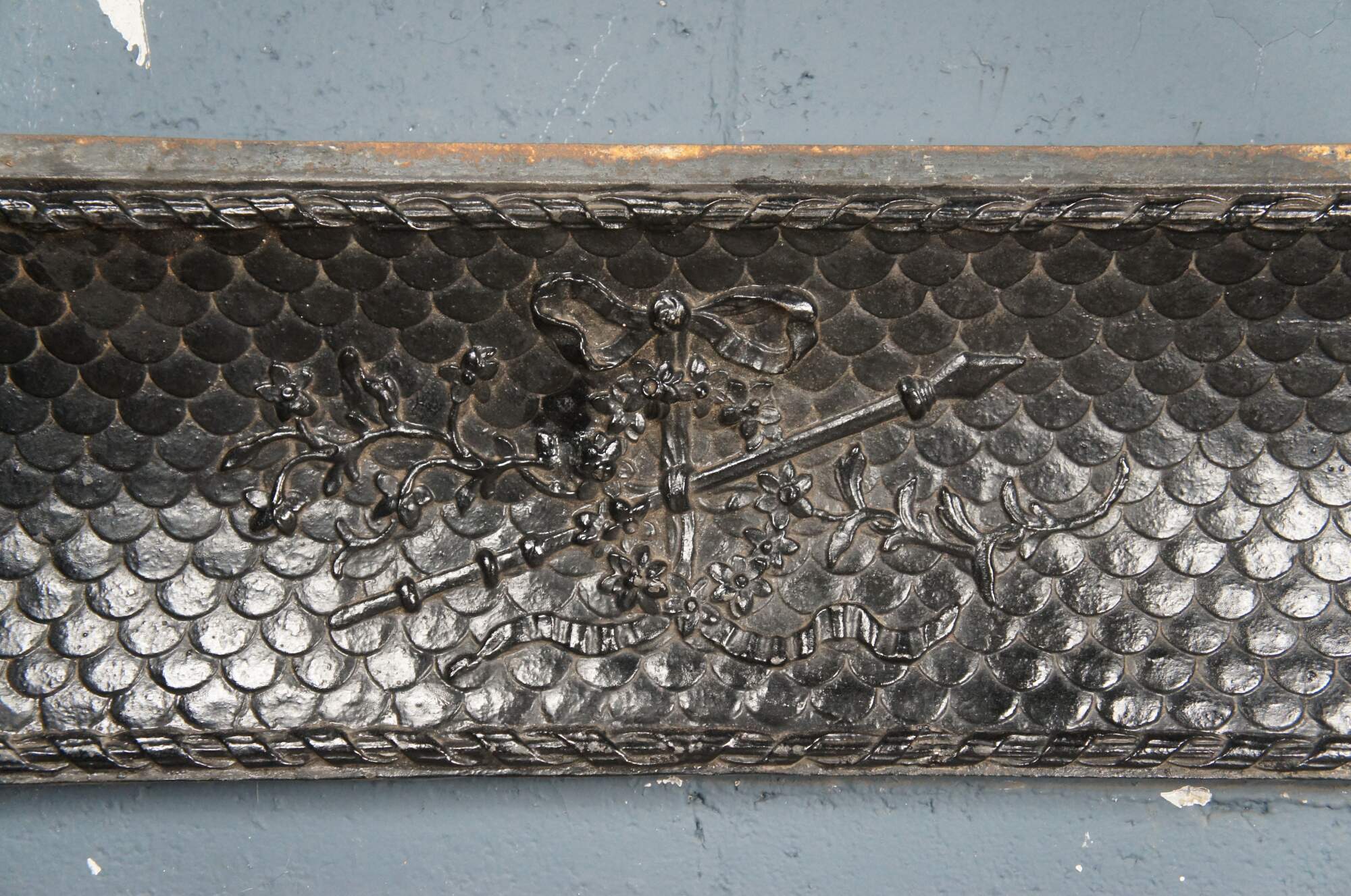 A rare and impressive mid 19th century French cast iron fireplace insert or surround. Features a concave form with meticulous detail. The insert is characterized by a field of animal scales giving off a leather like feel. At the center is a floral wreath with neoclassical ribbon knotted around a spear with olive branches extending through it. The sides of the insert feature an ornamental design with a charm of a diamond and cameo resting upon an acanthus leaf surrounded by vines. The insert is framed along the inner and outer edge by a ribboned rope trim. A gorgeous piece that will add grandeur to any setting.