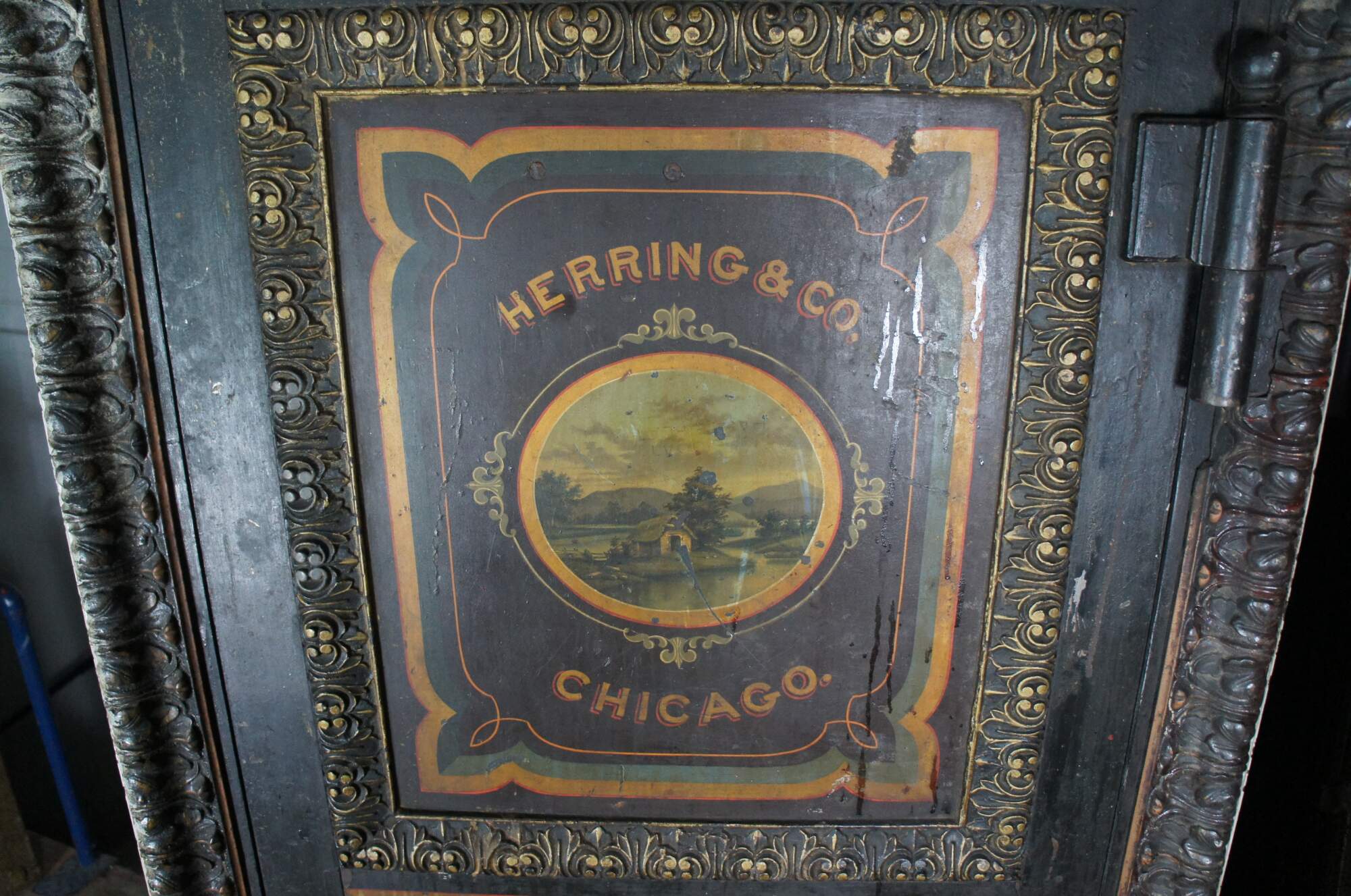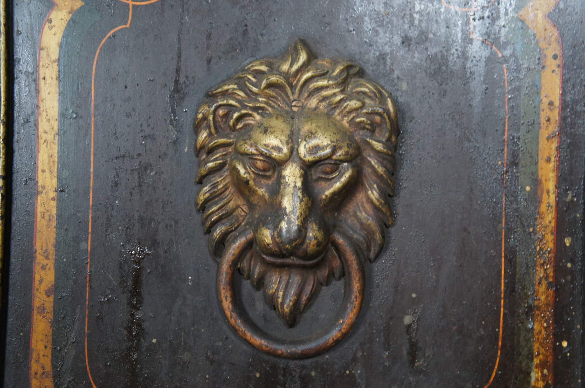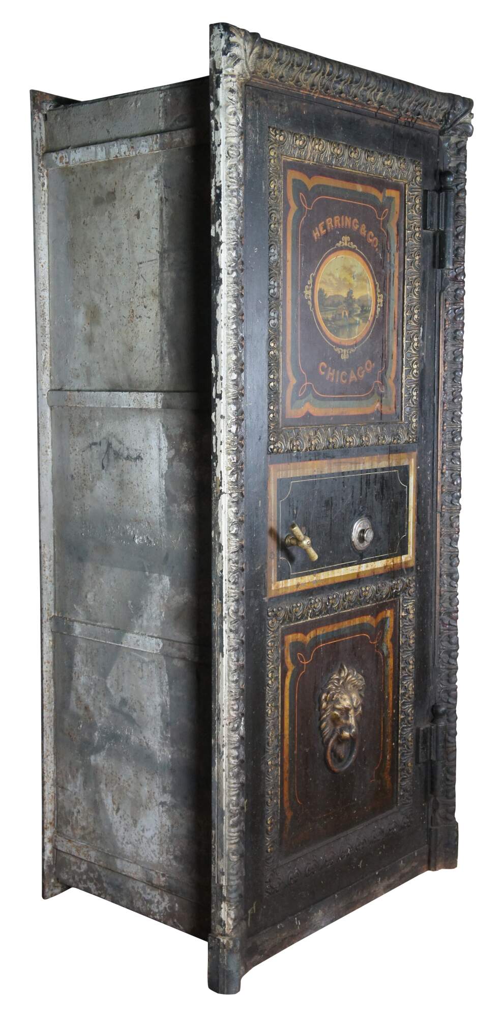 An exceptional and rare intact example of a Herring & Co. Chicago fireproof bank vault door, circa 1860-70s. The hand painted door is made from steel and iron, a true work of art. Herring & Co Chicago is Emblazoned along the top panel around a lovely cottage landscape and framed within filigree and pin striping. The bottom panel features a fierce bronze lion head knocker. Each panel is trimmed in ornate acanthus metalwork which is continued around the edge of the door in low relief. The heavy door opens to an interior set of French doors. Behind these doors would have been the bank vault. Full size vaults doors from this era are increasingly scarce and nearly impossible to find with this level of decorative detail.