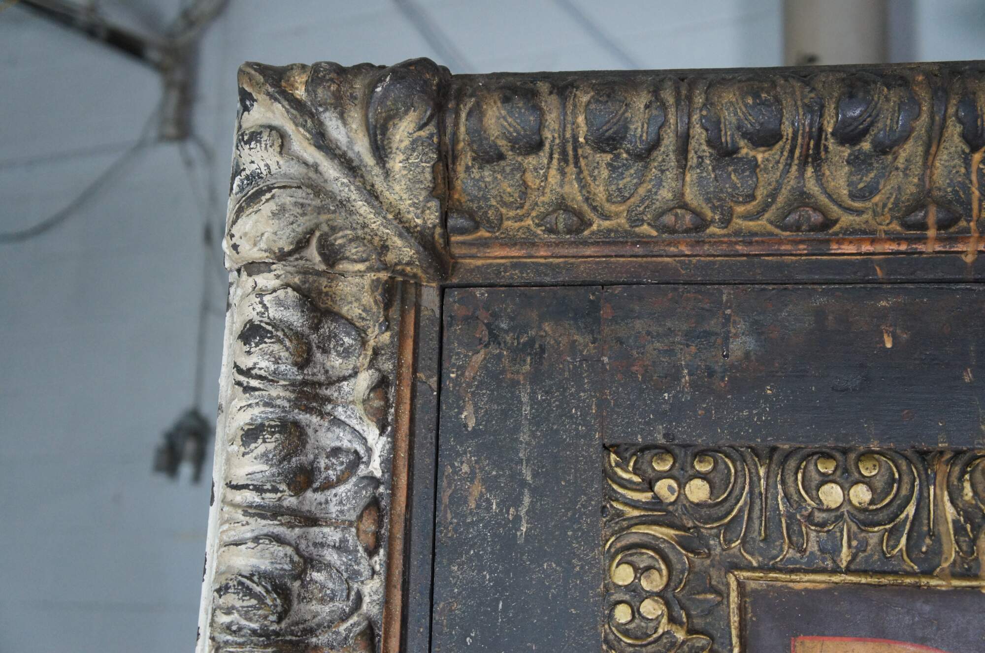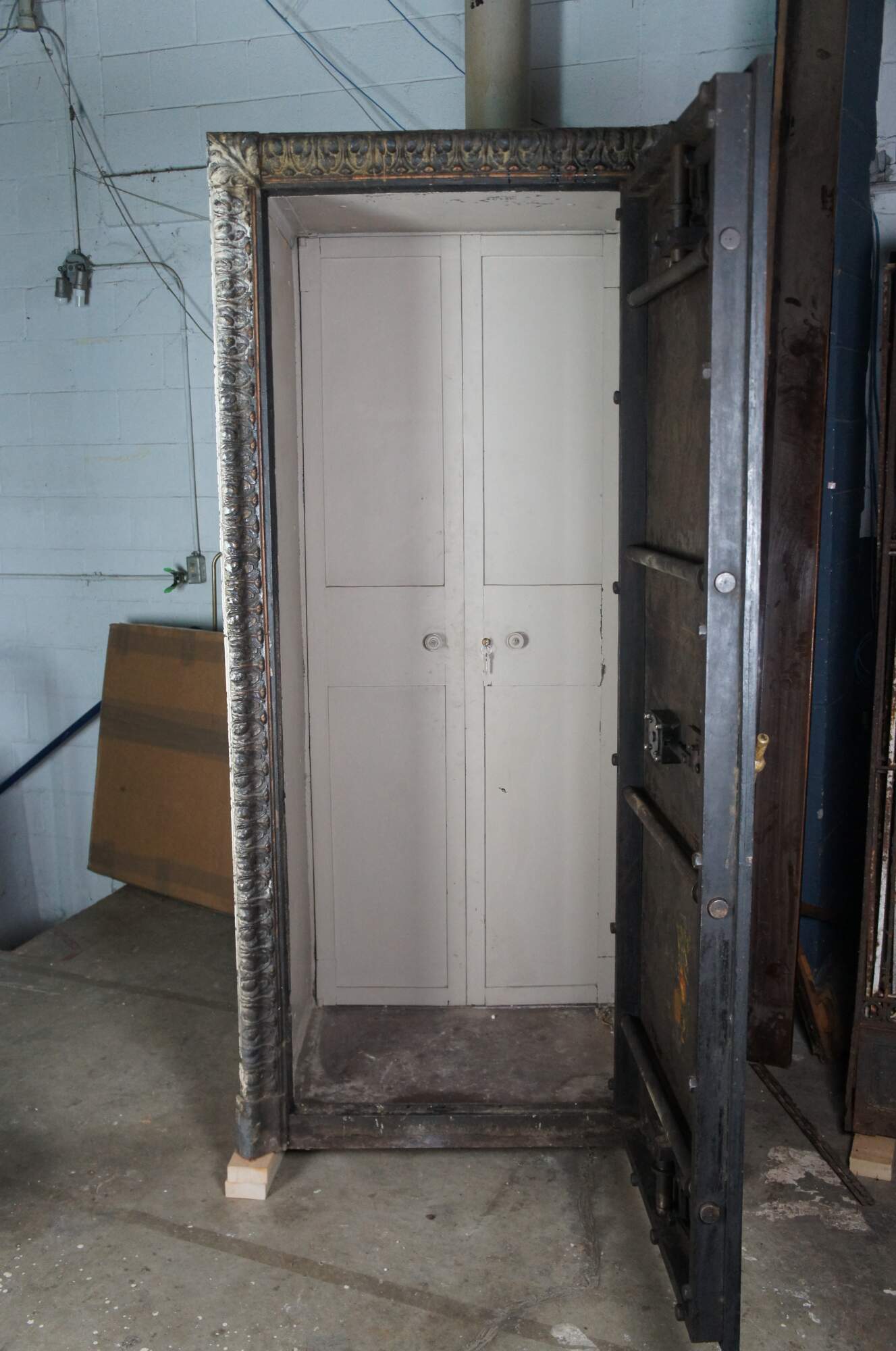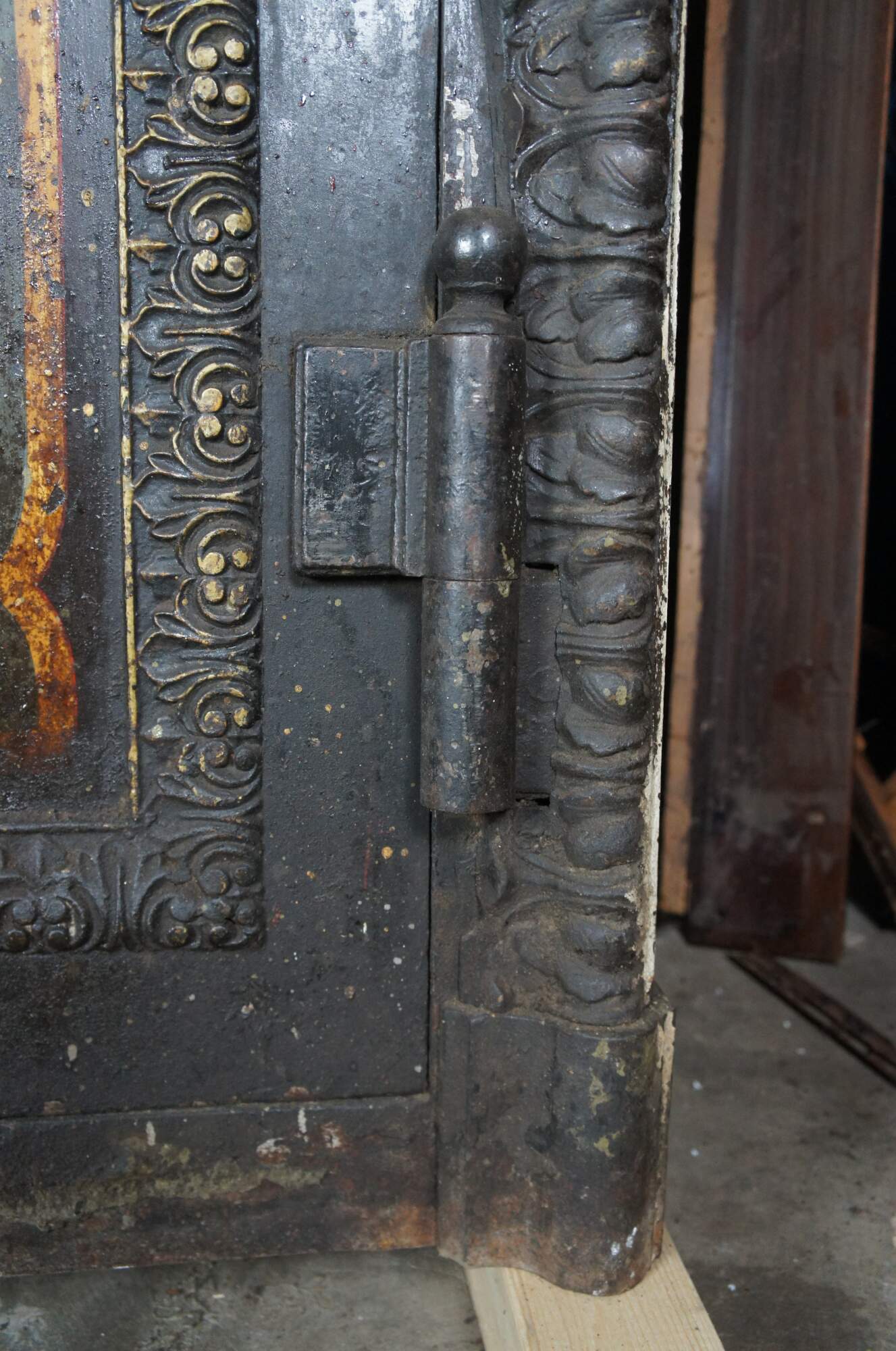 An exceptional and rare intact example of a Herring & Co. Chicago fireproof bank vault door, circa 1860-70s. The hand painted door is made from steel and iron, a true work of art. Herring & Co Chicago is Emblazoned along the top panel around a lovely cottage landscape and framed within filigree and pin striping. The bottom panel features a fierce bronze lion head knocker. Each panel is trimmed in ornate acanthus metalwork which is continued around the edge of the door in low relief. The heavy door opens to an interior set of French doors. Behind these doors would have been the bank vault. Full size vaults doors from this era are increasingly scarce and nearly impossible to find with this level of decorative detail.