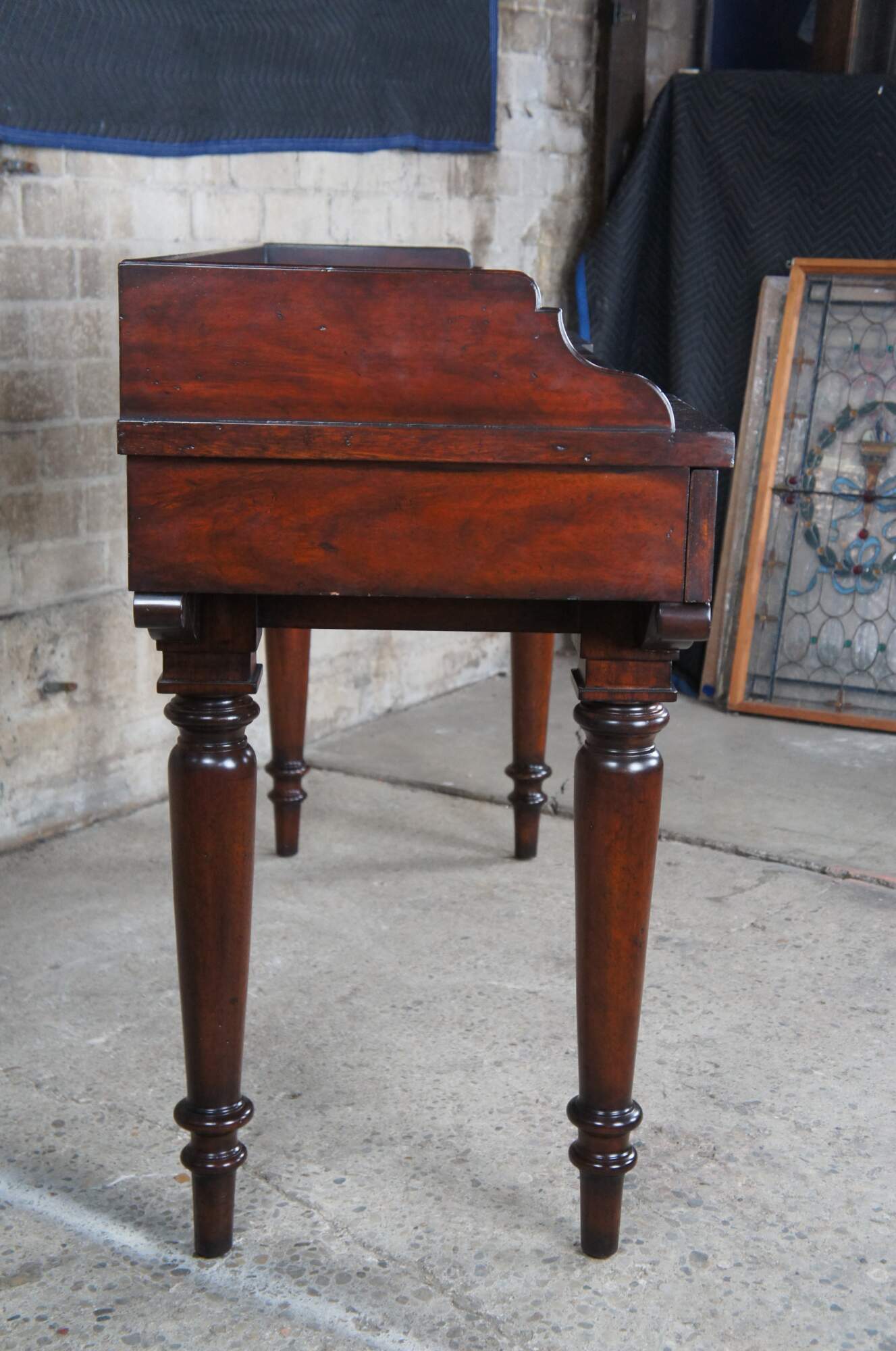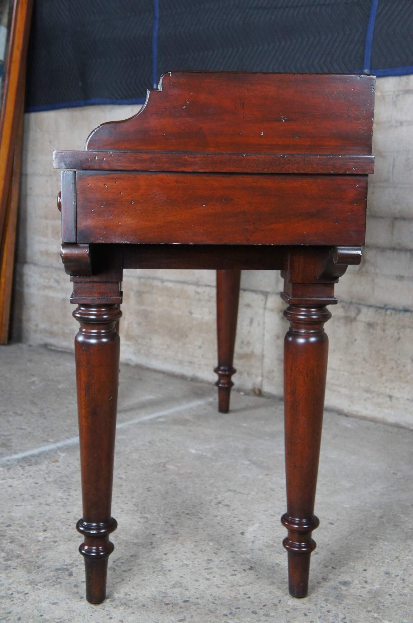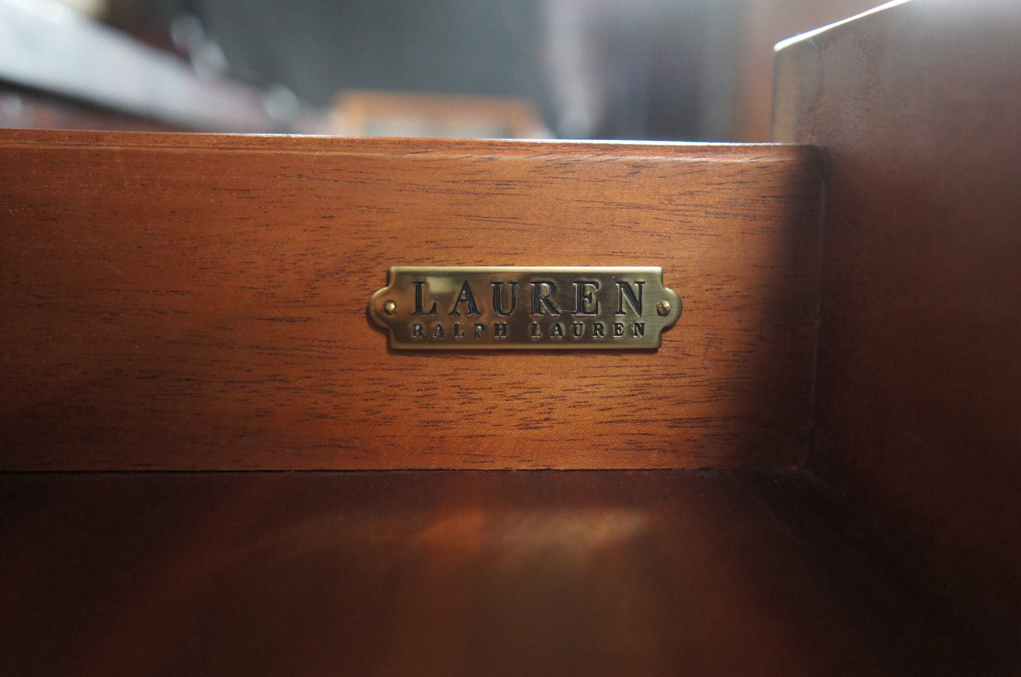 An impressive late 20th Century large-scale mahogany British Colonial inspired server or sideboard. Features a rectangular form topped with an elegant gallery over three drawers. The case is supported by scrolled brackets turned leads leading to arrow feet. Signed Ralph Lauren in a drawer.