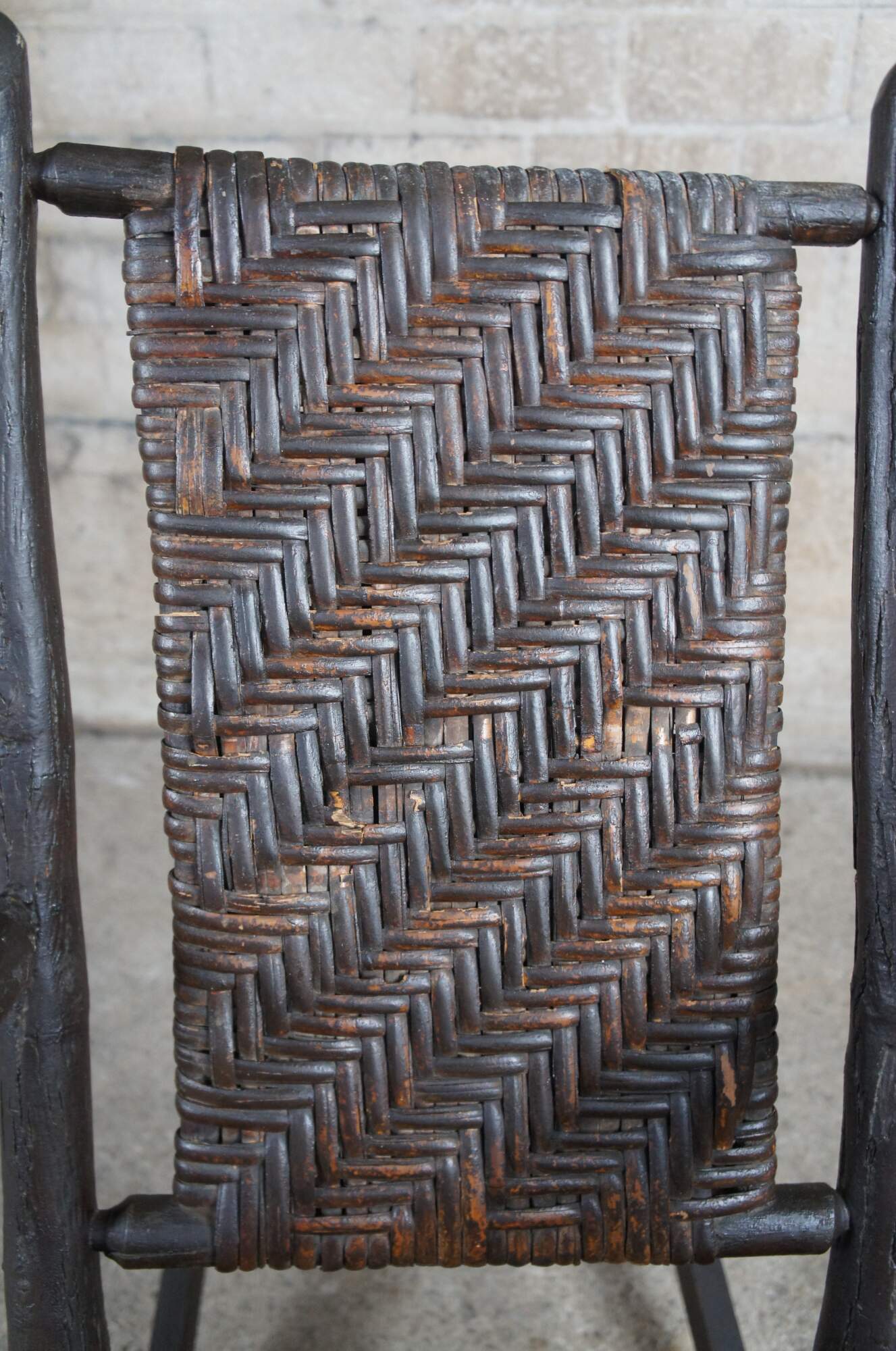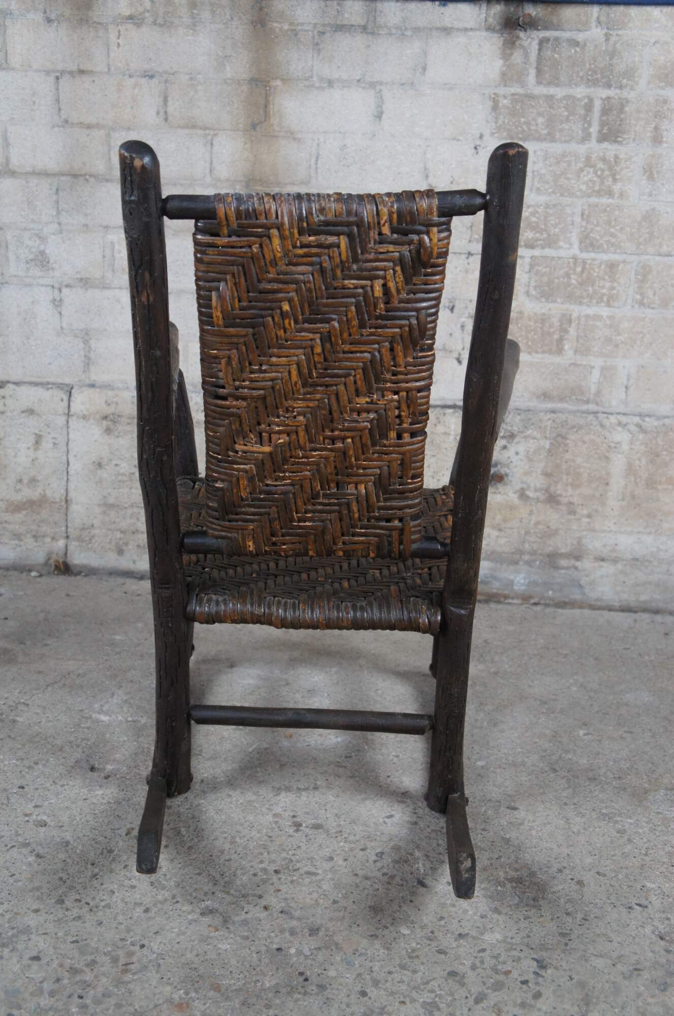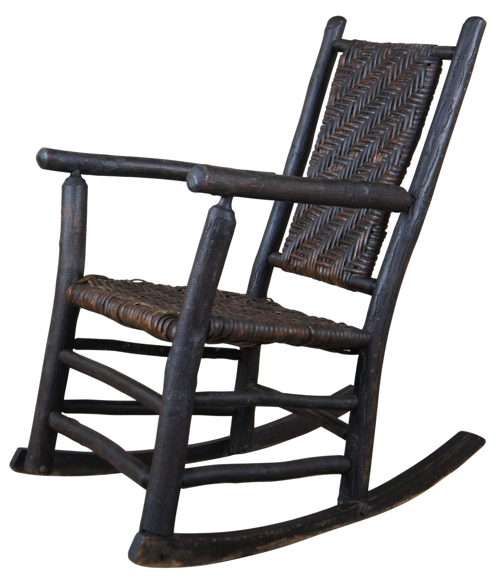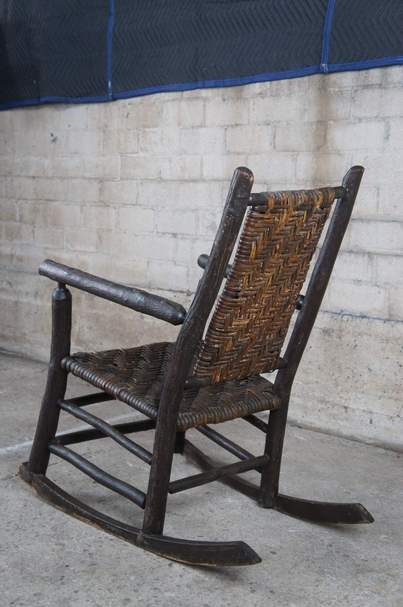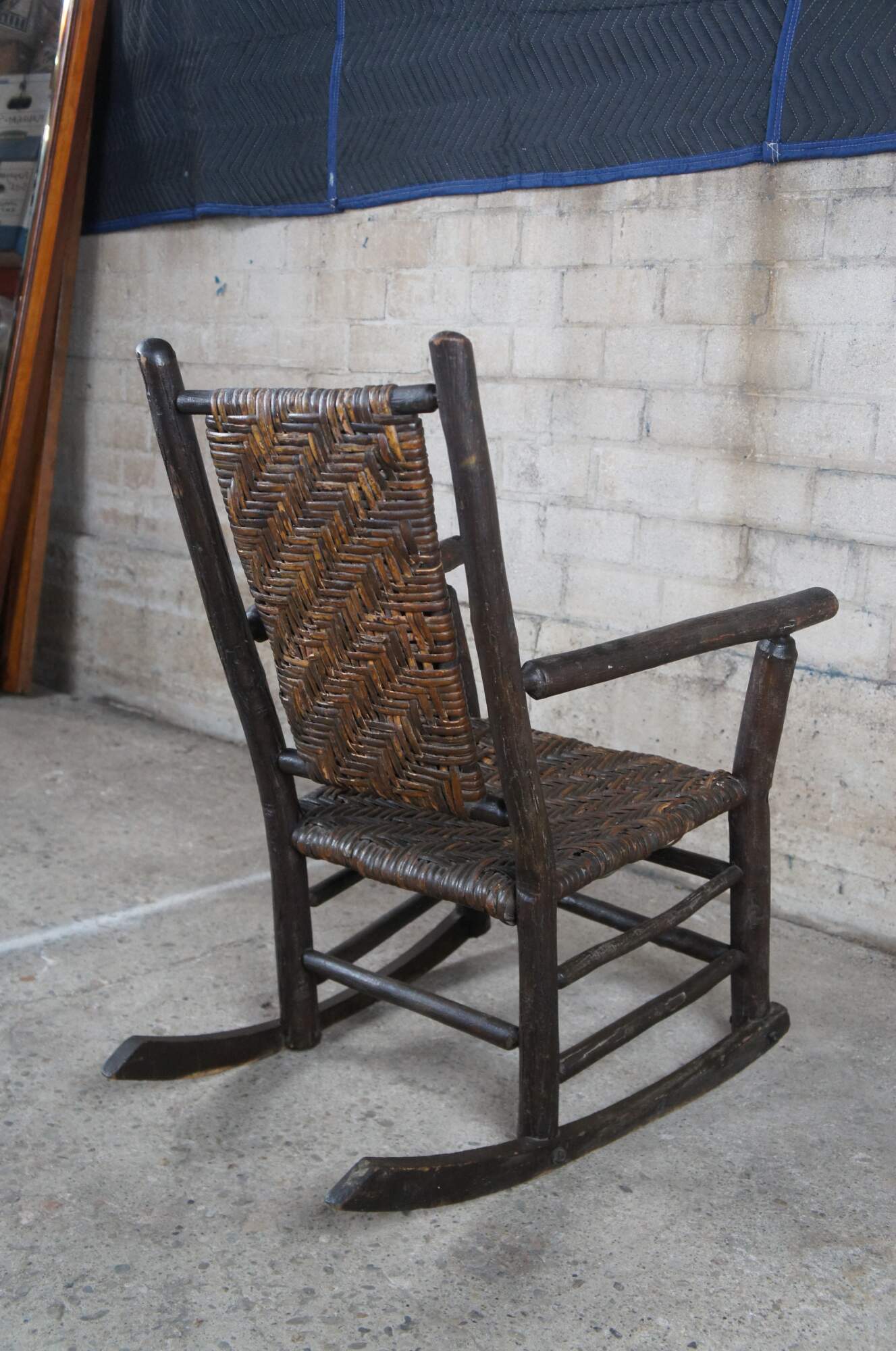 Antique circa 1930s #21 rocking chair by Old Hickory Furniture Company of Martinsville, Indiana. Features a primitive Adirondack style with flared arms and rattan seat.