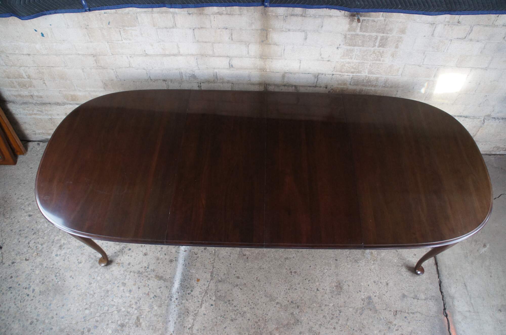 Ethan Allen Georgian Court Oval Extension Table, Circa 1980s. Made from Cherry with 2 leaves for extension, queen anne legs and pad feet. 11-6094, stain #255. Table extends to 96" with both leaves in place.