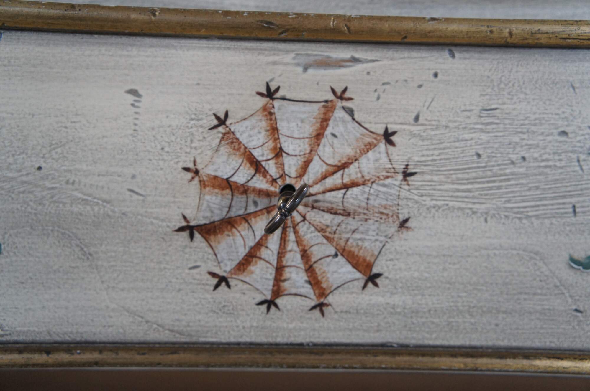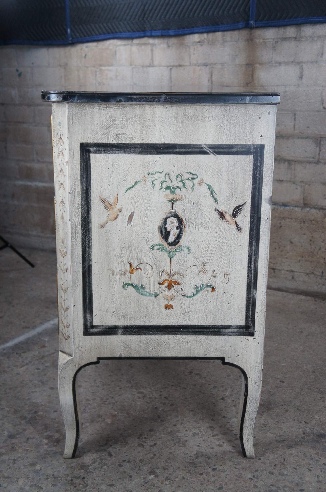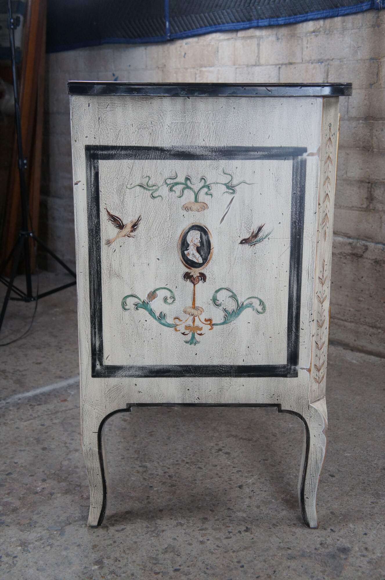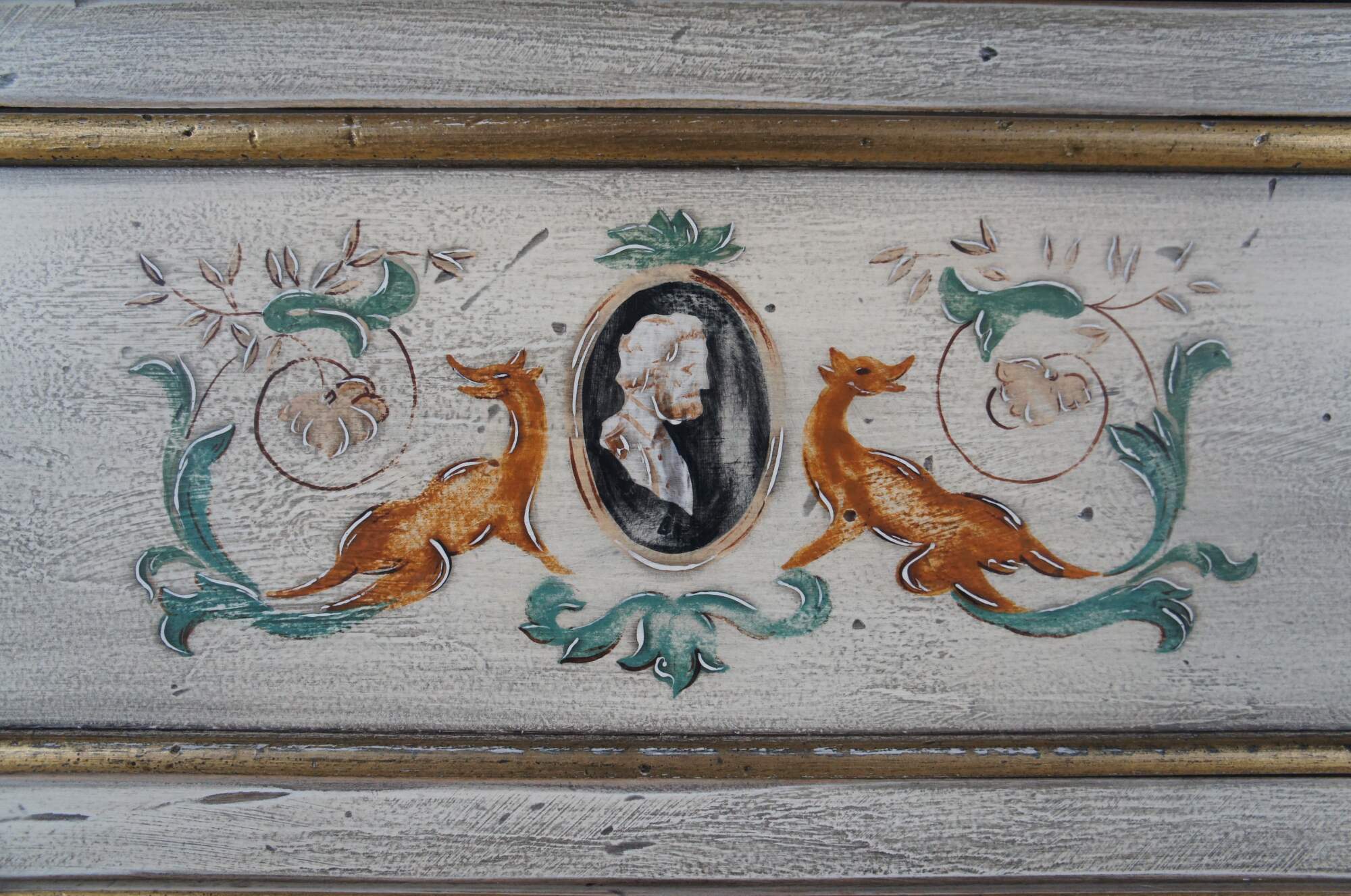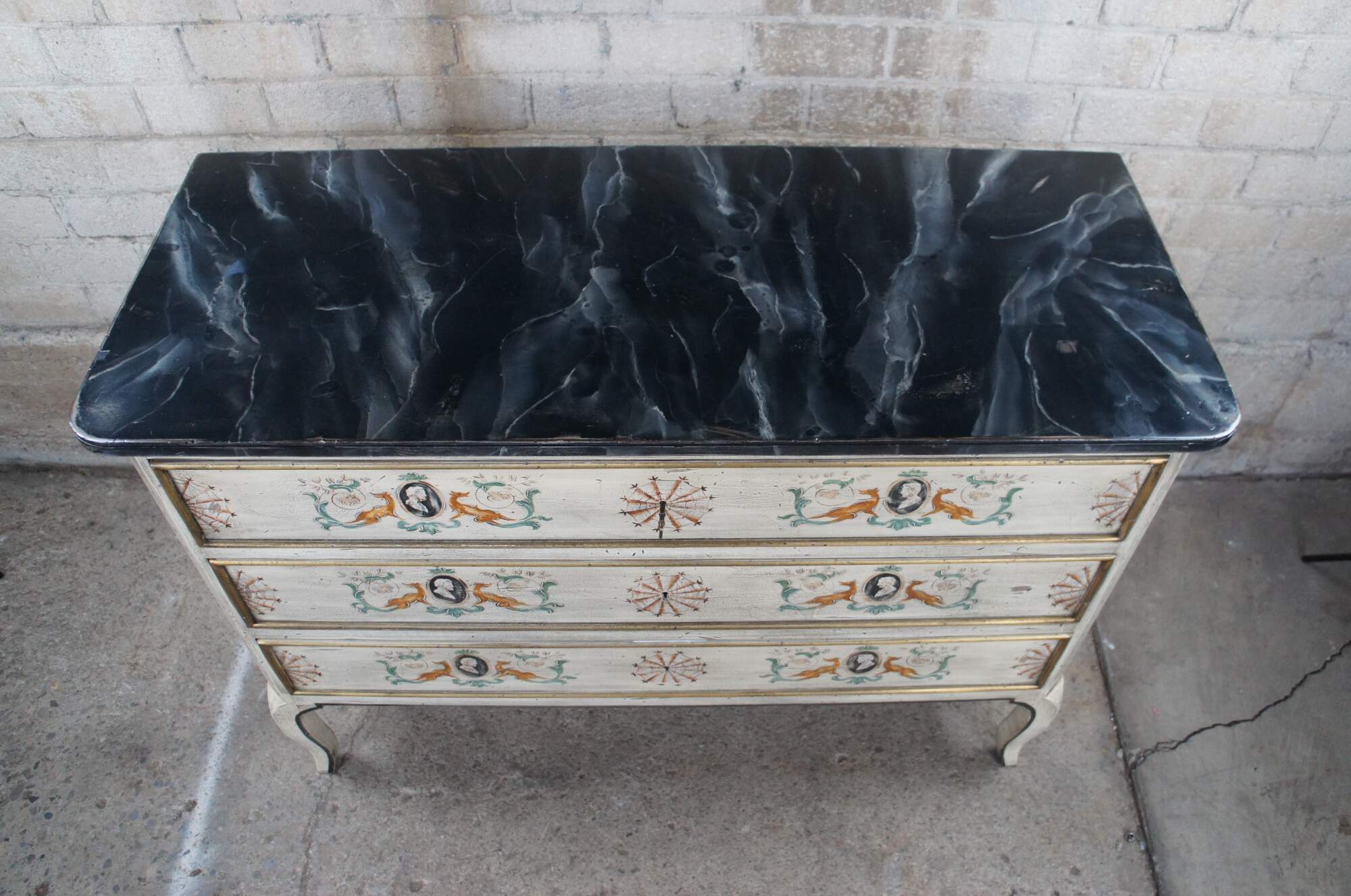 The feeling and beauty of Tuscany is slowly and faithfully reproduced by Grand Rapids hand decorators. This transitional chest is made from Cherry and finished in a rustic white with antique Gold Leaf trim, faux marble top and Tuscan Decoration. Features a rectangular frame of three dovetailed drawers with chamfered corners raised over four cabriole legs. Each drawer opens and locks via key. A versatile furnishing great for use as an entryway chest, console, tv/ media stand or dresser. Circa late 20th century.