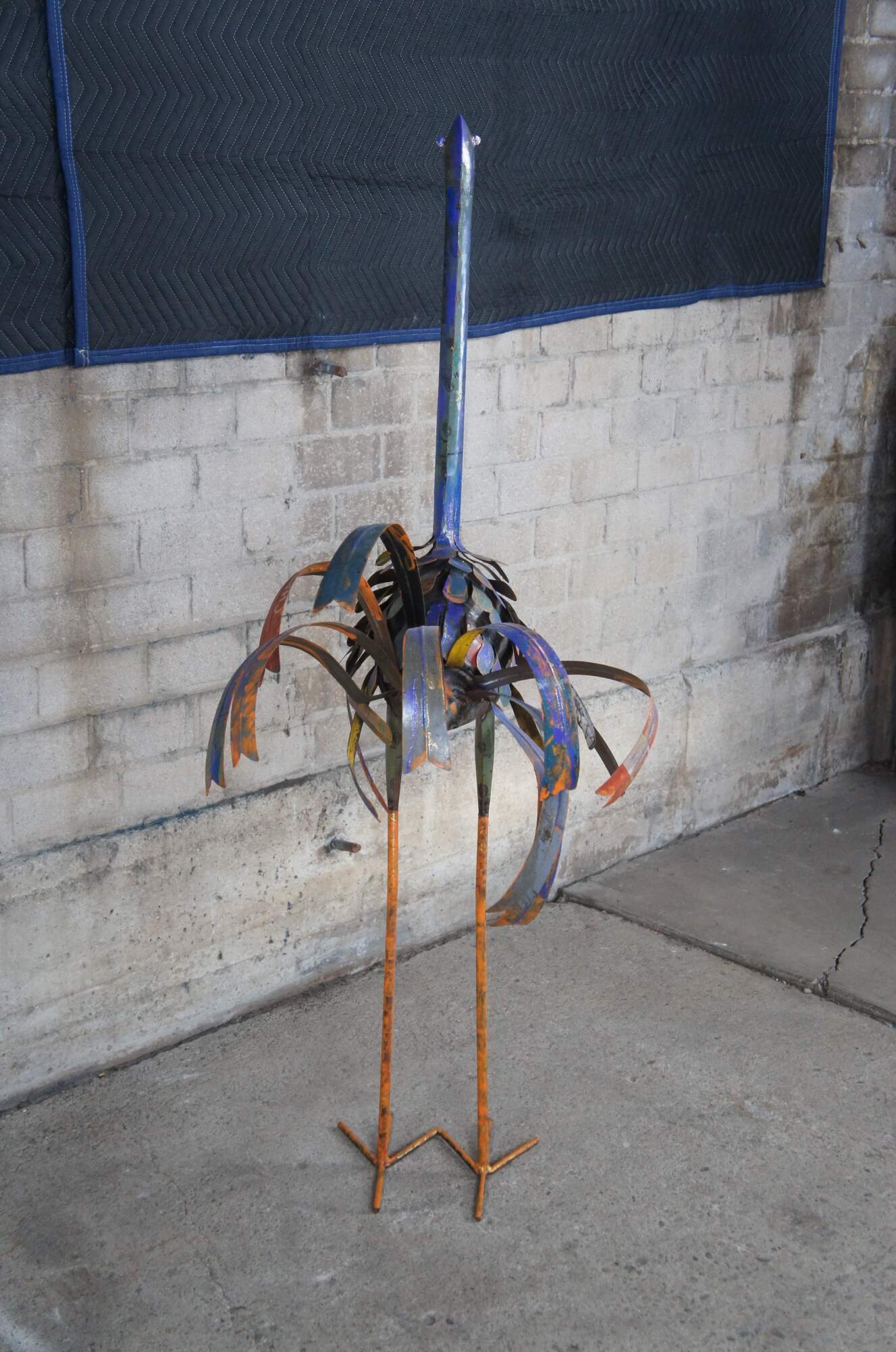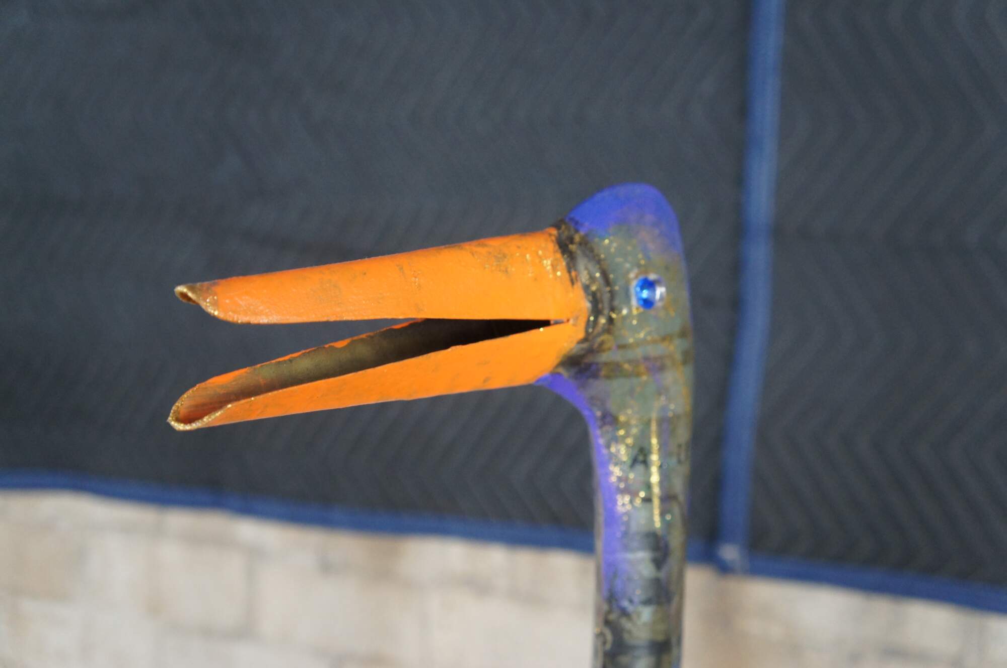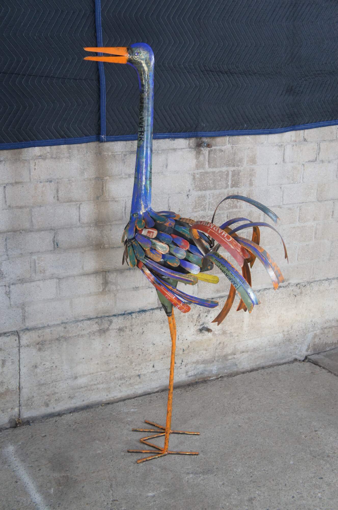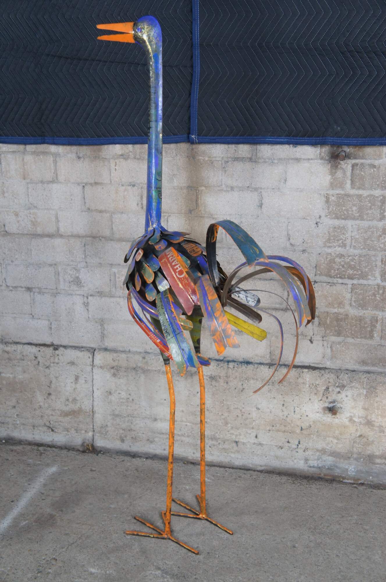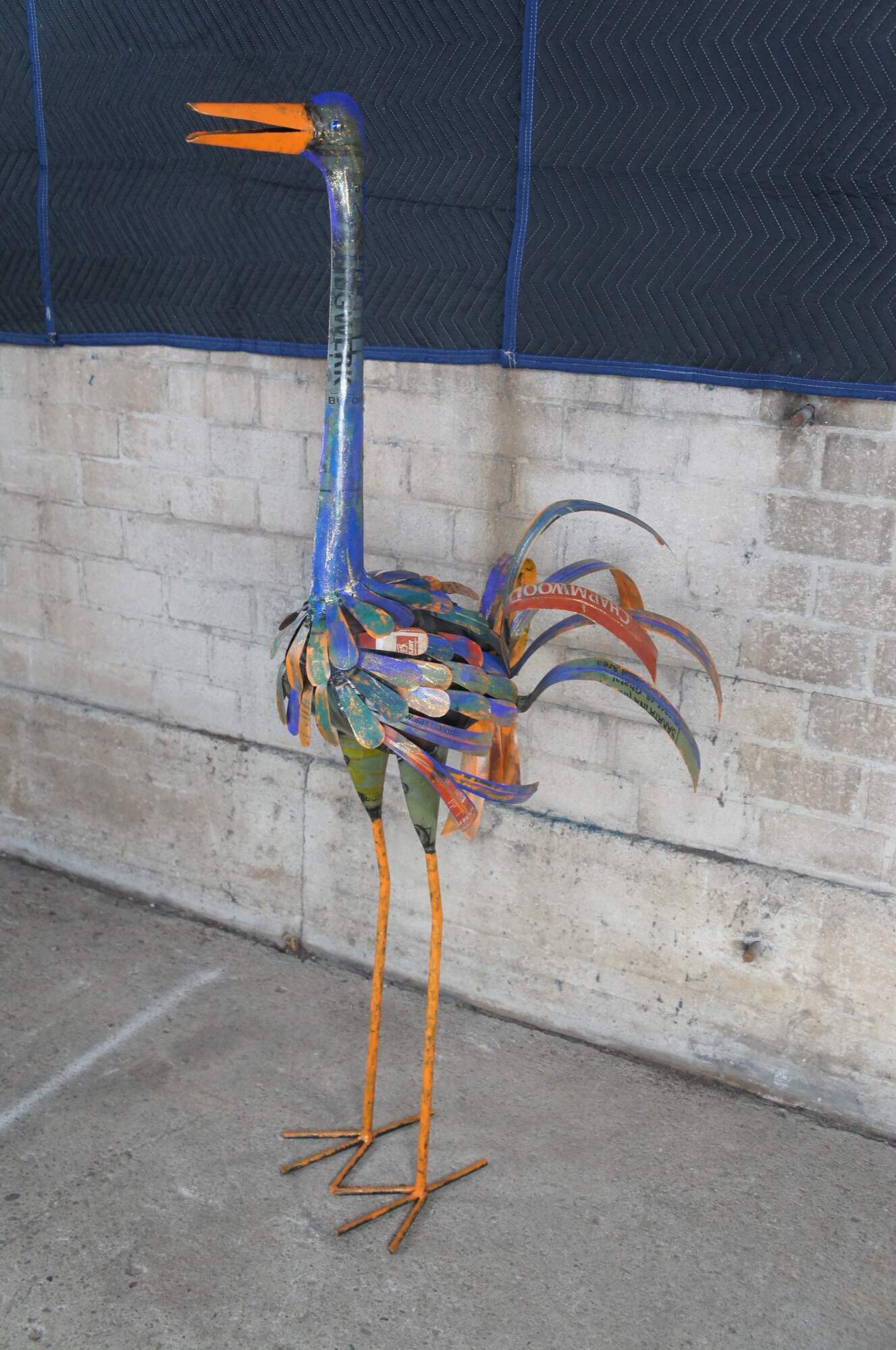 A unique and colorful sculptural crane or ostrich statue. Crafted from reclaimed iron and tin. Features a long purplish neck with orange beek, flowing feathers along the body and wrought iron orange legs and feet. Includes blue jeweled eyes. Predominately purple and orange with shades of green, blue and red. The sculpture is finished with a gold glitter offer a sheen that makes it pop.
