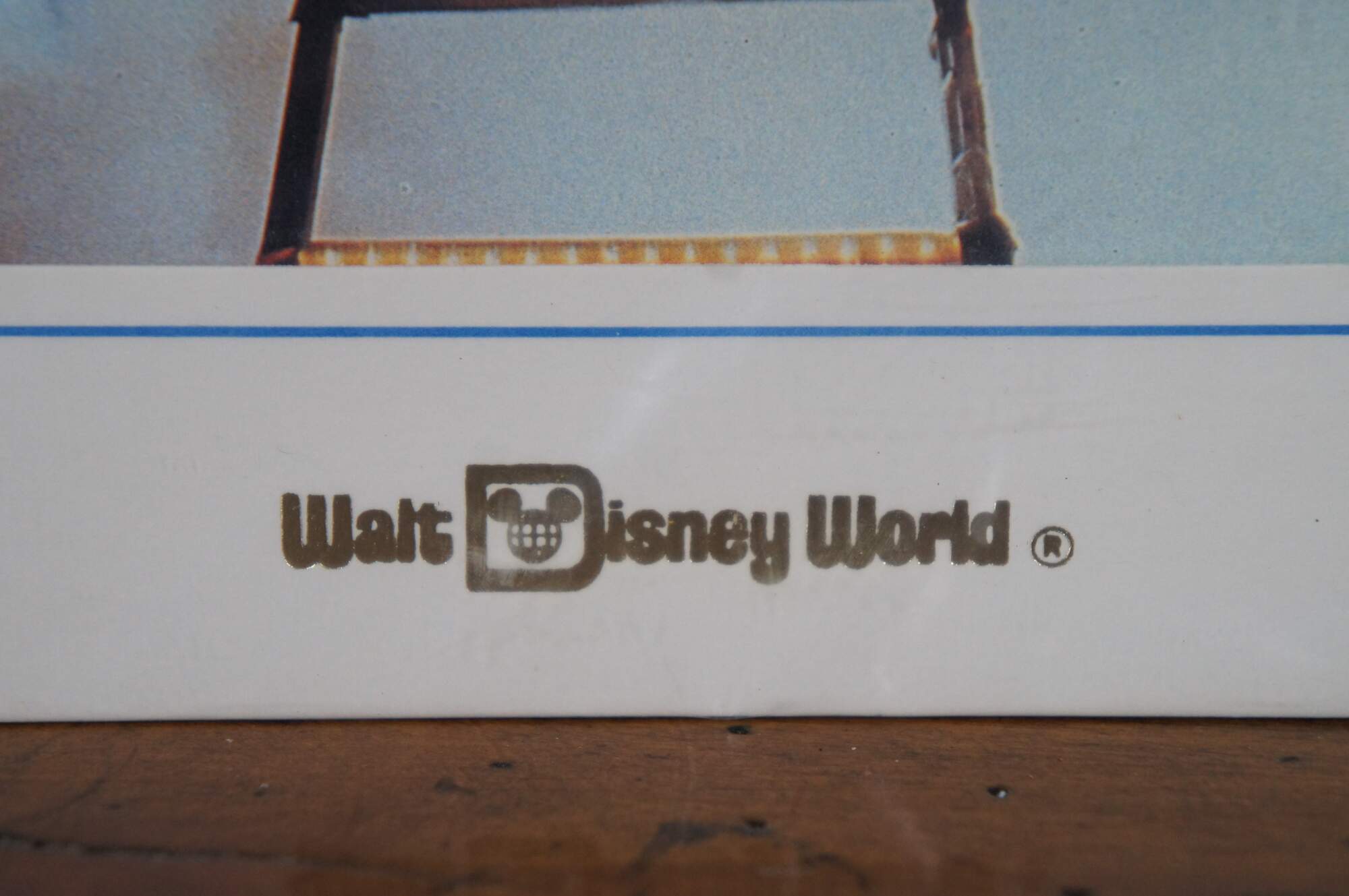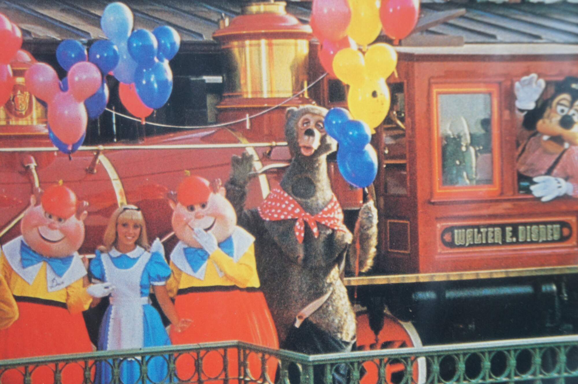 Pair of vintage color souvenir press photographs from Walt Disney World – one showing Mickey, Minnie and Pluto descending from Spaceship Earth, circa 1982; and one showing Goofy playing train conductor of the Walter E. Disney locomotive. On the platform are: Chip n' Dale, Pinocchio, Mickey, Minnie, Donald, Pluto, Tweedle Dum and Dee, Alice, and 1 of the Country Bears. They are holding bunches of multi-colored Mickey Mouse shaped balloons. At the time of this photo, the Magic Kingdom's "population" was 200,000,000. Taken in 1986 Part of the Walt Disney World 15th anniversary press packet.