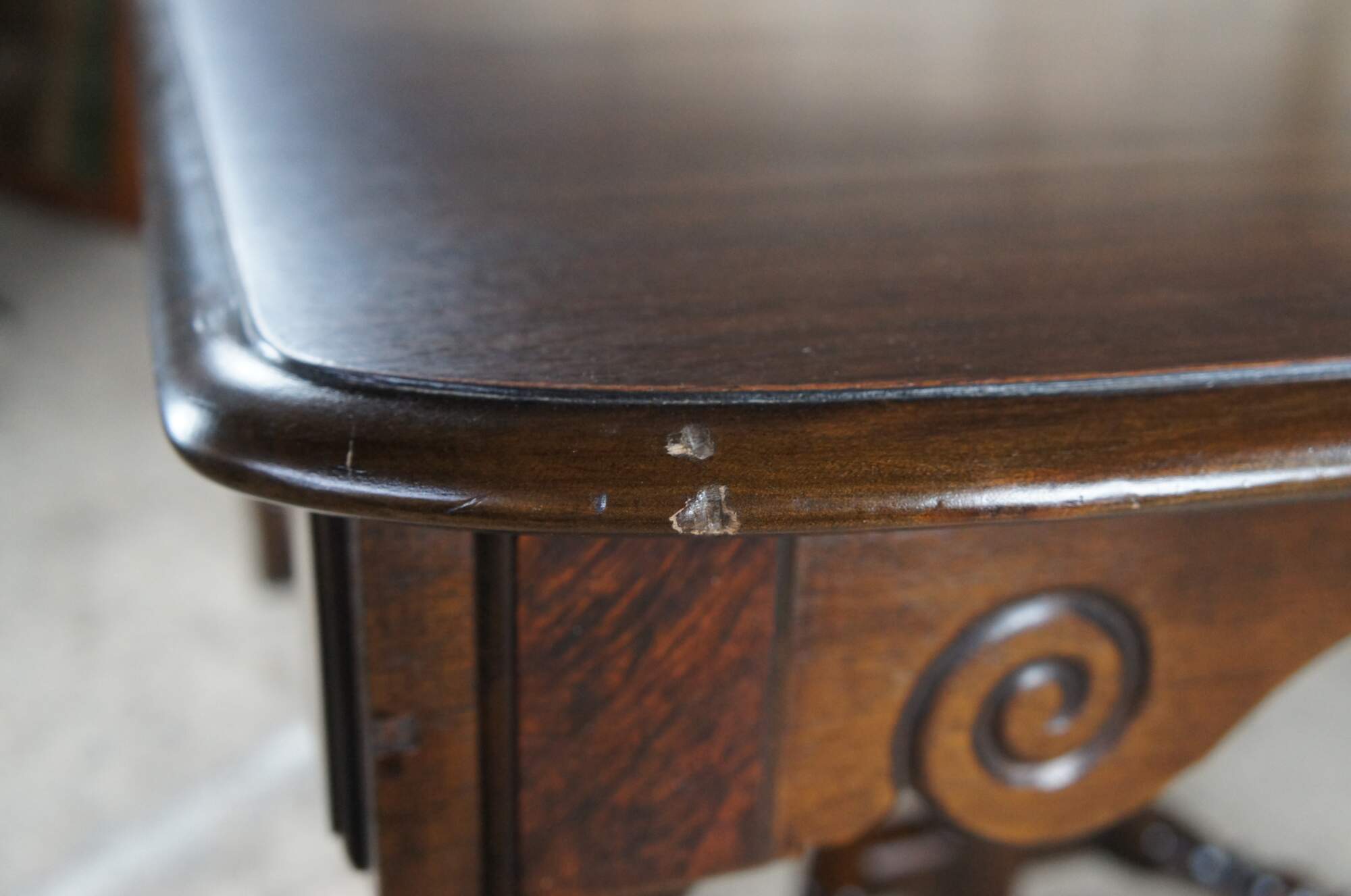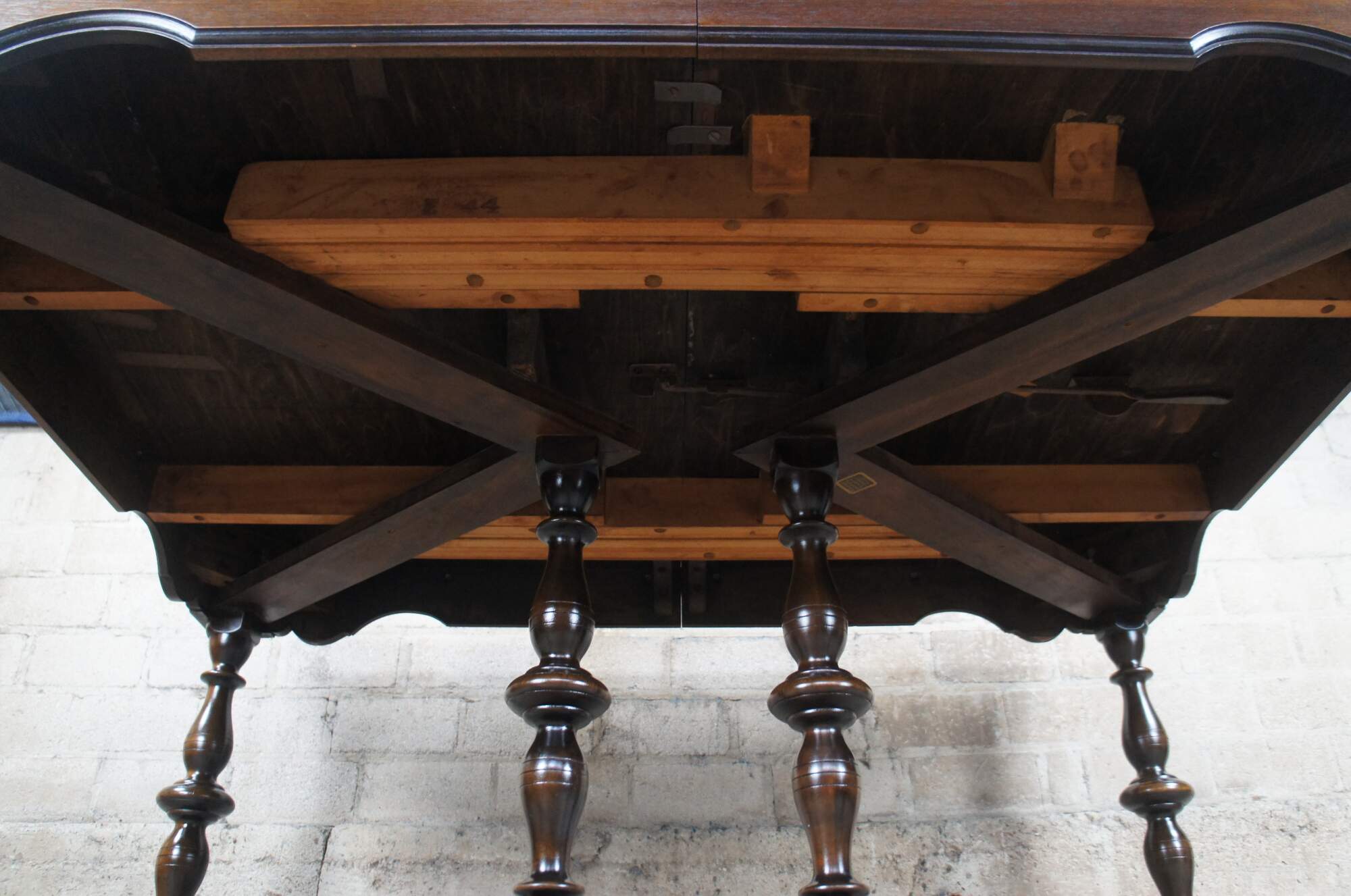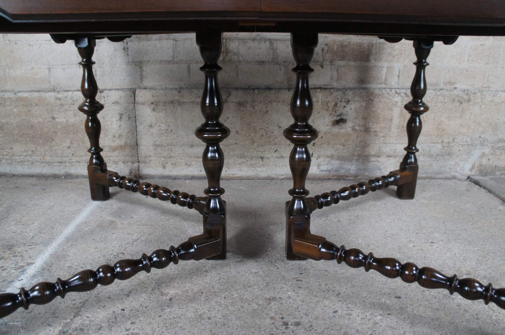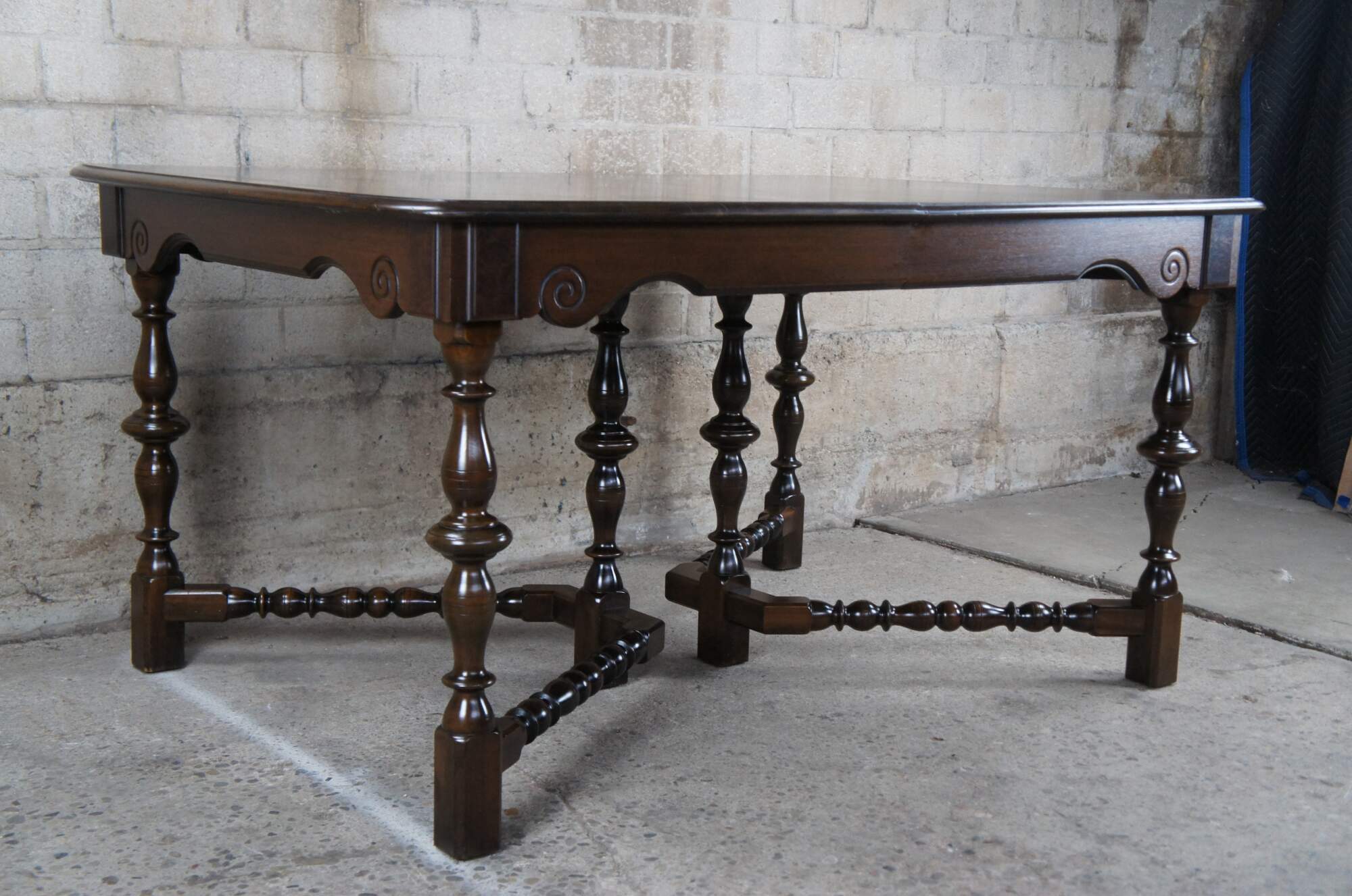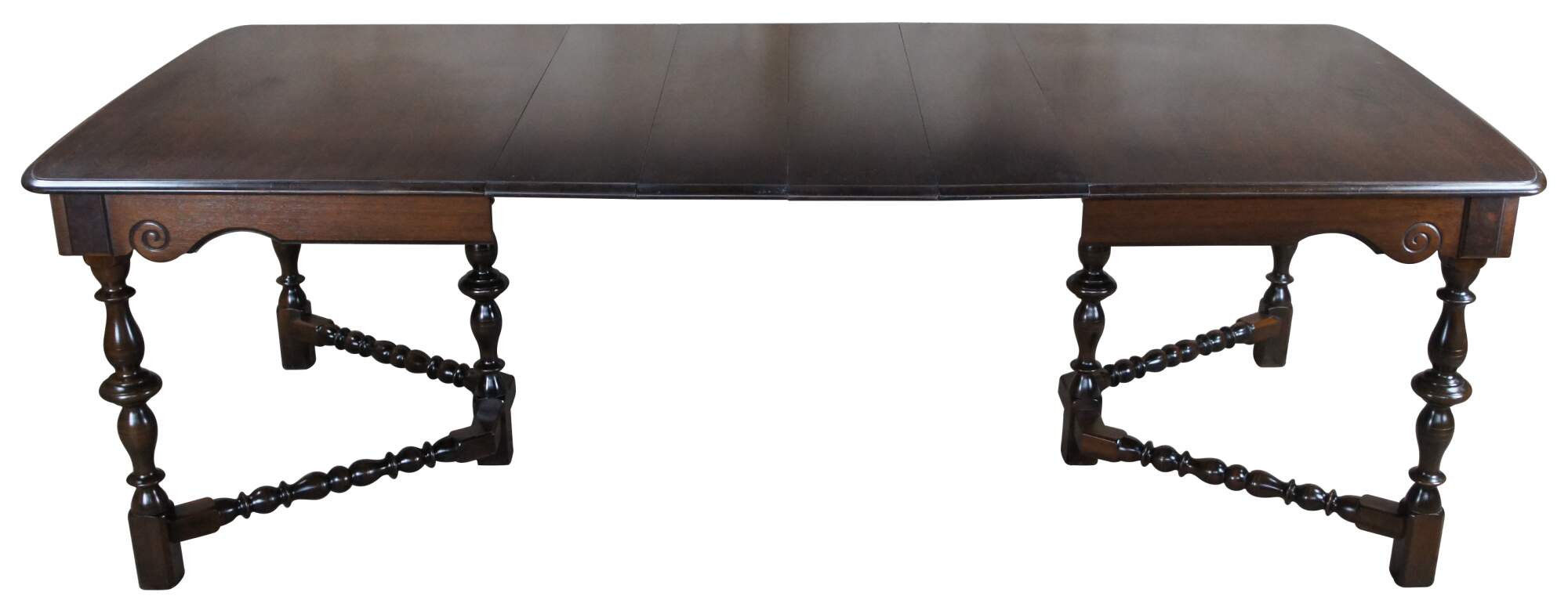 Antique Grand Rapids Chair Company dining table, circa 1910-20s. Drawing inspiration from William & Mary and Jacobean styling. A rectangular frame made from walnut with burled panels along the apron and scrolled accents. The table is supported by beautifully turned supports and includes 4 leaves. Originally purchased from Henshaws Furniture in Cincinnati, Ohio