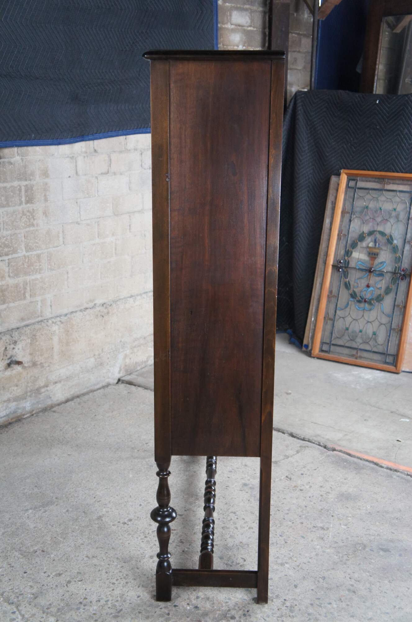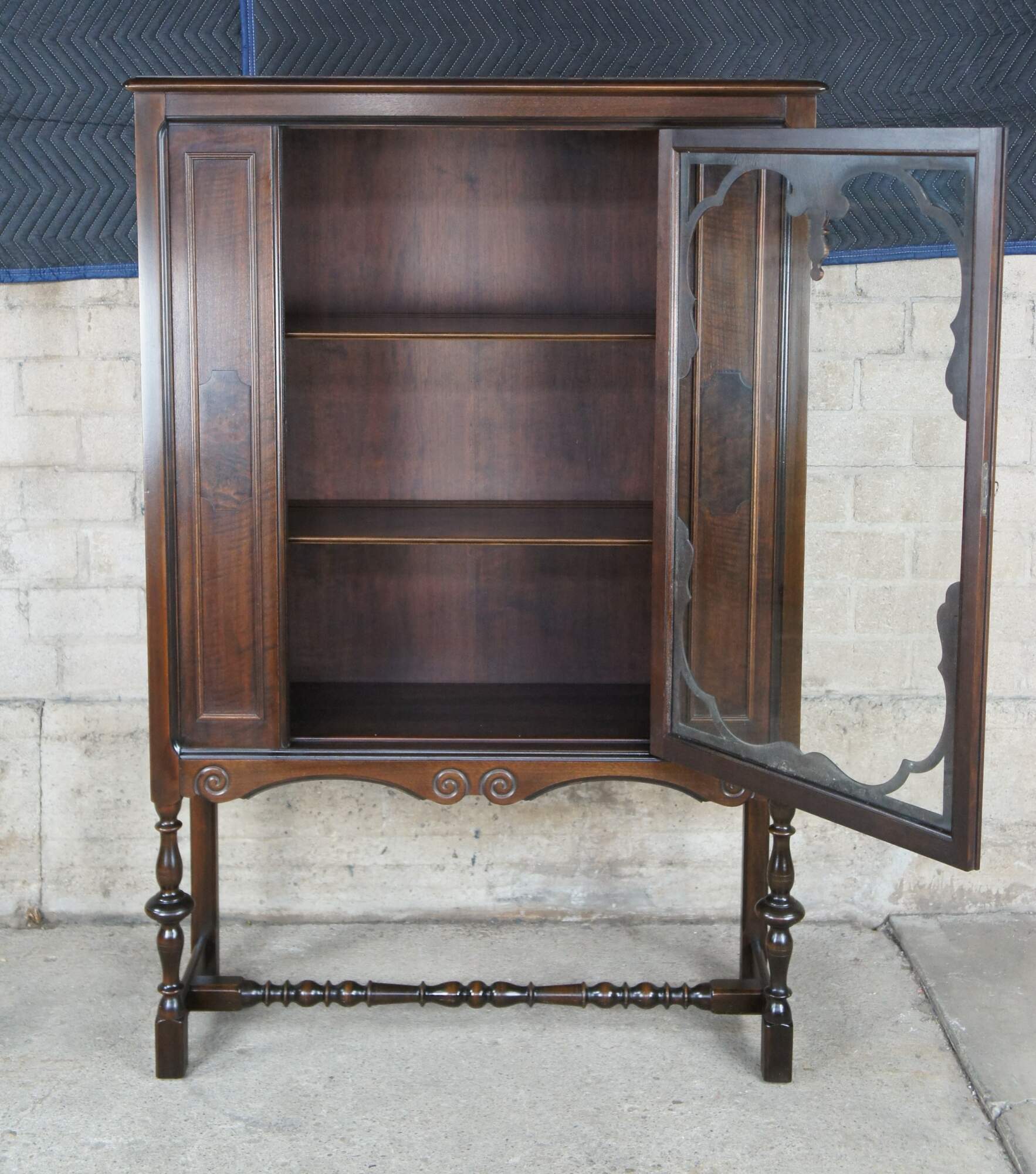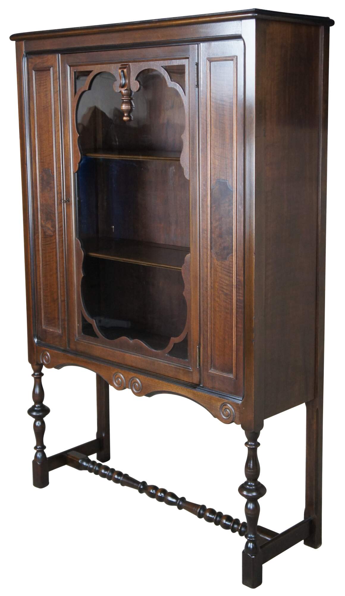 Antique Grand Rapids Chair Company China Display Cabinet, Hutch or Curio, circa 1910-20s. Drawing inspiration from William & Mary and Jacobean styling. A rectangular frame made from walnut with burled panels. Features a central lockable glass door trimmed with shapely molding along the corners and a downward quarter cut spindle at the center. Opens to two shelves with plate grooves. The cabinet is supported by tuned legs along the front and straight legs at the rear. The legs are connected by an H stretcher with beautifully turned trestle support. Originally purchased from Henshaws Furniture in Cincinnati, Ohio