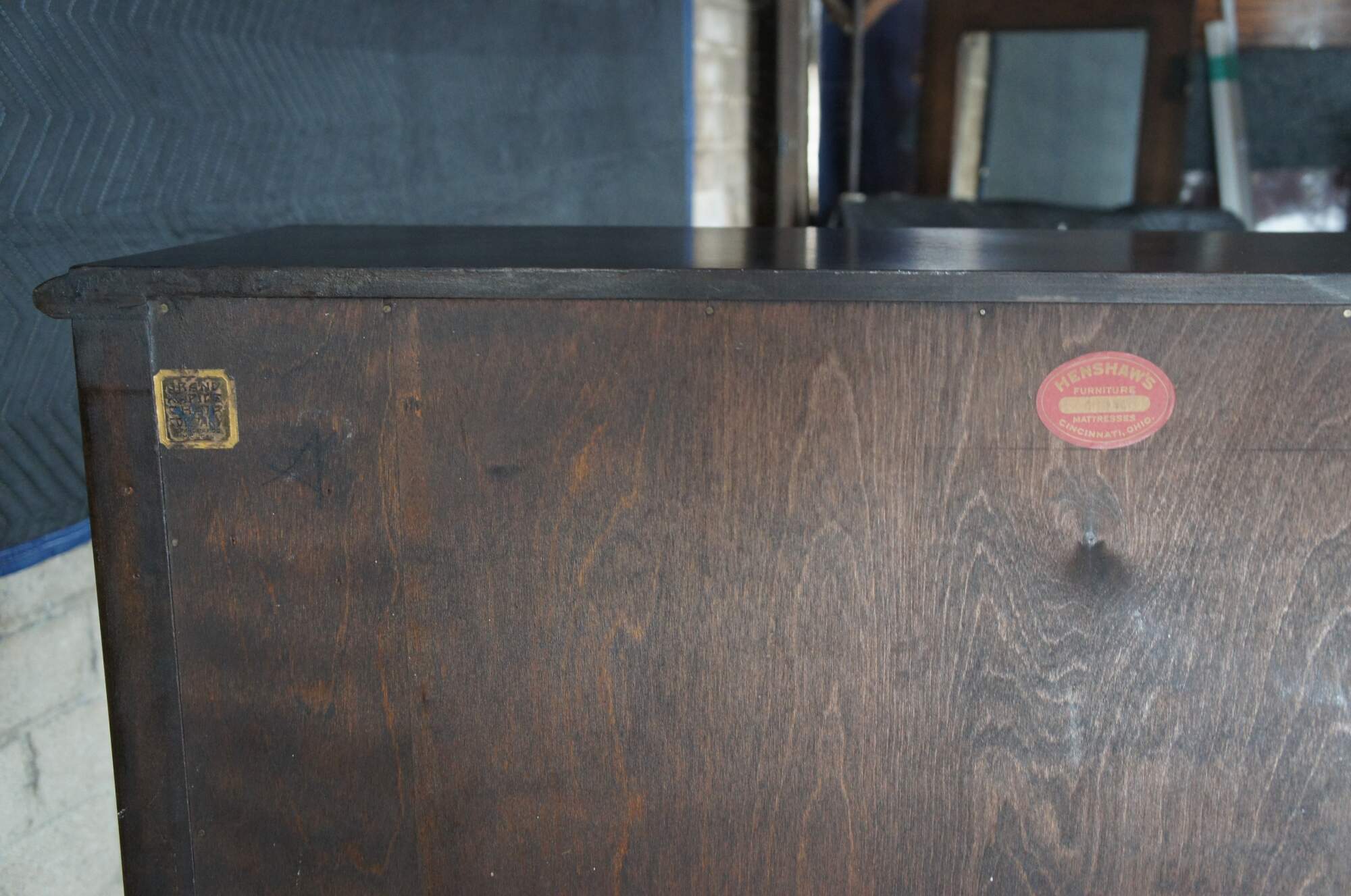 Early 20th-century ads show both Golden Oak case pieces with serpentine fronts and cabriole legs referencing French historical styles, as well as Mission oak pieces. A 1900 article also lists mahogany, birch, maple, and bird’s-eye maple in their lines. Ads from the 1910s and ‘20s show dining room furniture, living room, and hall furniture, and spinet desks in a wide range of period styles, including Spanish Renaissance, Spanish Gothic, Elizabethan, Jacobean, Georgian, Adam, and Early American. Favored woods were walnut and mahogany. A Tudor line called “Castle Oak” seems to have been a flagship product in the early twenties.