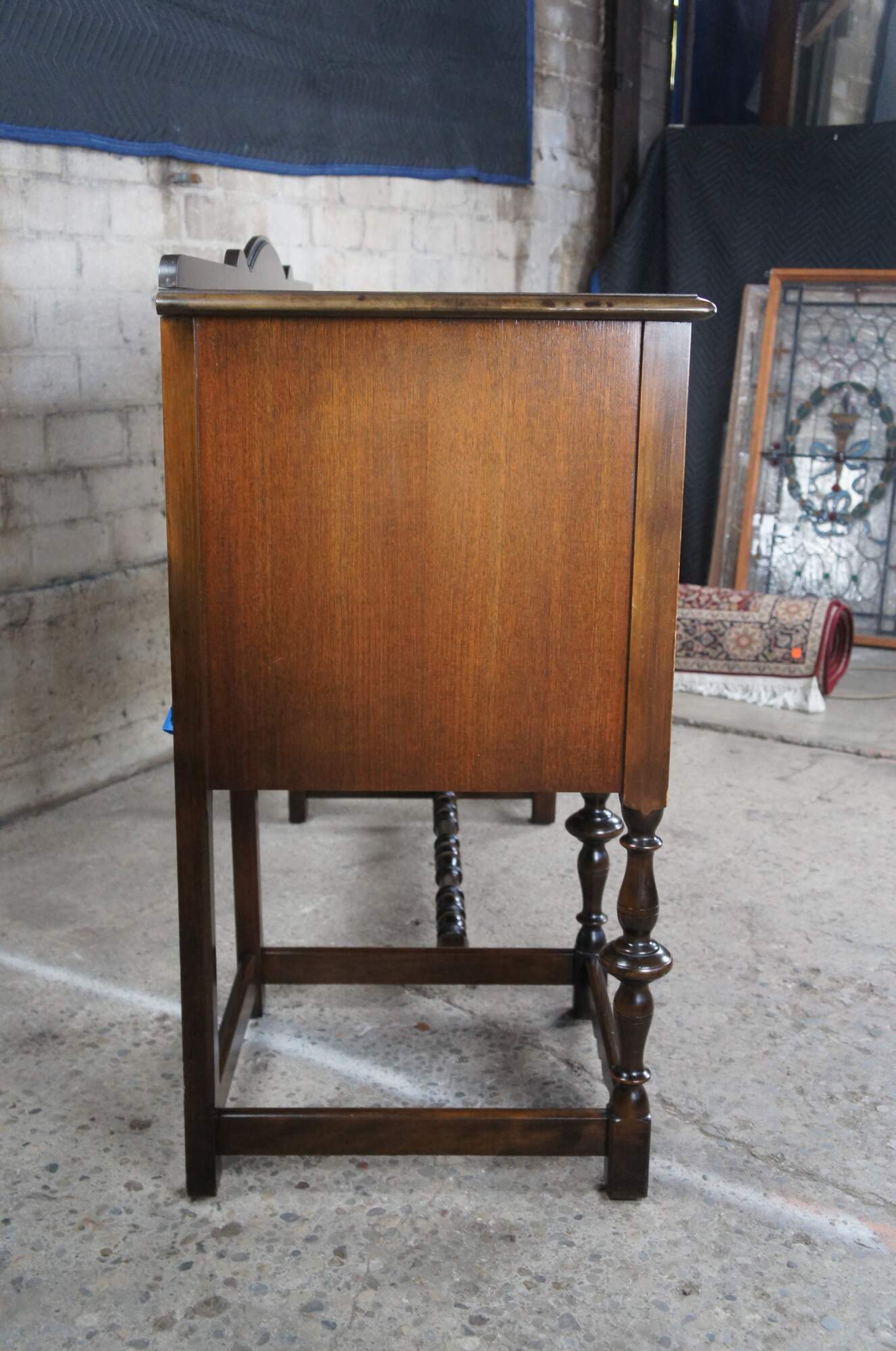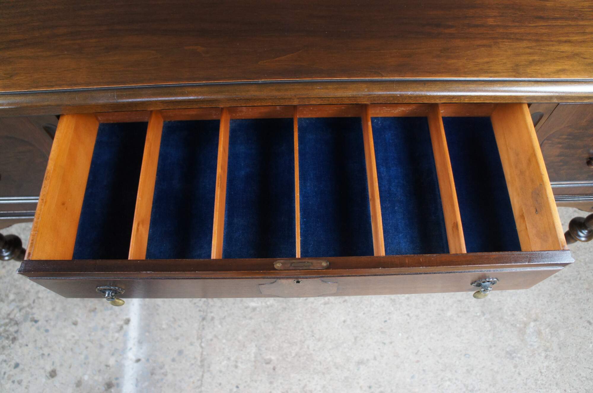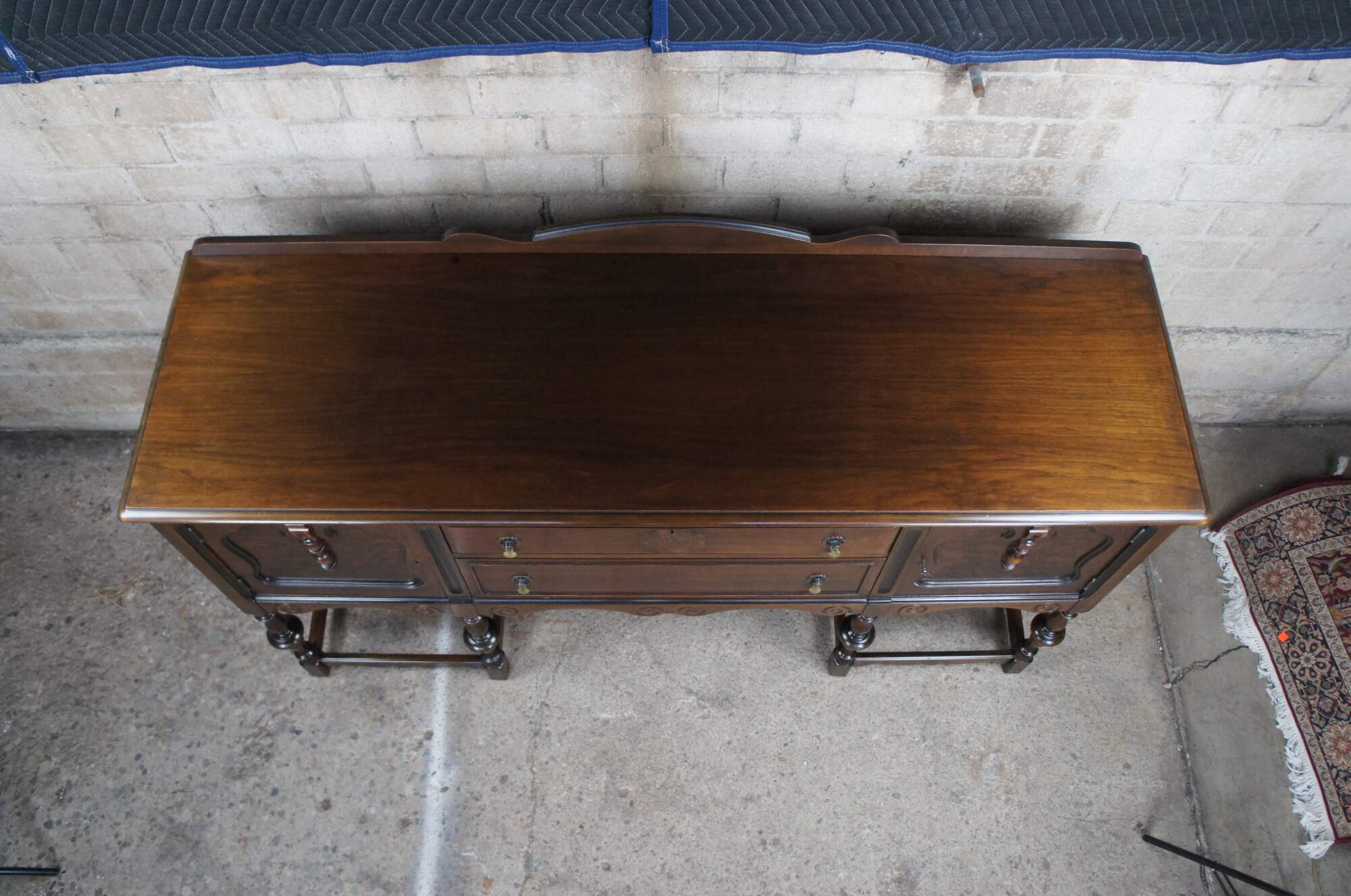 Grand Rapids Chair Company Antique Sideboard or Server, circa 1910-20s. Drawing inspiration from William & Mary and Jacobean styling. A rectangular frame made from walnut with burled panels. The buffet is centered by two dovetailed drawers with brass filigree teardrop pulls flanked by cabinets for accessory storage. Cabinet doors feature a beautiful burlwood recessed panel with quarter cut applied spindles. Front apron shows a crescent form with scrolled accents. The cabinet is supported by tuned spindles leading to two frames of joint legs connected by a central turned stretcher. Includes a felt lined divided drawer and removable backsplash. Originally purchased from Henshaws Furniture in Cincinnati, Ohio