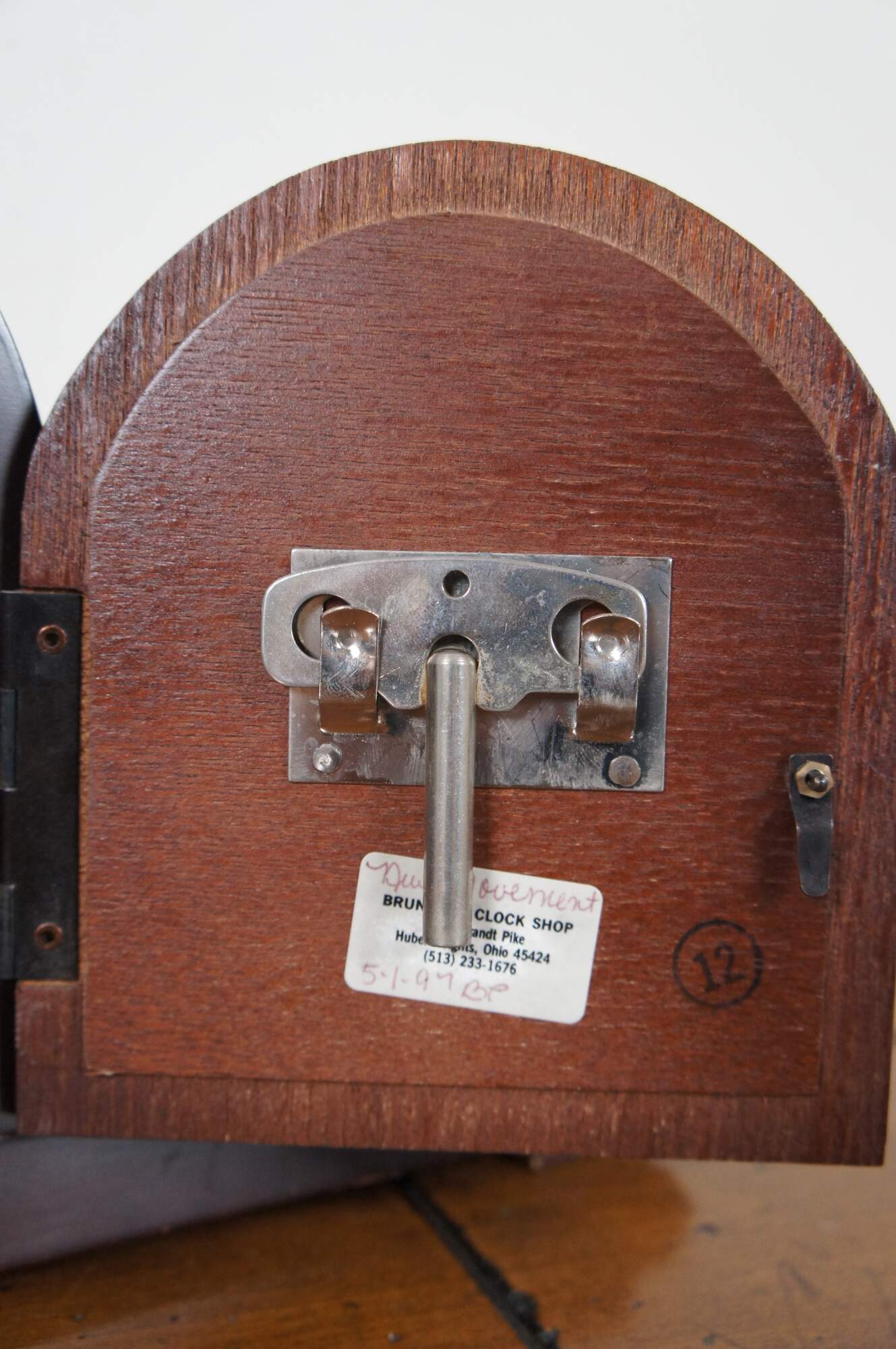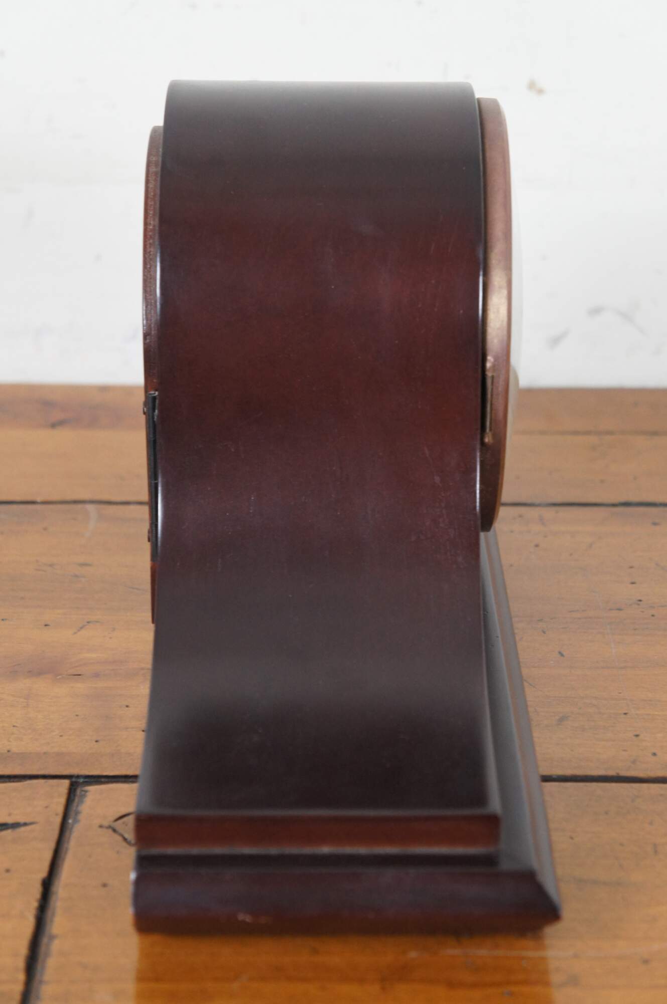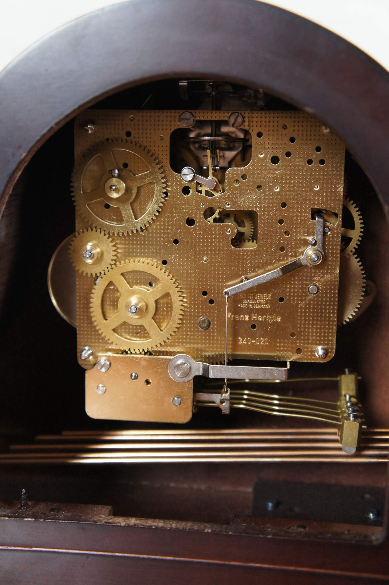 Vintage mahogany humpback chiming mantel clock by Welby (a division of Elgin) with Franz Hermle Two Jewel Unadjusted works, number 340-020.