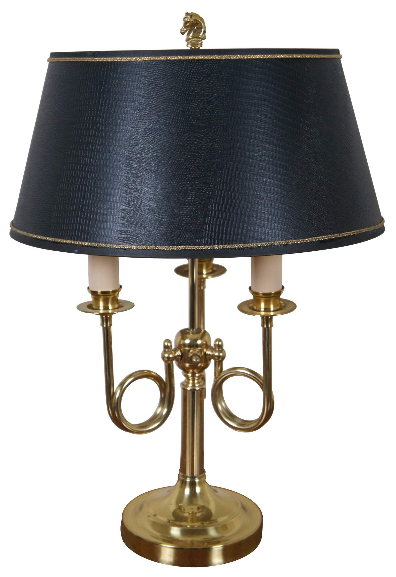 Vintage brass three light library bouillotte lamp featuring a equestrian / hunt theme with horn shaped arms holding candlesticks, faux snakeskin shade, and horse head finial.