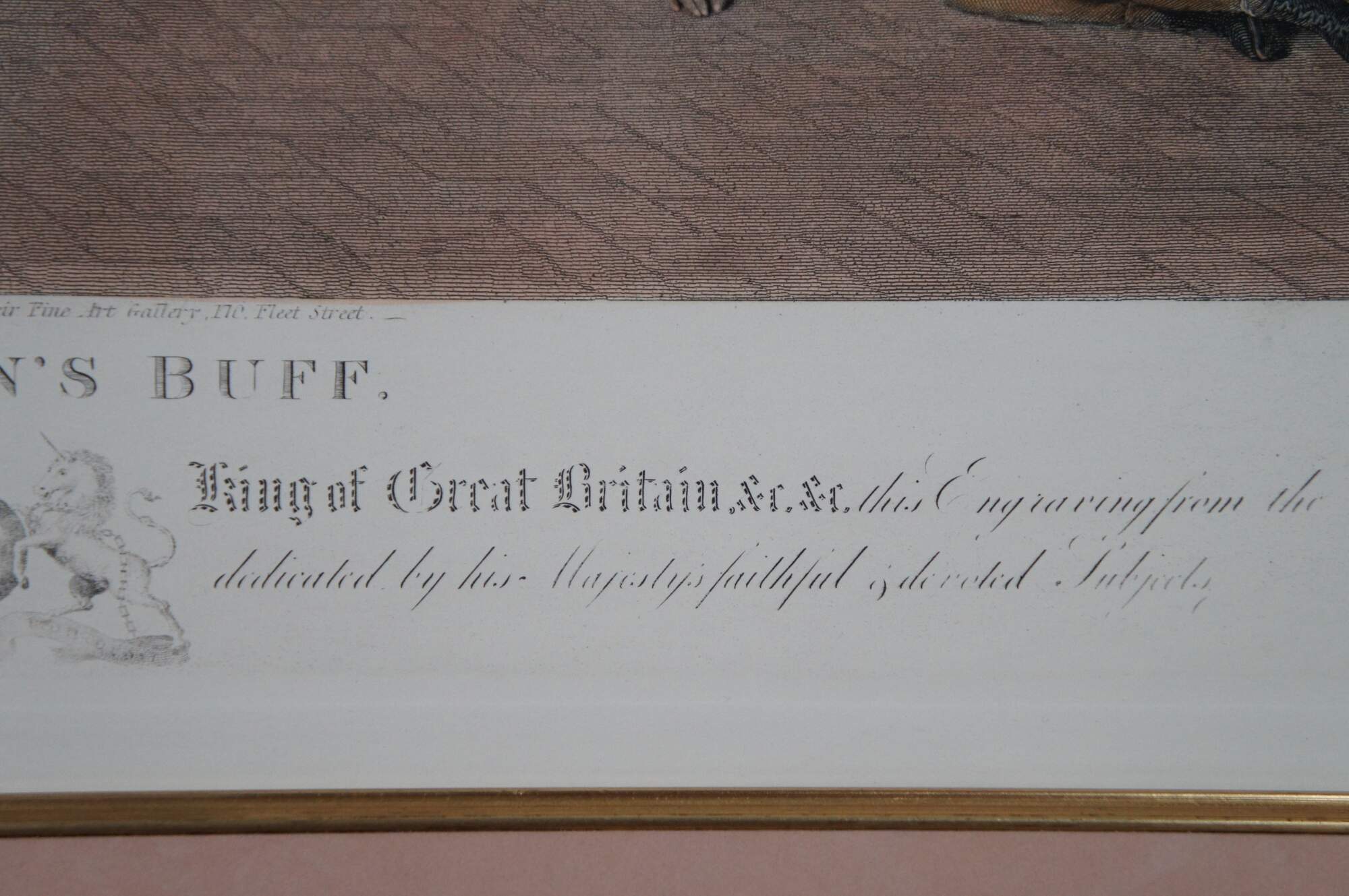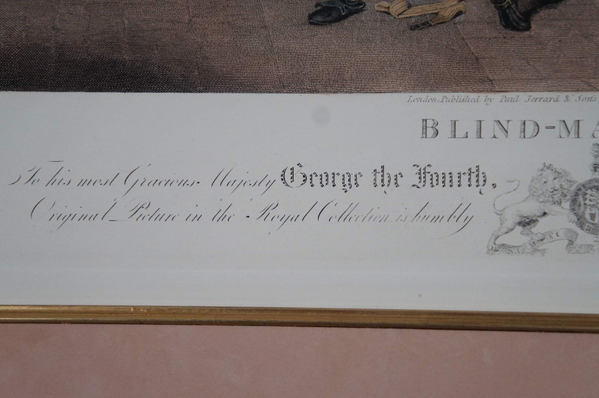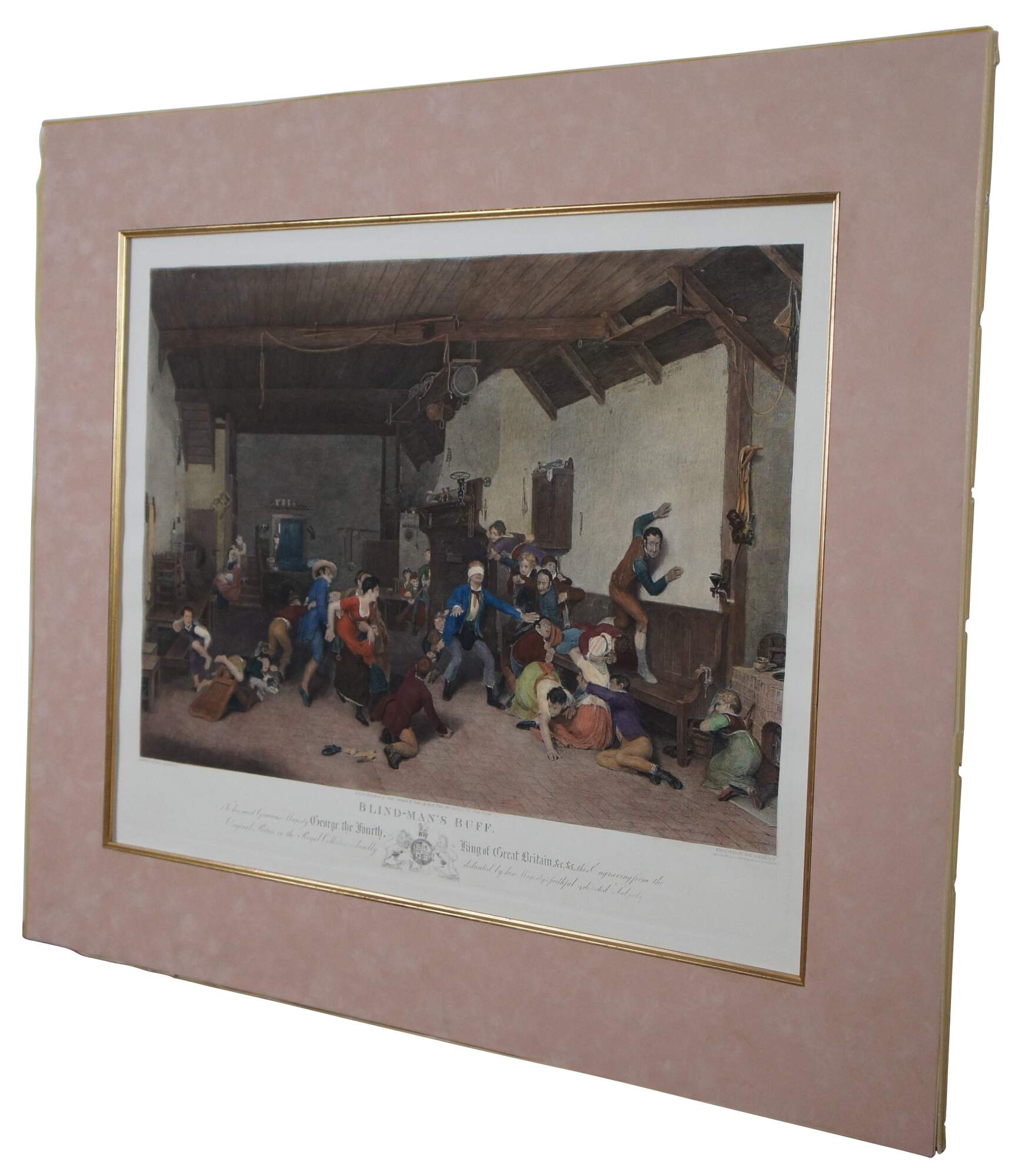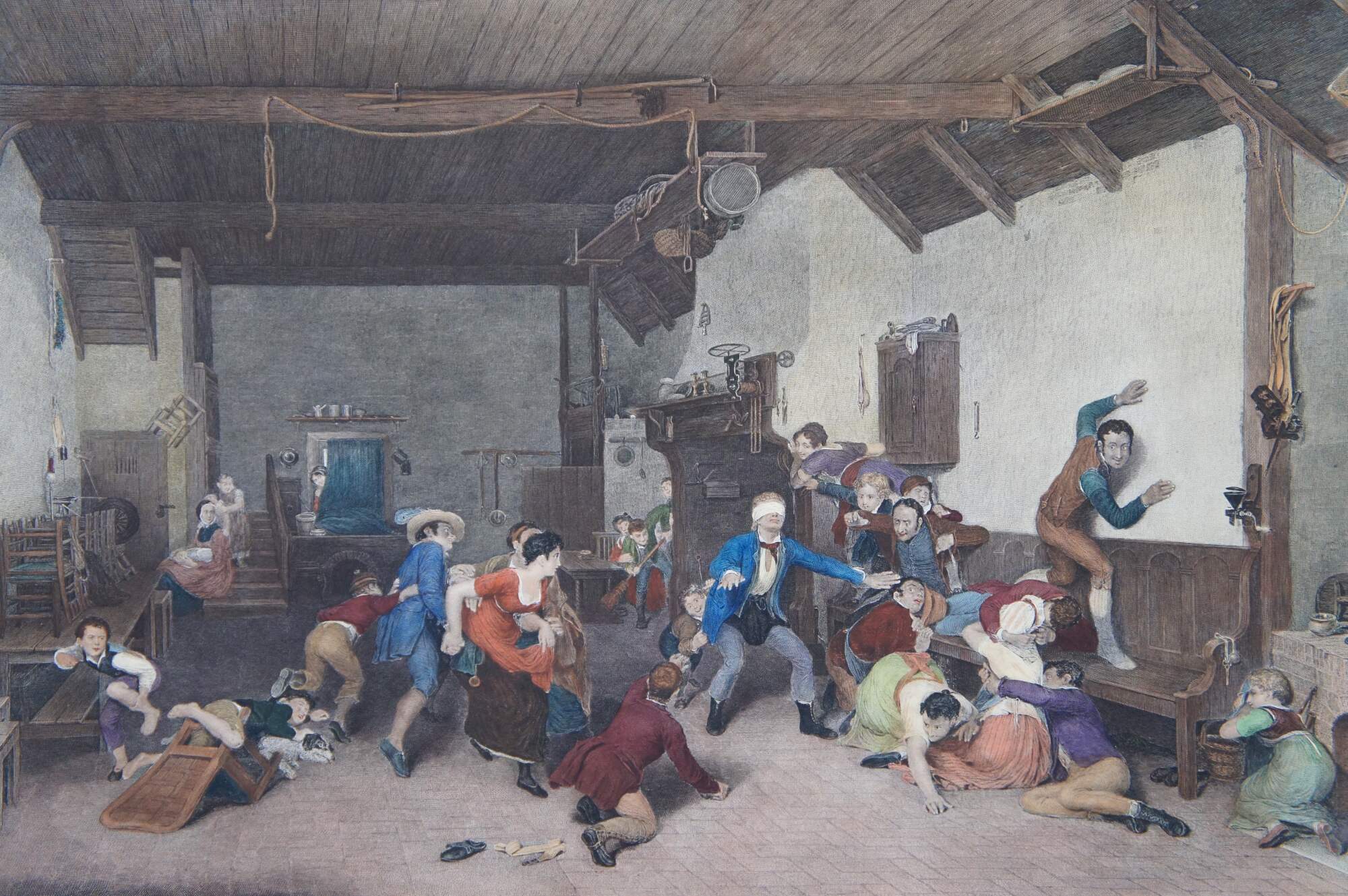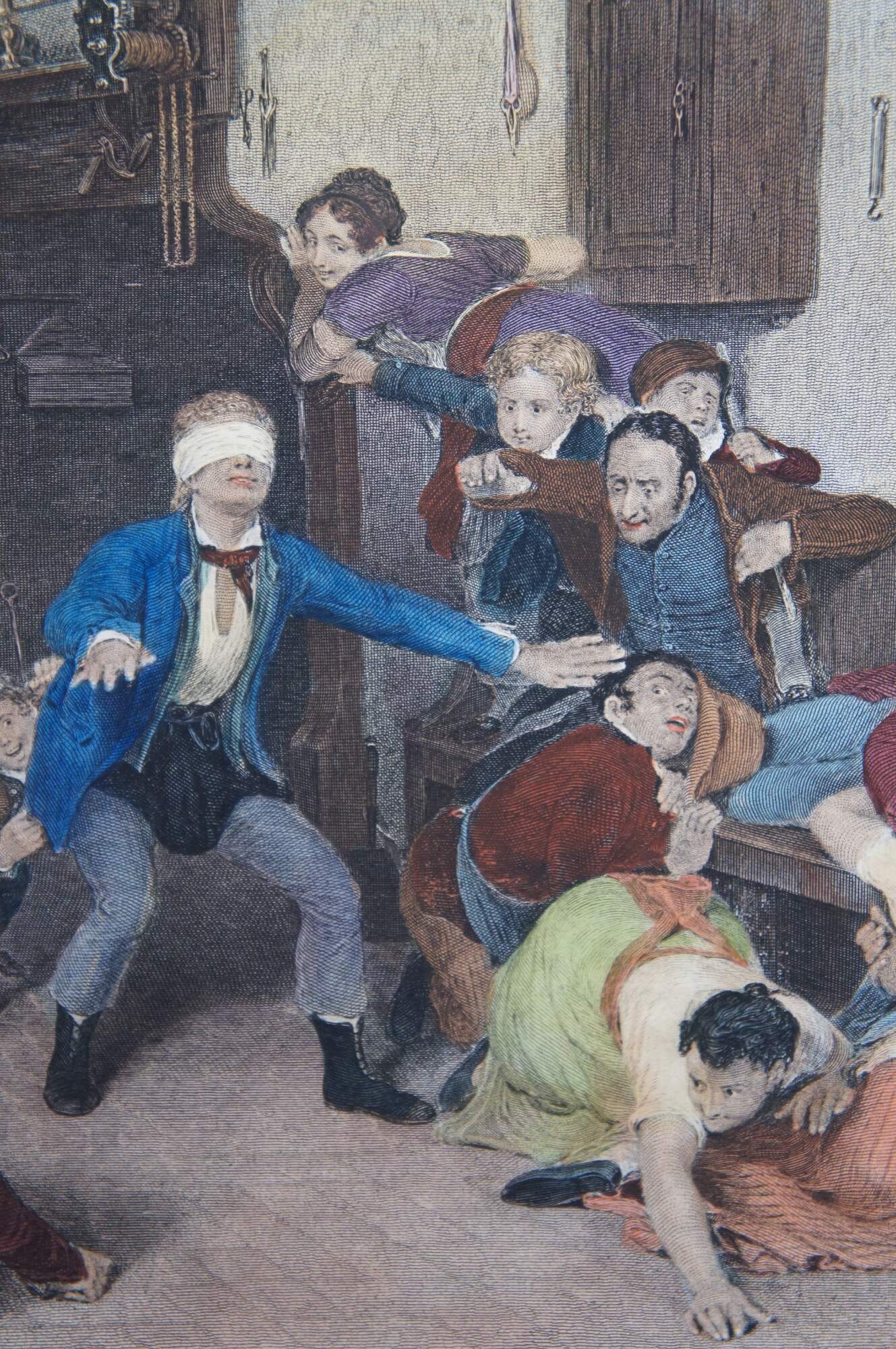 Antique hand colored engraving of “Blind Man’s Buff.” featuring a large game of hide and seek. Original painted by Sir David Wilkie 1812. Engraved by Abraham Raimbach 1822. London published by Paul Jerrard & Sons.