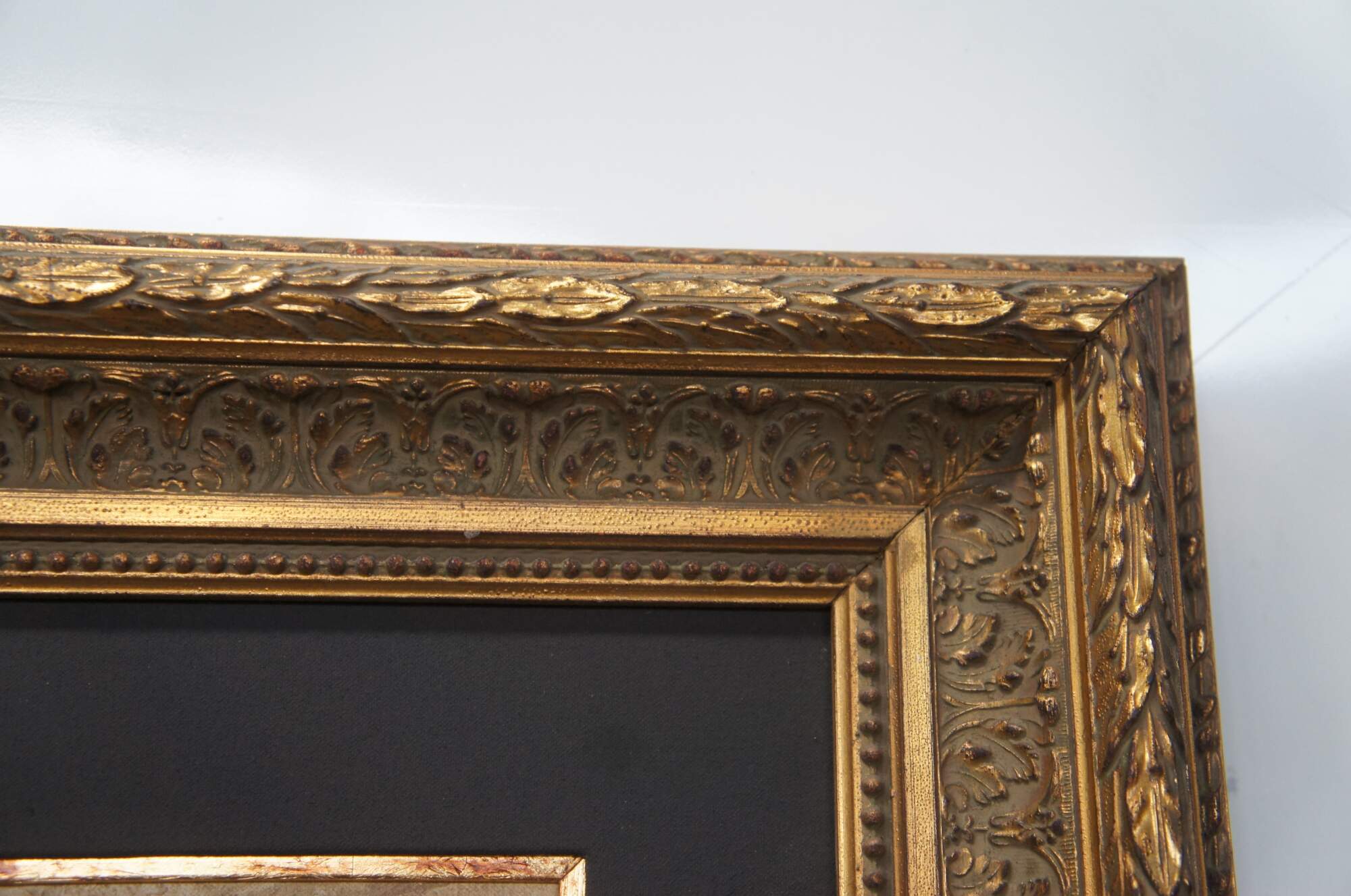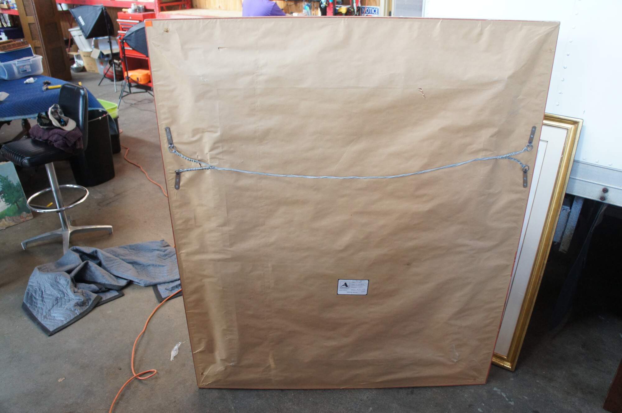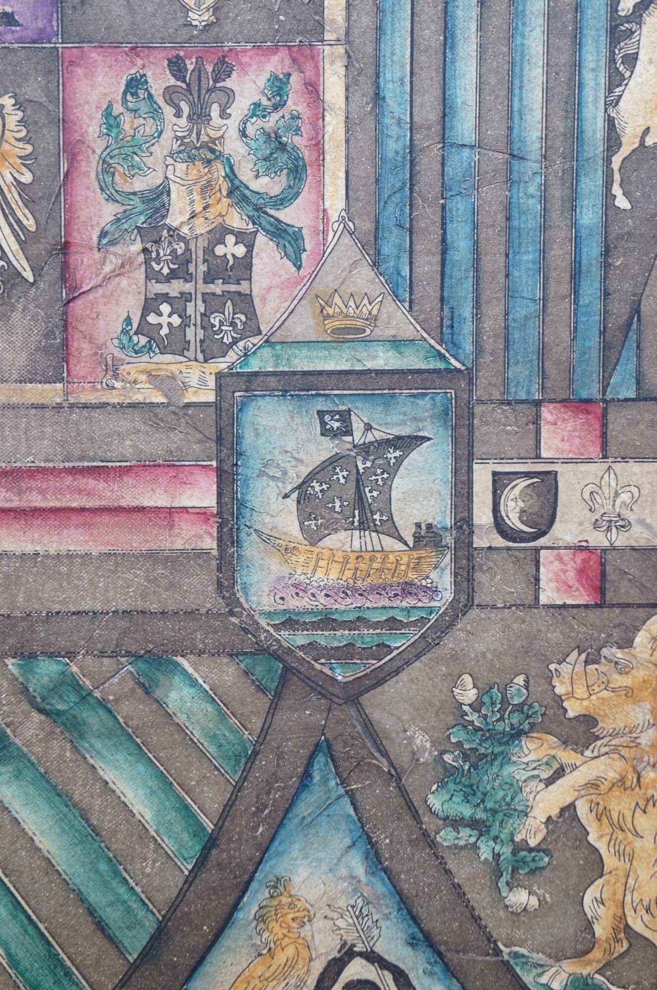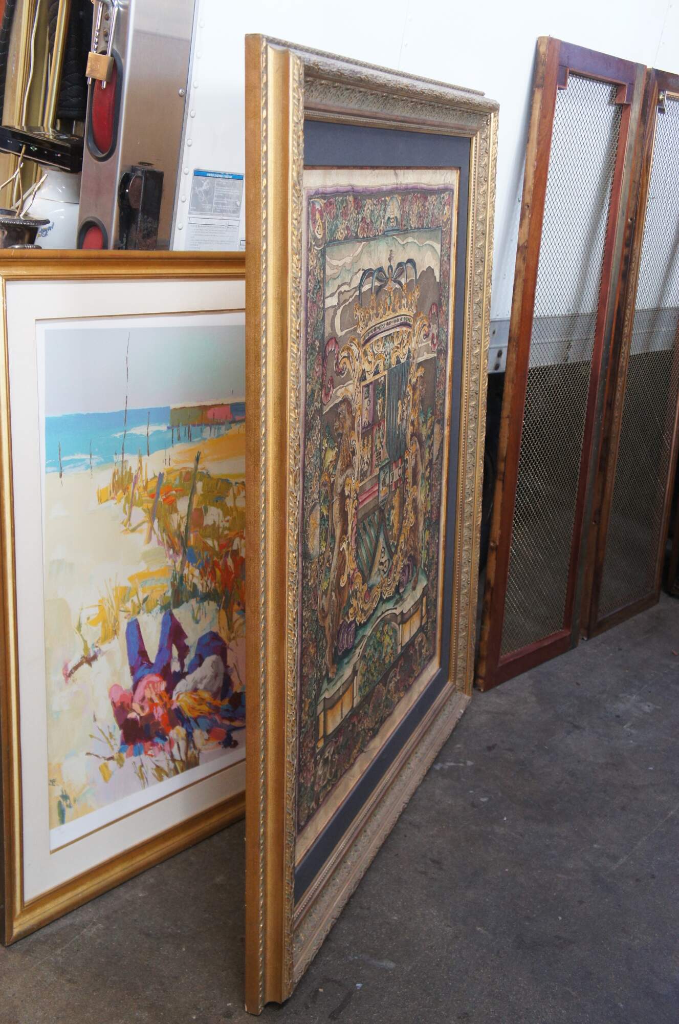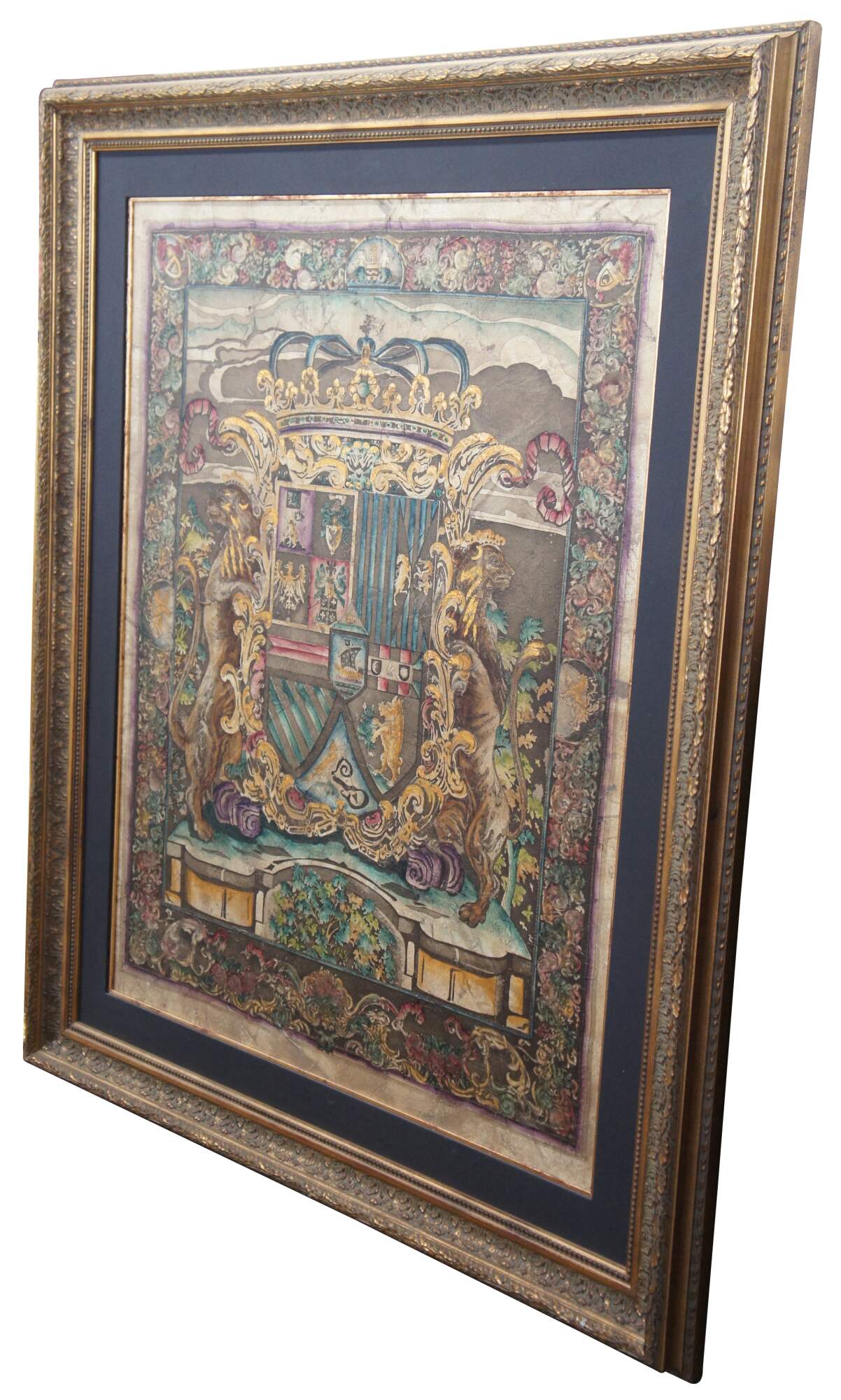 Buckingham Crest Etching on Canvas by Liz Jardine, circa 1992. A large format art with an amazing frame. Features a heraldic crest or shield at the center surrounded by lions with crowns. The crest has various crests within it and includes a phoenix, dragon, boar, boat, goat and bird. Etching on cotton canvas, includes COA.