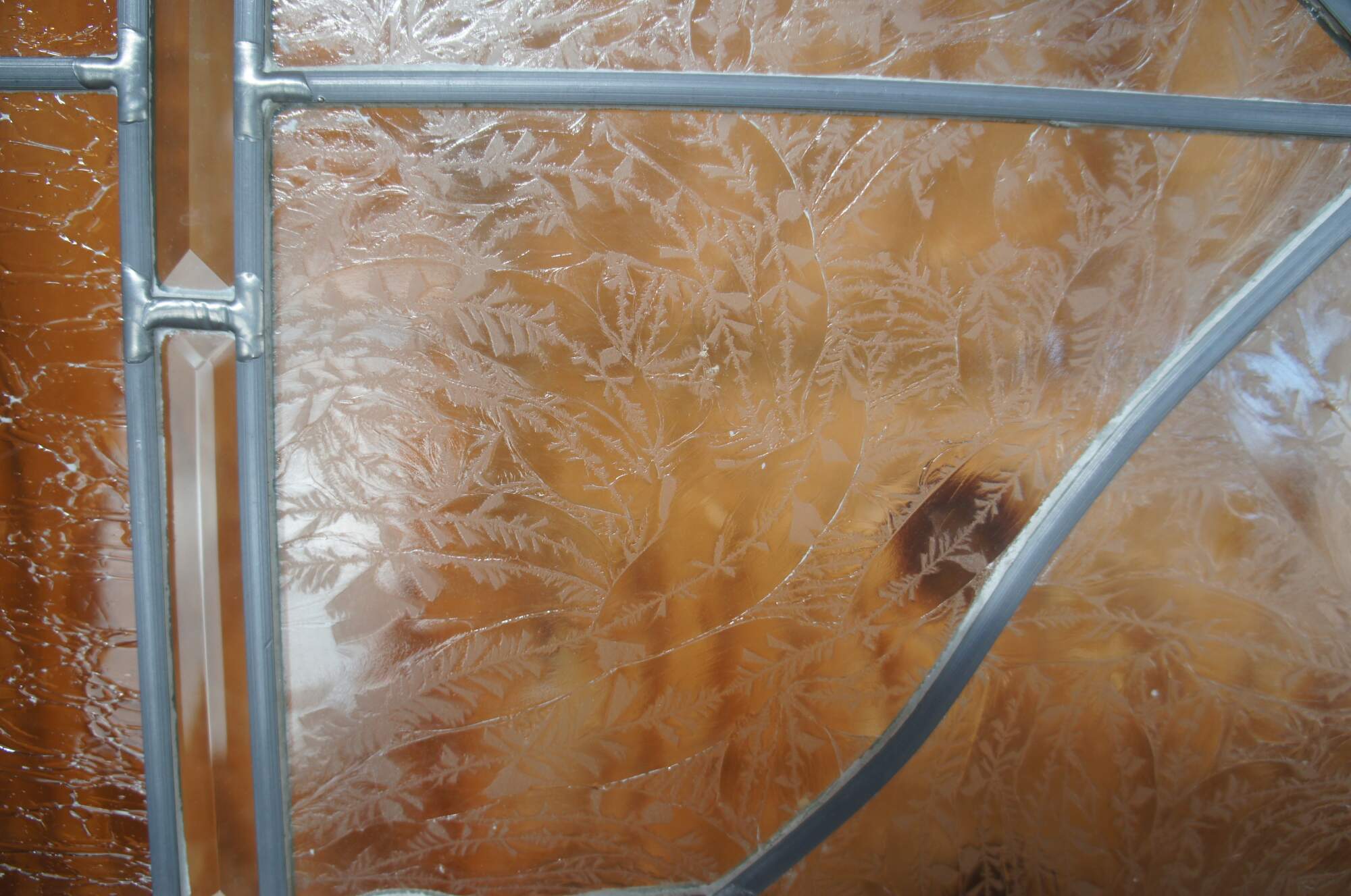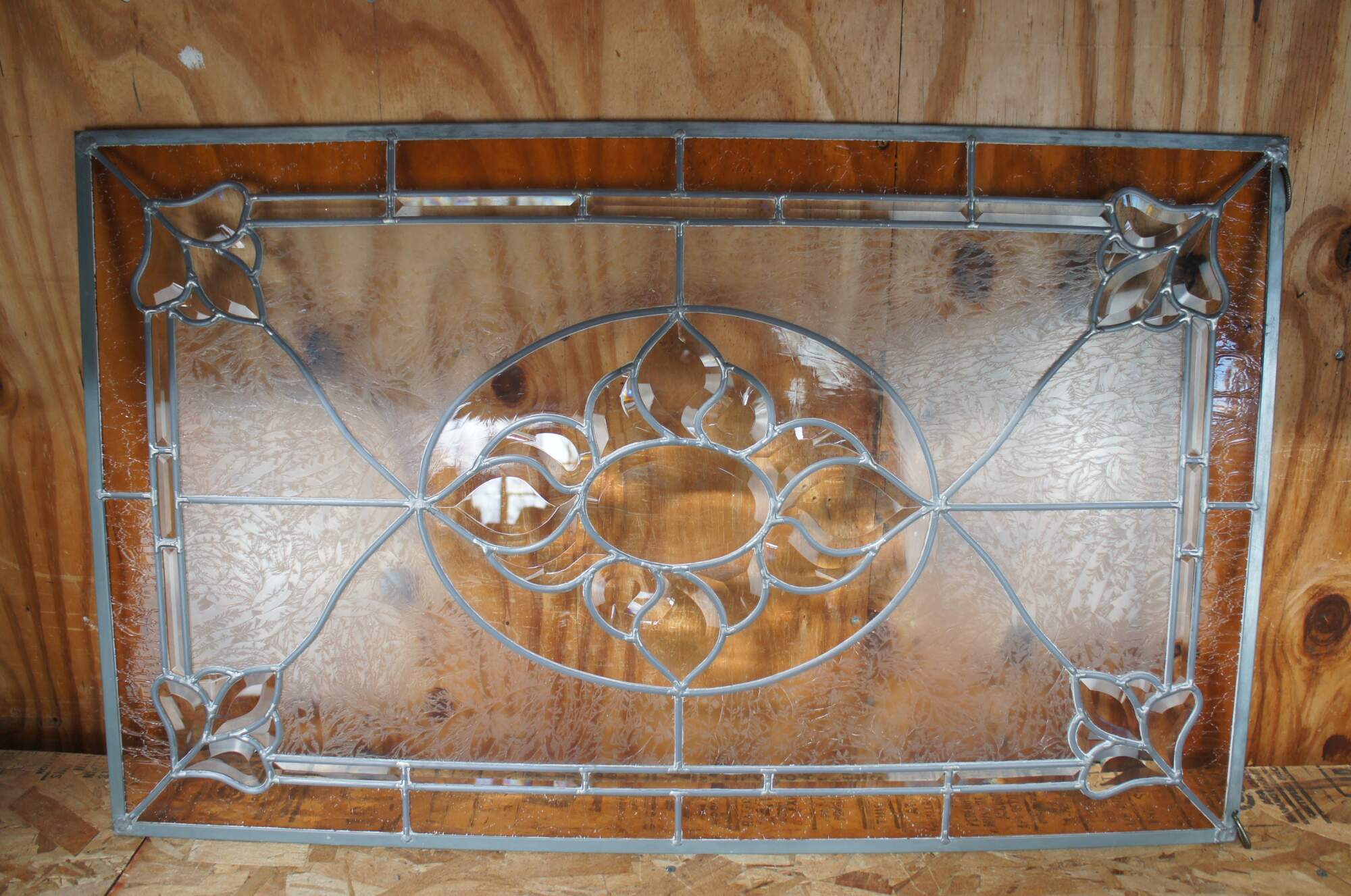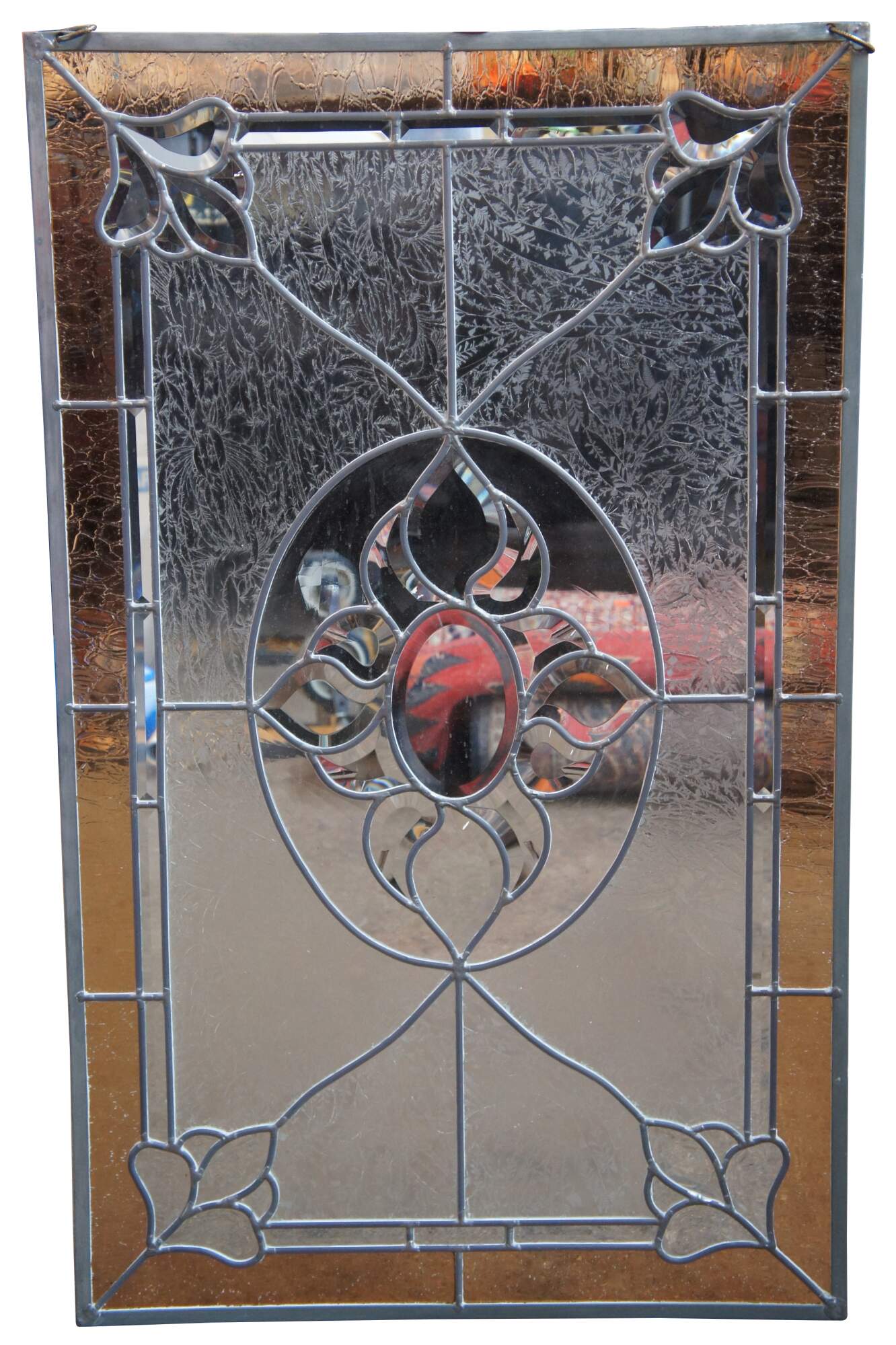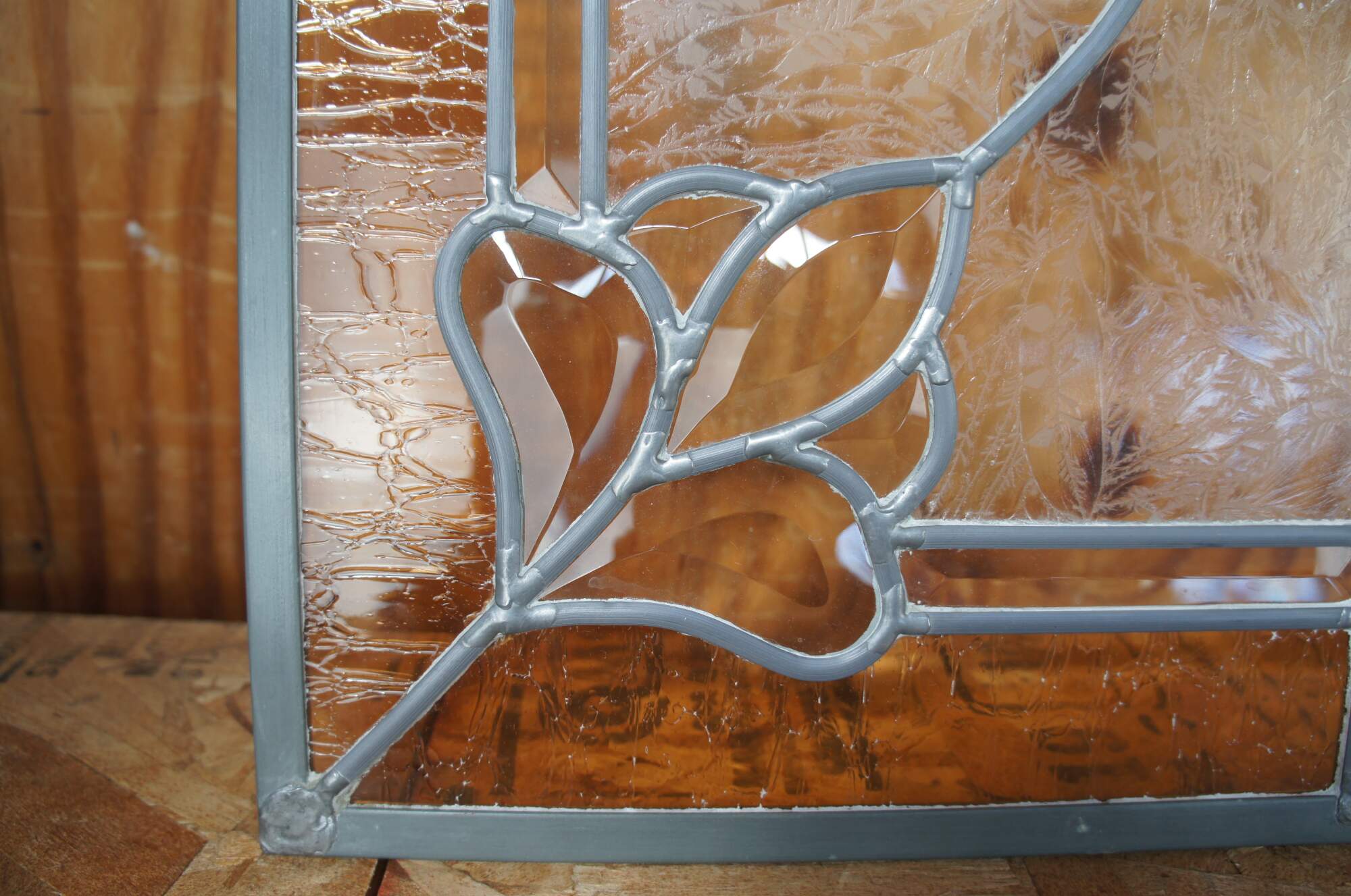 A beautiful textured and beveled leaded stained glass hanging panel. Features an amber border with pendeloques along the corners leading towards a geometric center. Elegant and clean lines will bring warmth to any room.