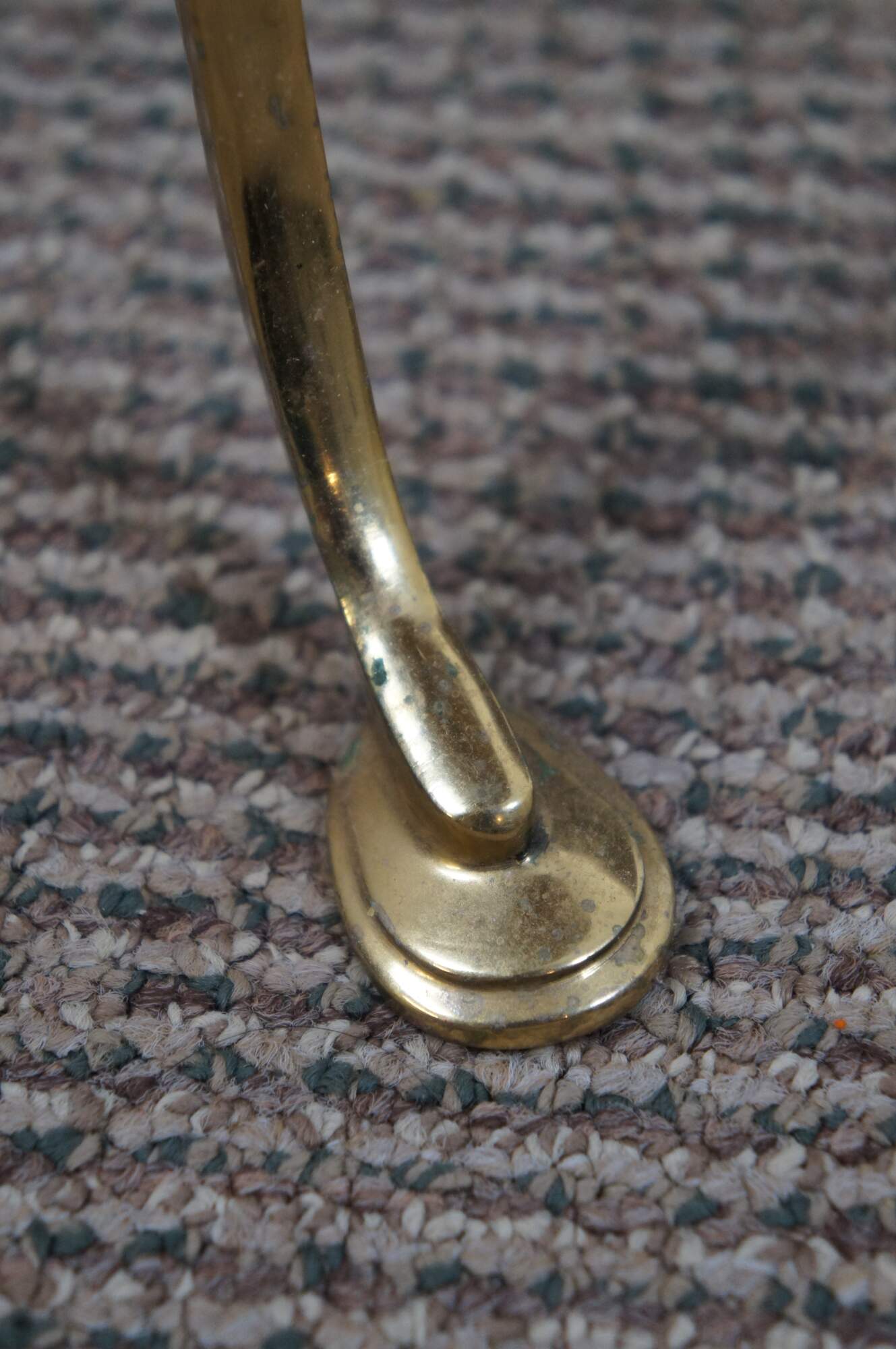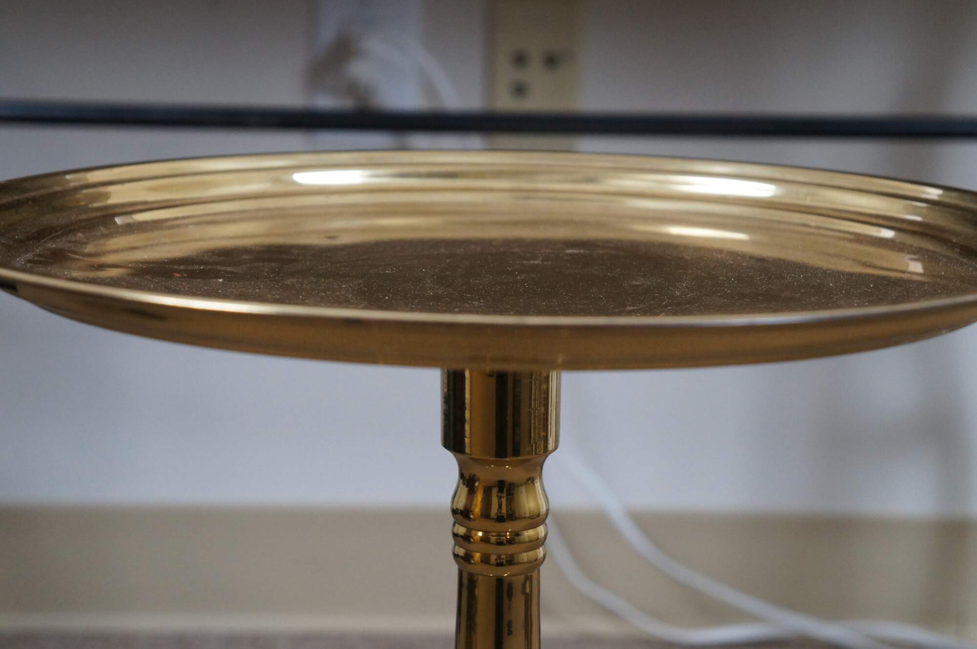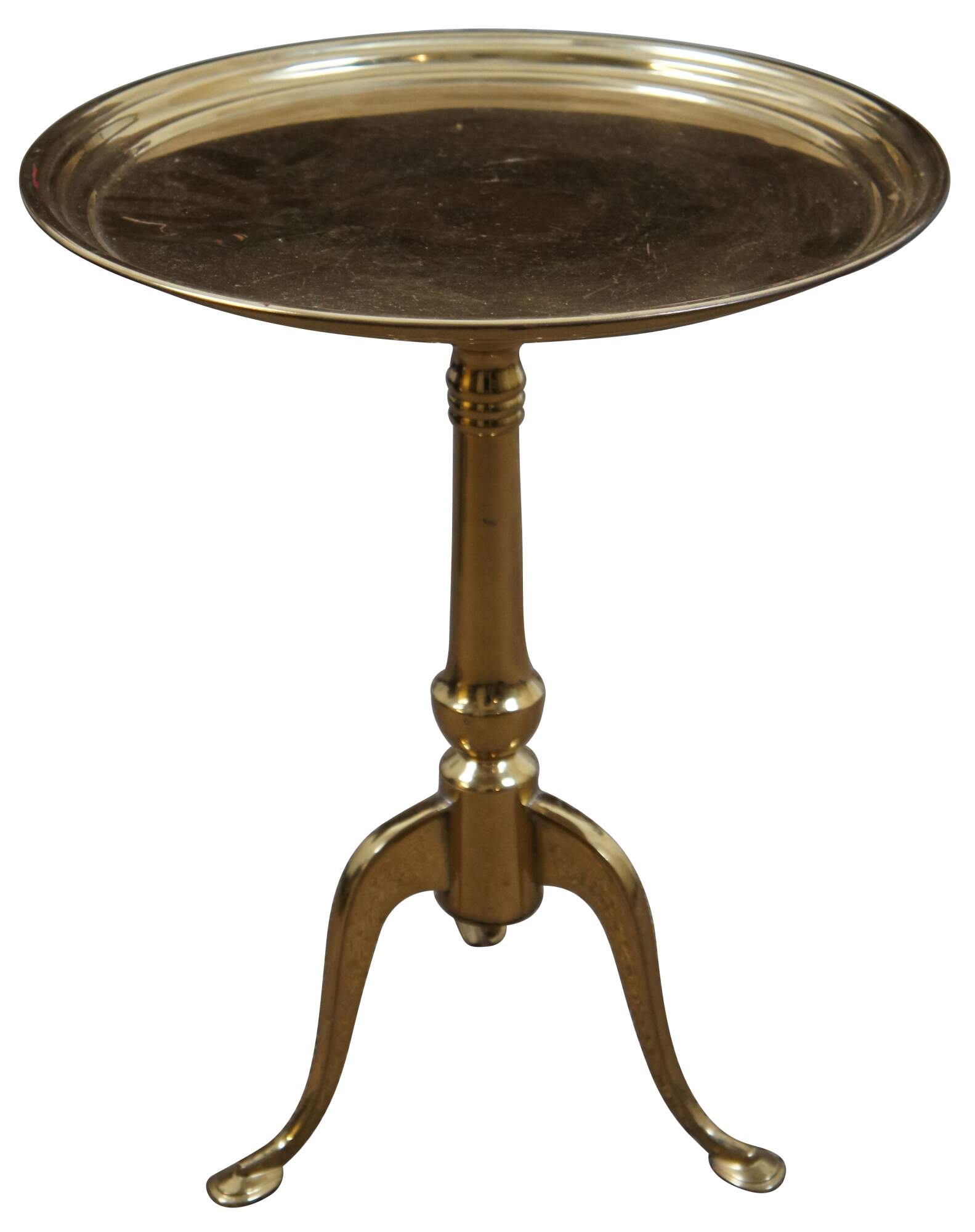 Vintage late 20th century round brass butler tray table or plant stand with raised edge around the top, turned pedestal base and three cabriole feet. 42-1533.