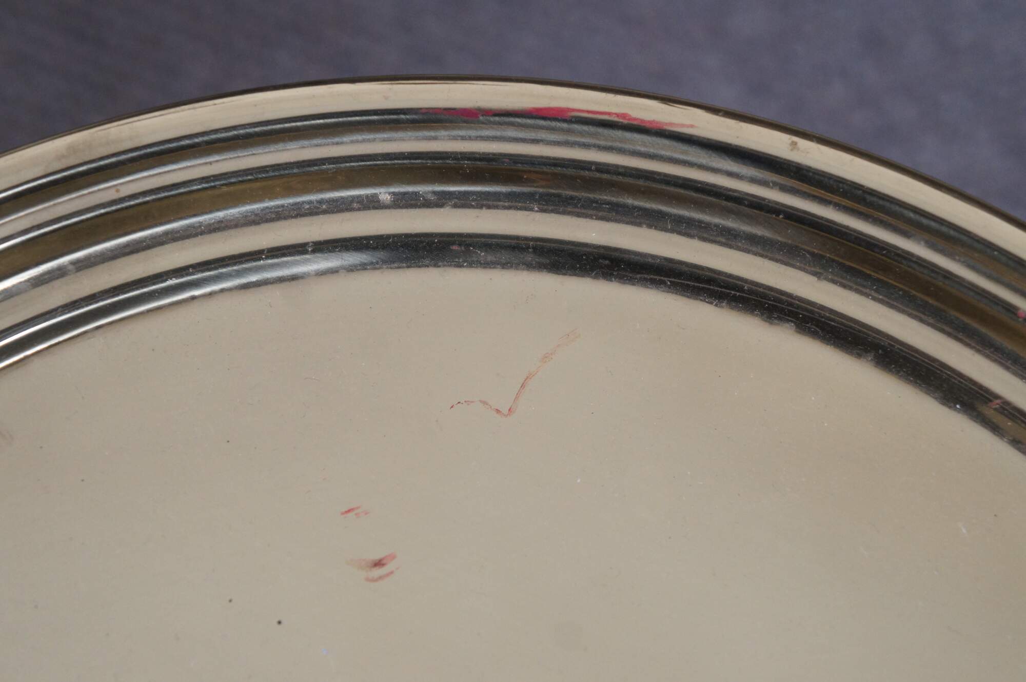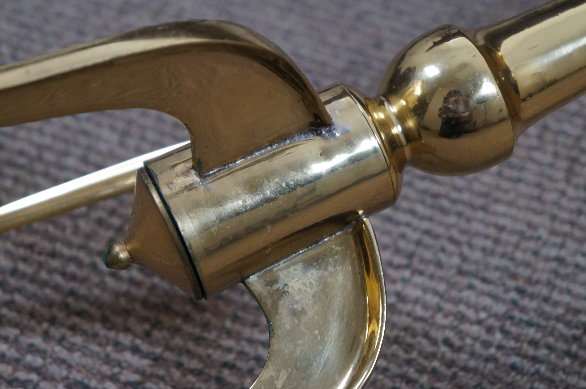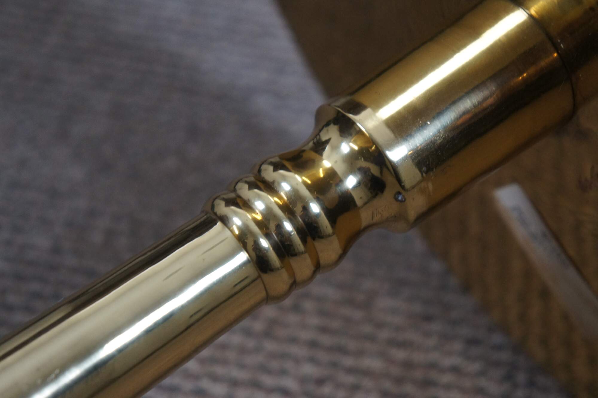 Vintage late 20th century round brass butler tray table or plant stand with raised edge around the top, turned pedestal base and three cabriole feet. 42-1533.