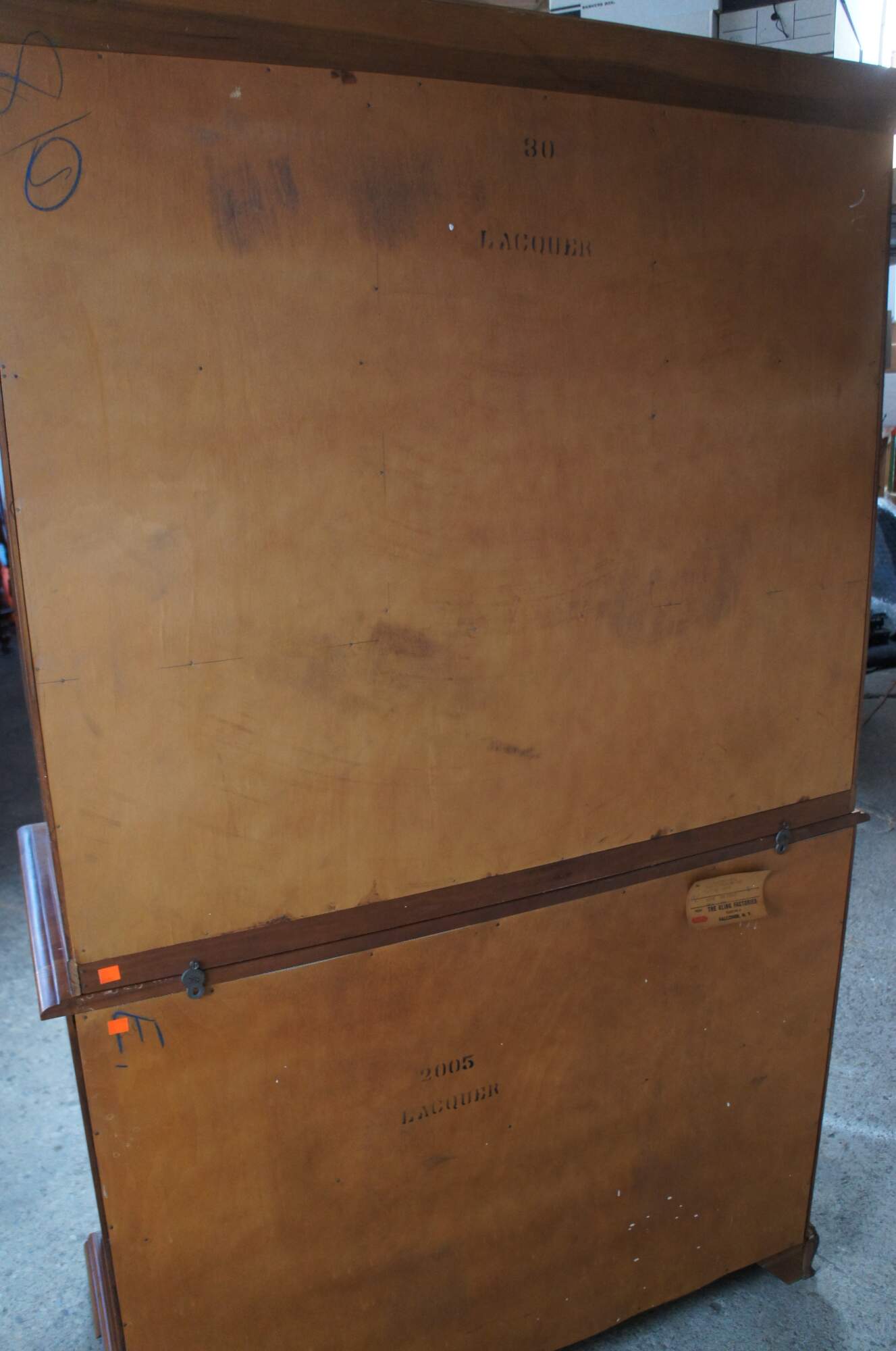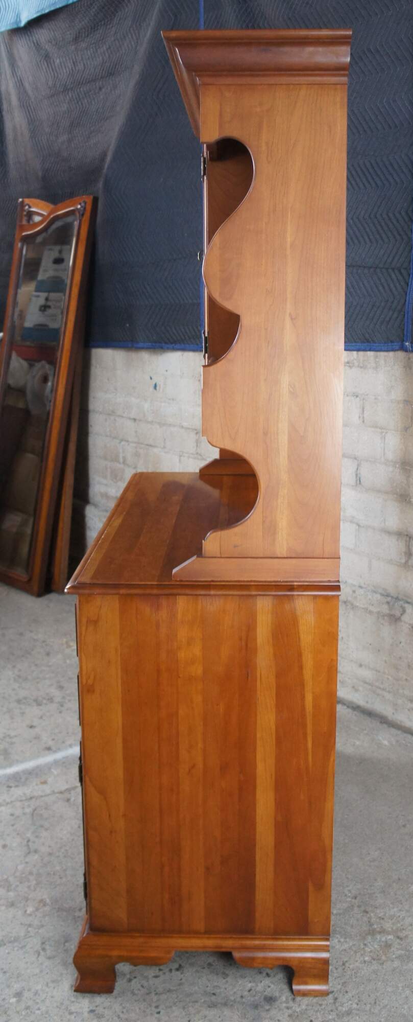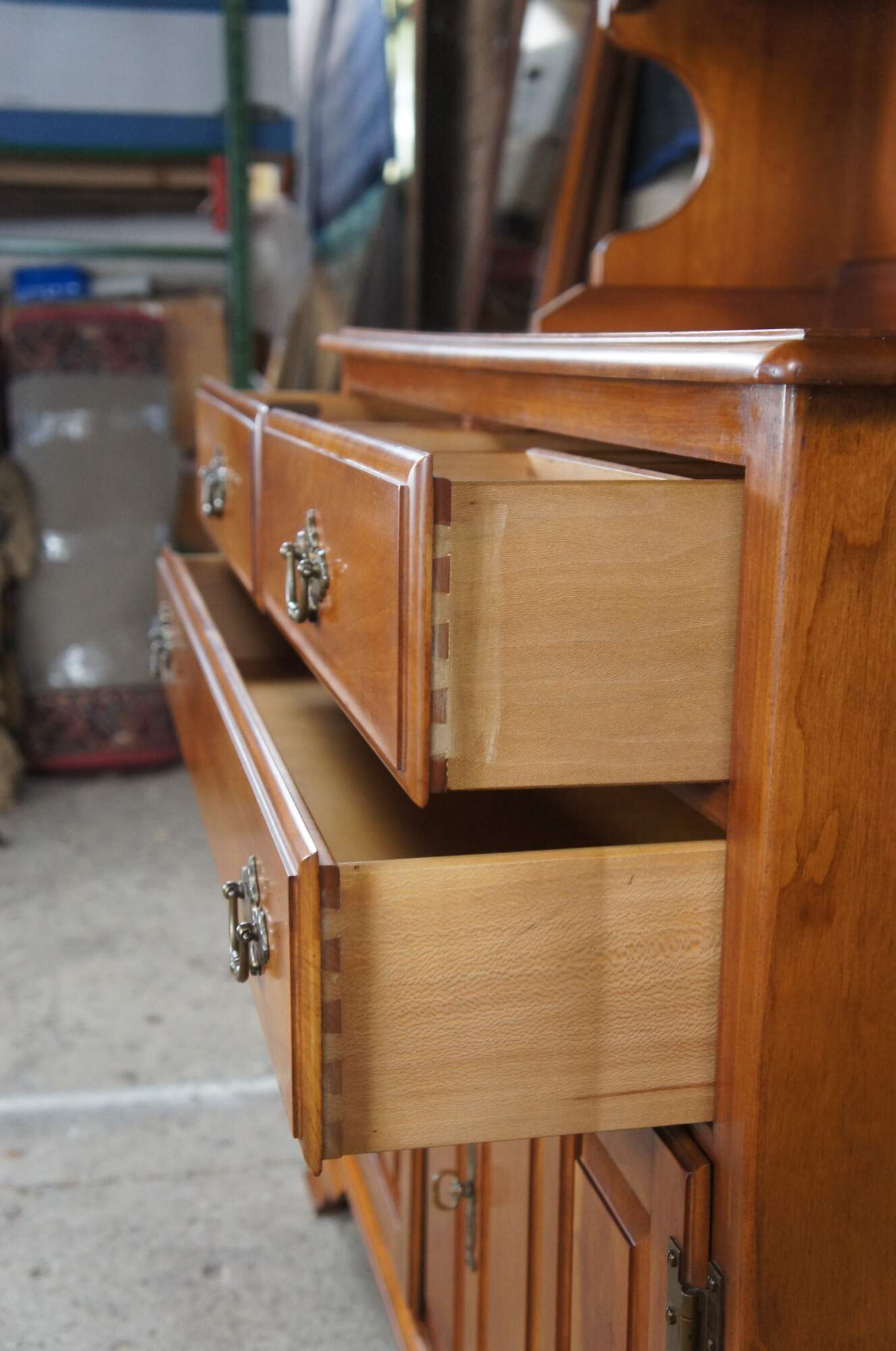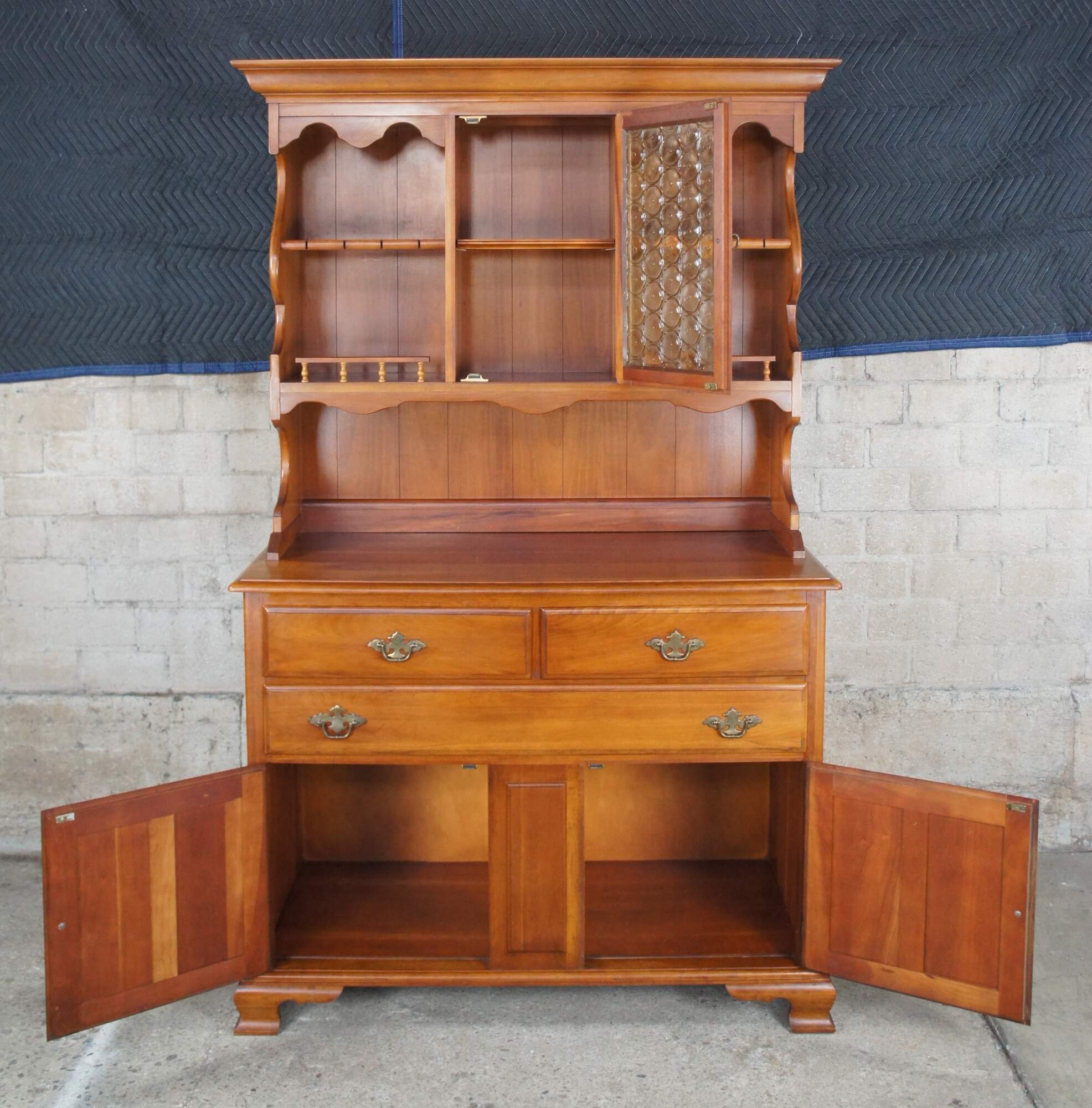 Circa 1960s Kling Furniture Colonial Hutch. Made from cherry with brass hardware. Features a three drawer server with lower cabinet for storage and upper hutch with central compartment flanked by stemmed glassware hangers. The upper hutch has a serpentine form with an upper arcade and central bottle glass window panel. The cabinet is supported by bracket feet.
