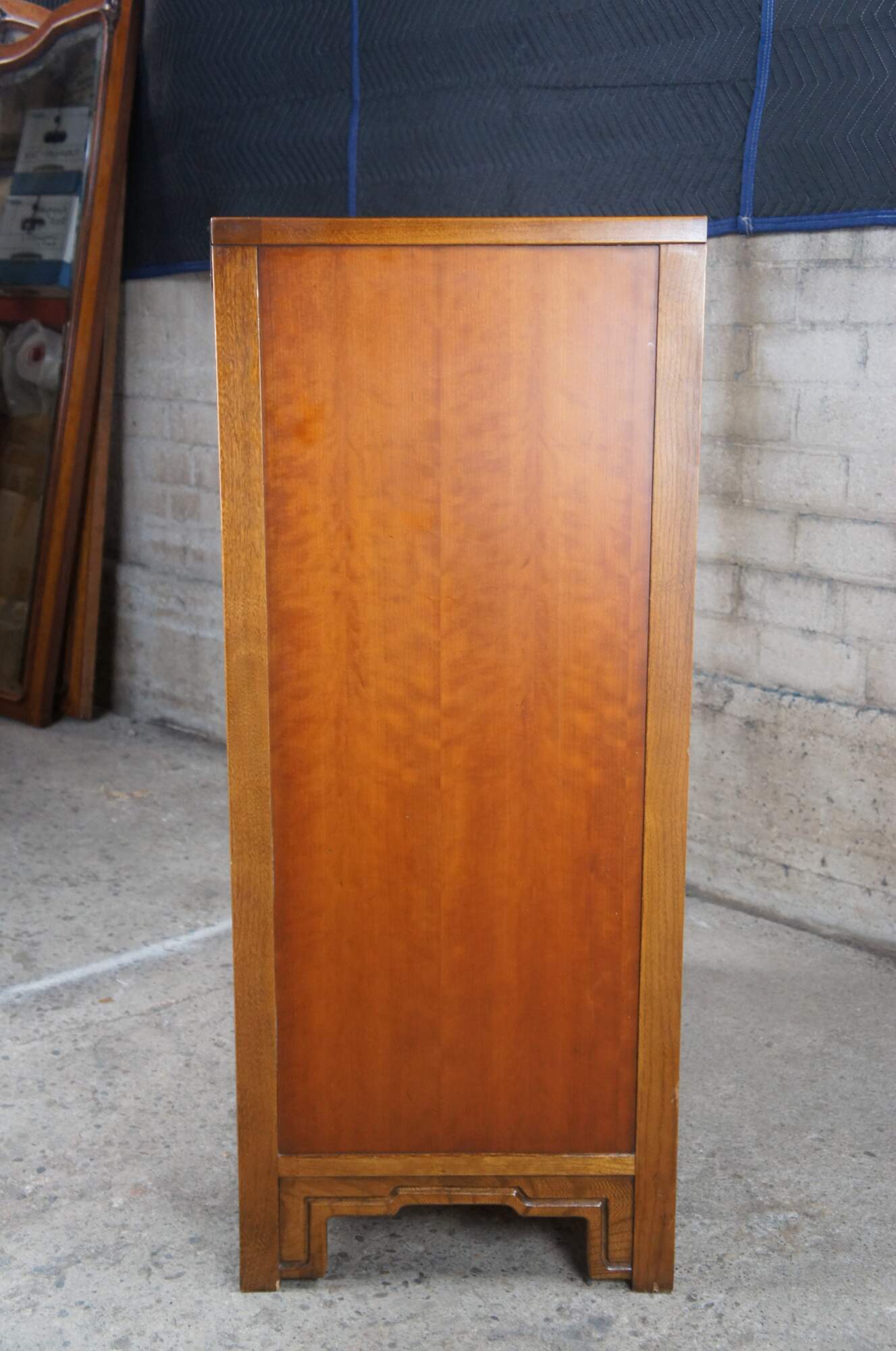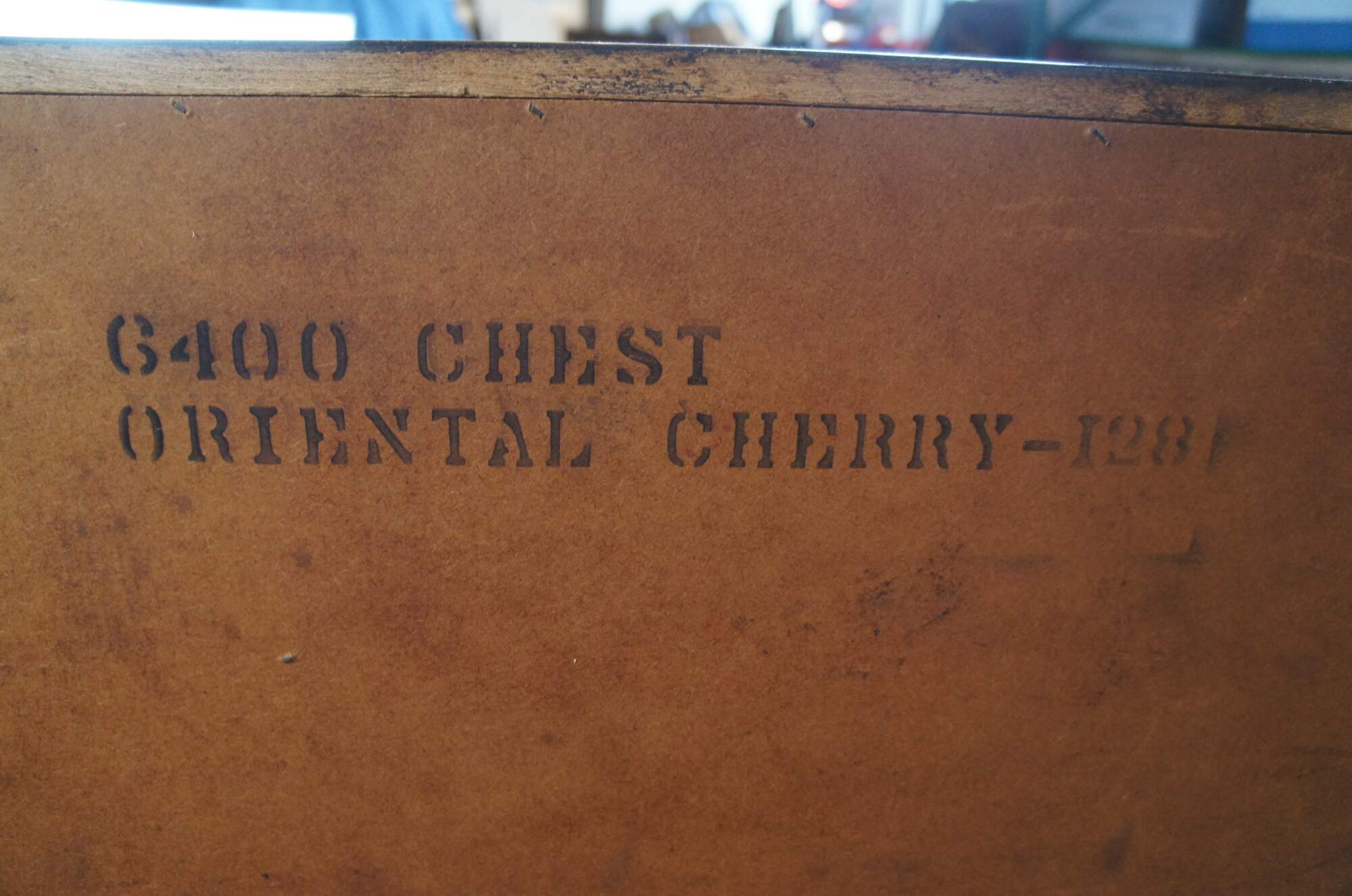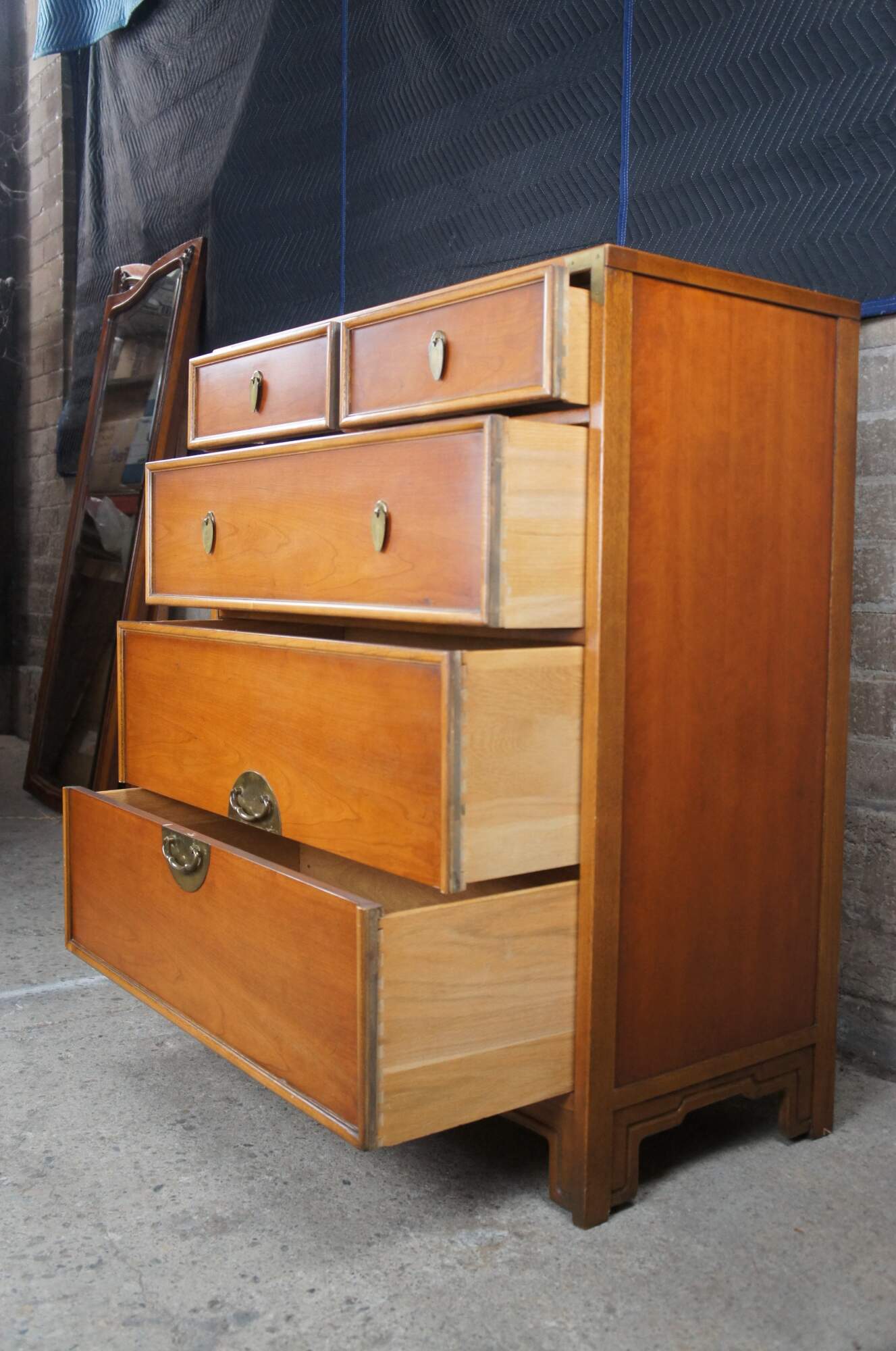 A beautiful highboy or chest of drawer from the "The Lotus" collection by Kent Coffey. Made from cherry with brass accents. Features 5 dovetailed drawers. Finished in Oriental Cherry. Circa 1960s.