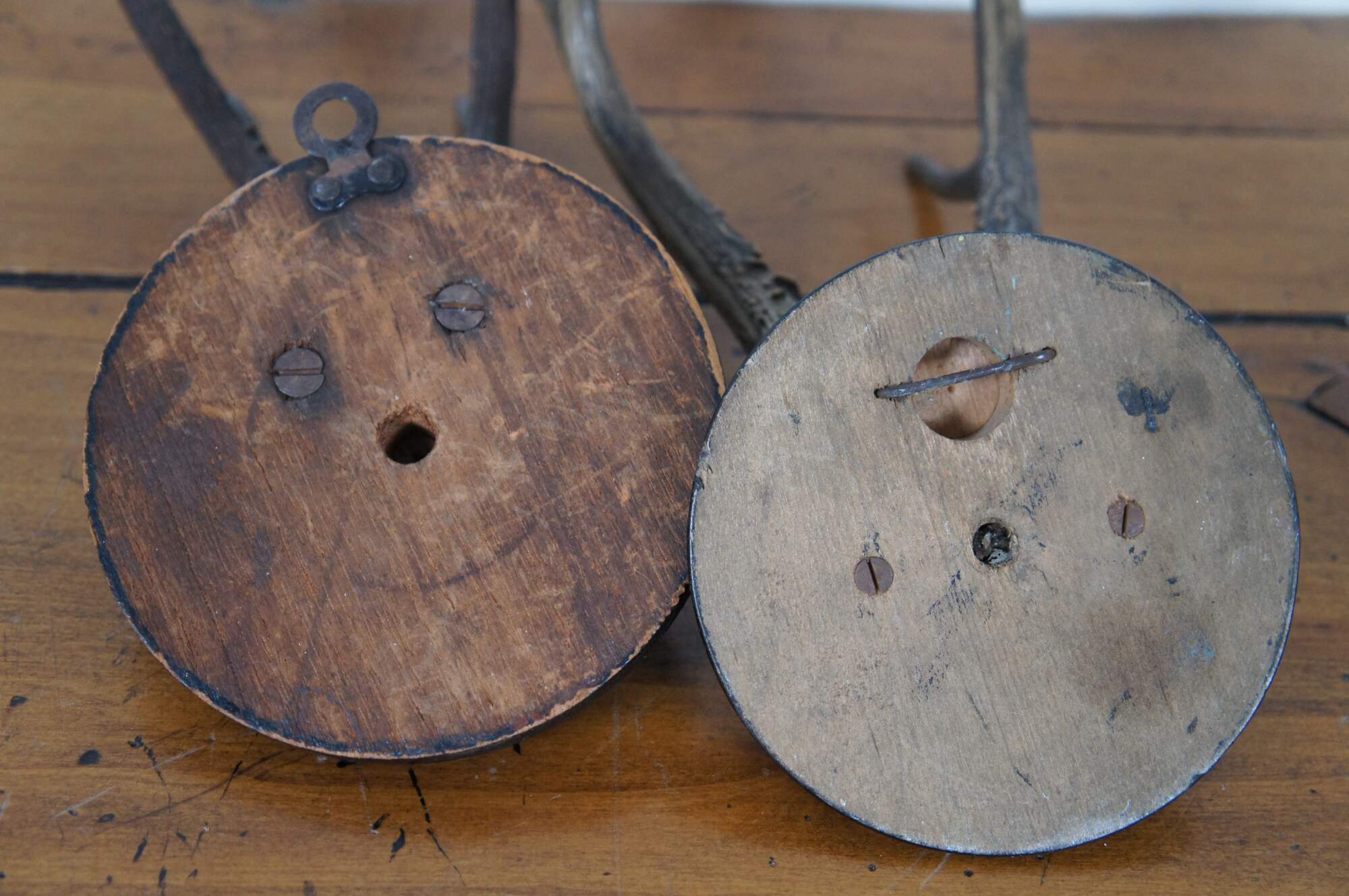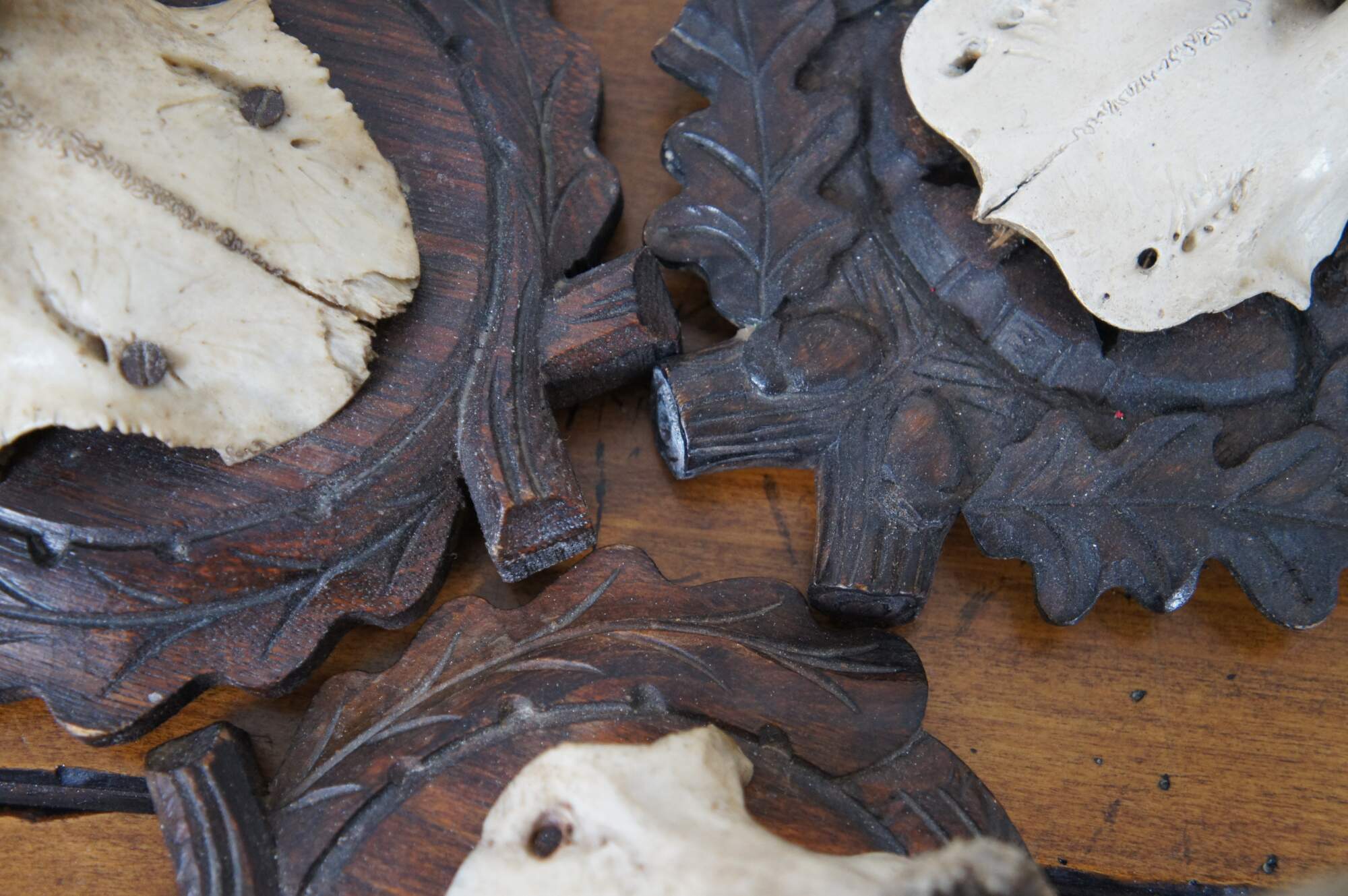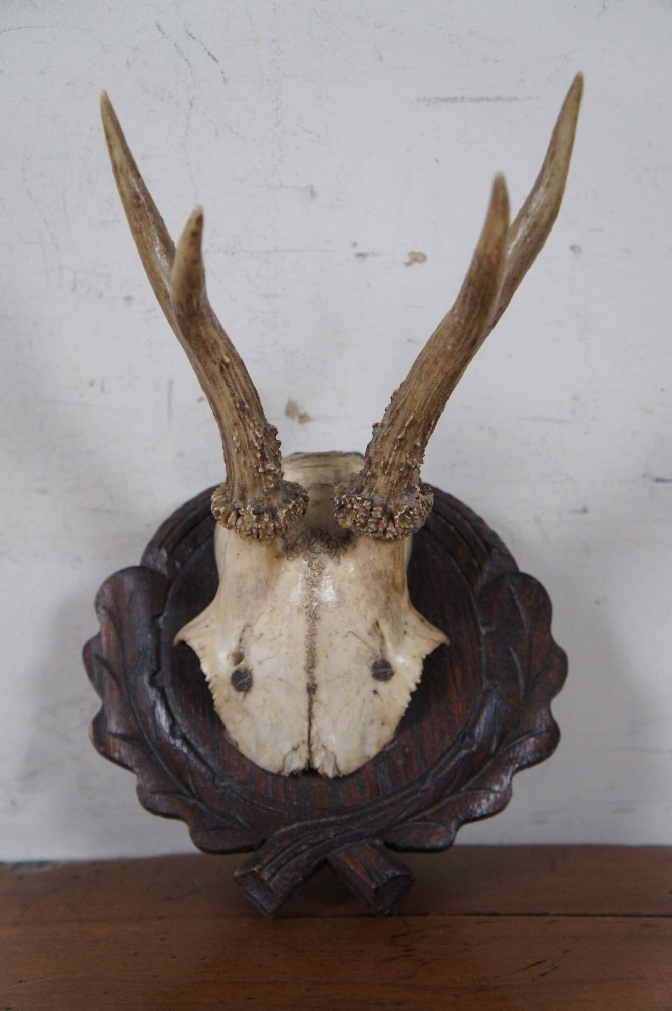 Lot of five antique mounted roe deer antlers and skull caps on wooden plaques, two simple round black beveled plaques and three carved wreath design shield plaques.