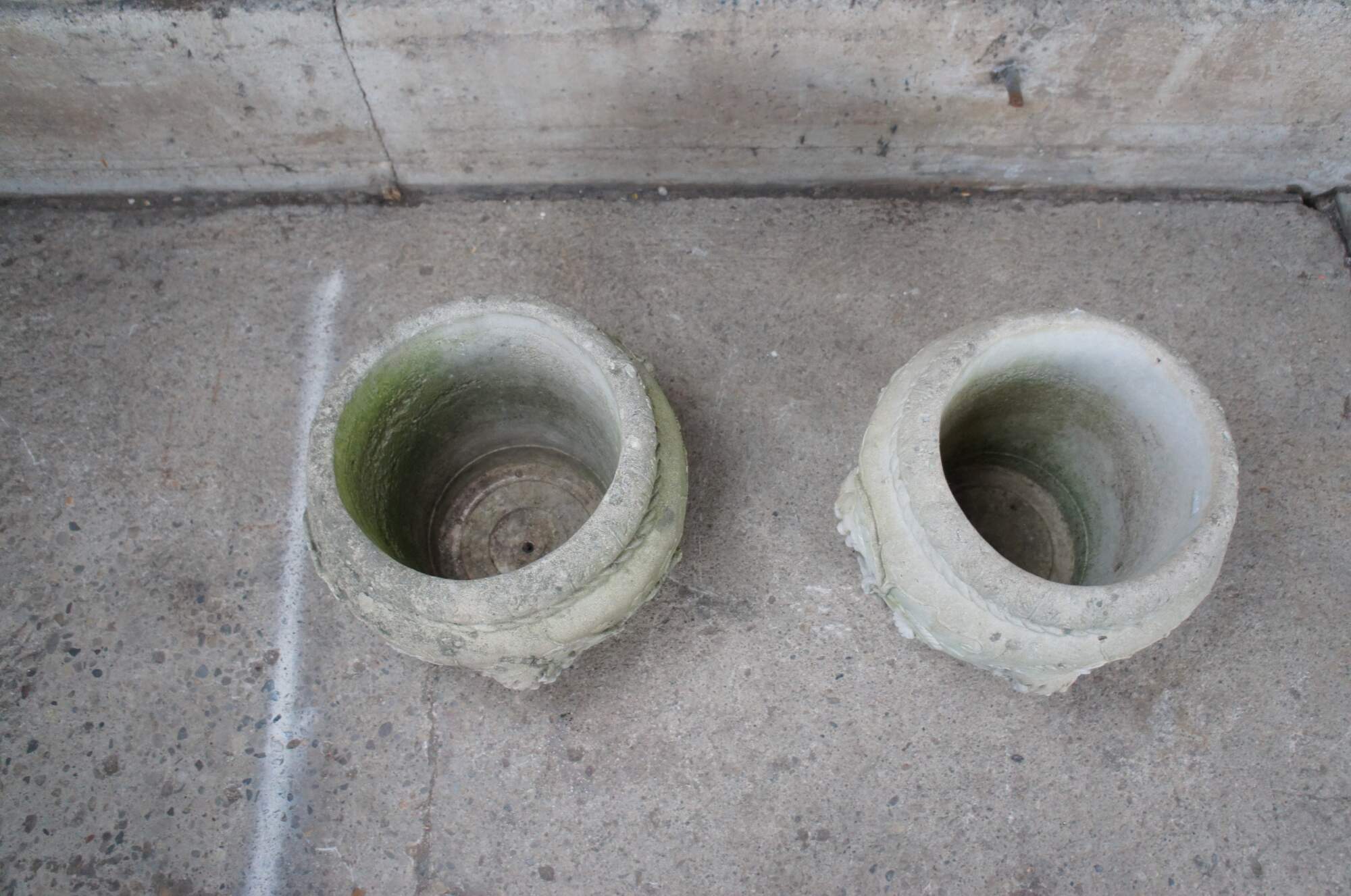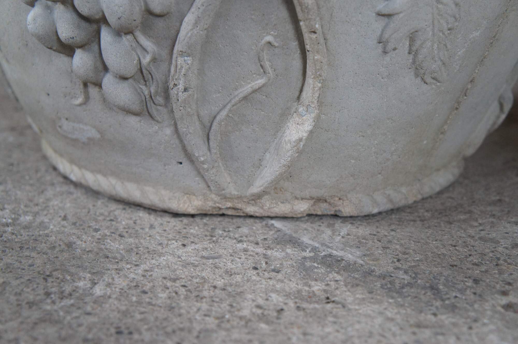 Two vintage Neoclassical style garden planters. Made of concrete featuring high relief grape vine, rope and leaf design. Each planter weighs 135 lbs