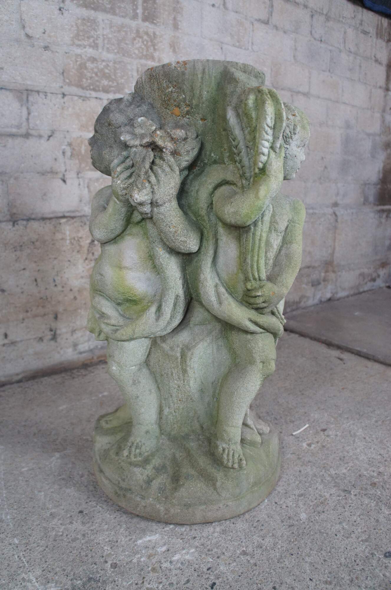 Vintage concrete fountain / planter / or sundial pedestal base featuring three children / Cherubs / Putti figures.