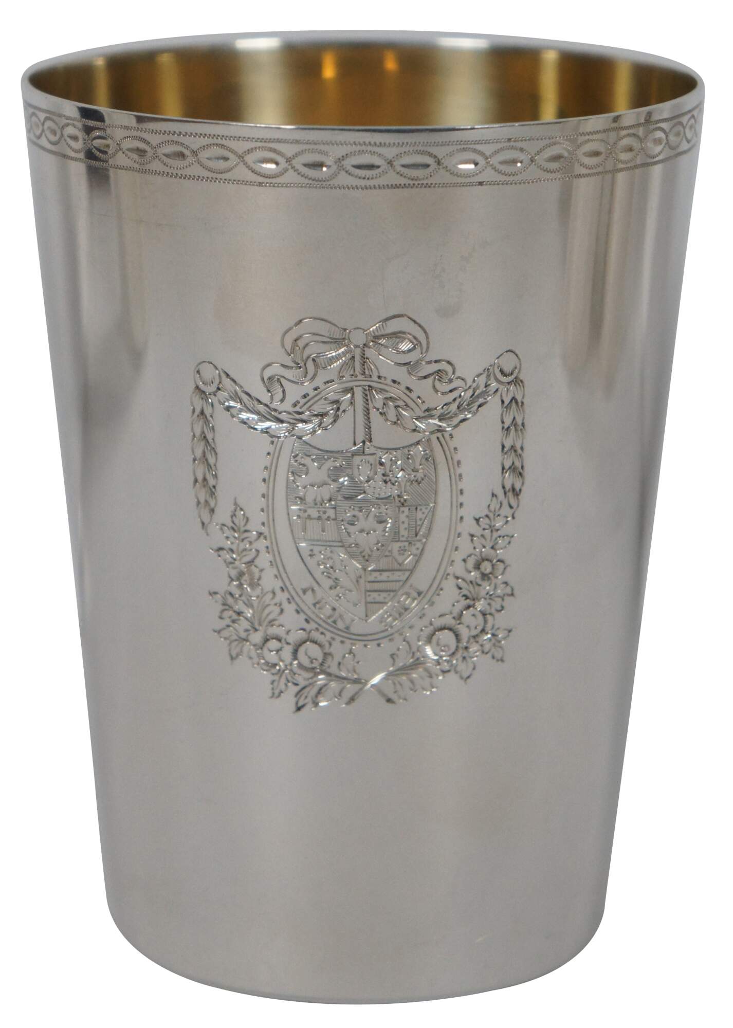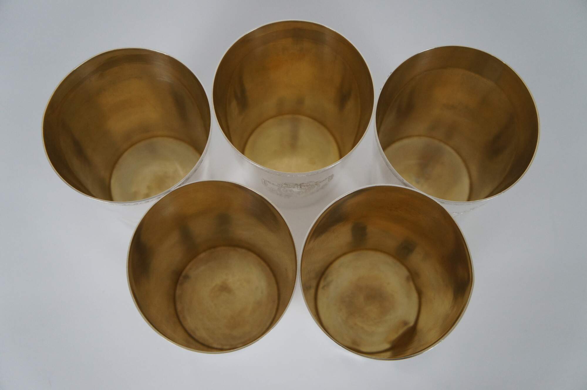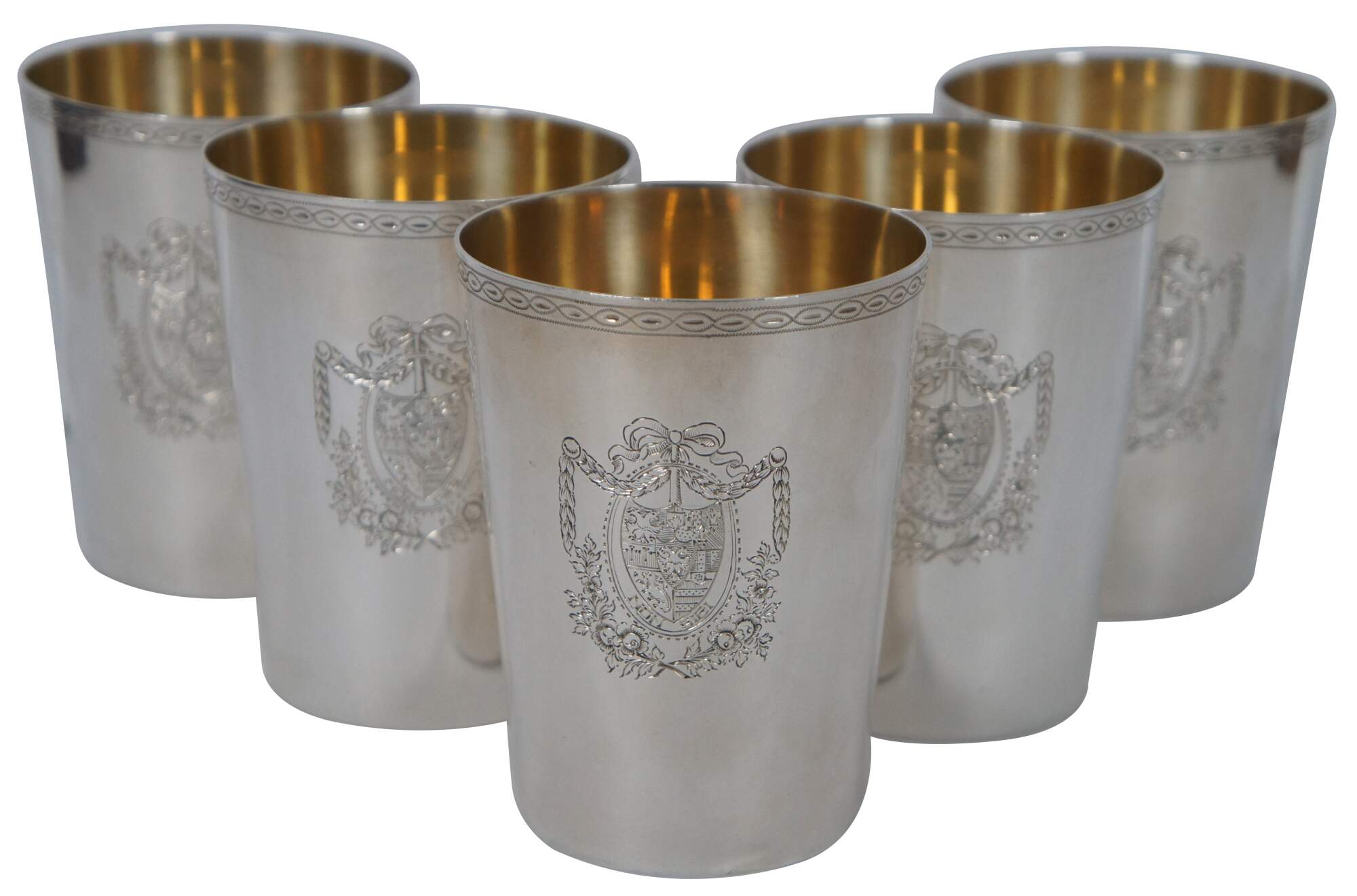Set of five antique Georgian sterling silver .925 cups / tumblers featuring plated interiors, a decorative band around the top, and stamped with an intricate heraldic coat of arms with the motto “Non Sibi” (Latin: Not for Self). Marked on base with PS which is attributed to Paul Storr, a lion passant facing left, a bust head of George III (upside down), a date mark "O" which translates to circa 1809, and a crowned leopards head.
