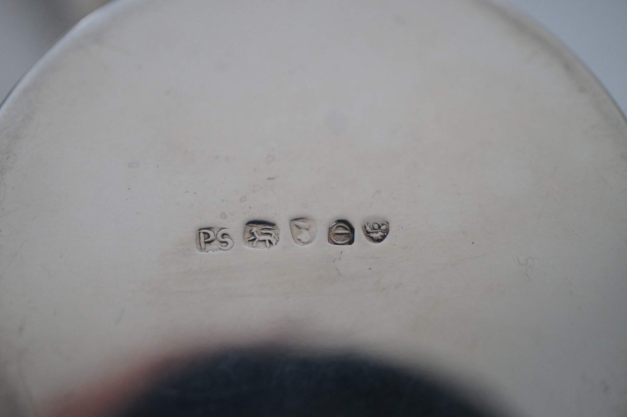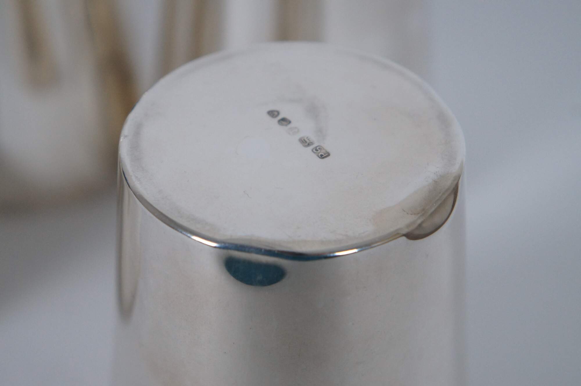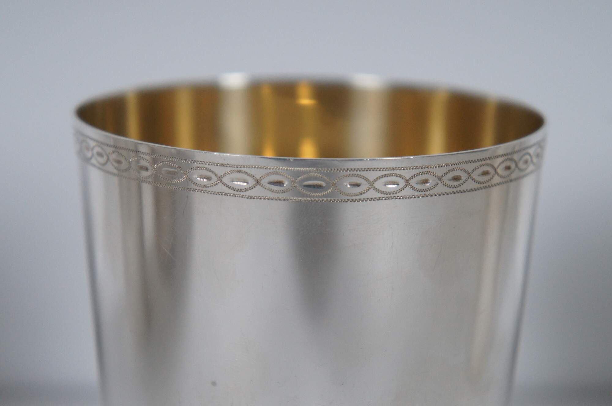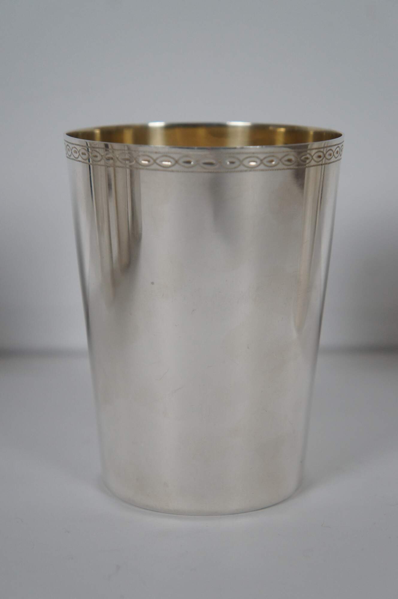 Set of five antique Georgian sterling silver .925 cups / tumblers featuring plated interiors, a decorative band around the top, and stamped with an intricate heraldic coat of arms with the motto “Non Sibi” (Latin: Not for Self). Marked on base with PS which is attributed to Paul Storr, a lion passant facing left, a bust head of George III (upside down), a date mark "O" which translates to circa 1809, and a crowned leopards head.
