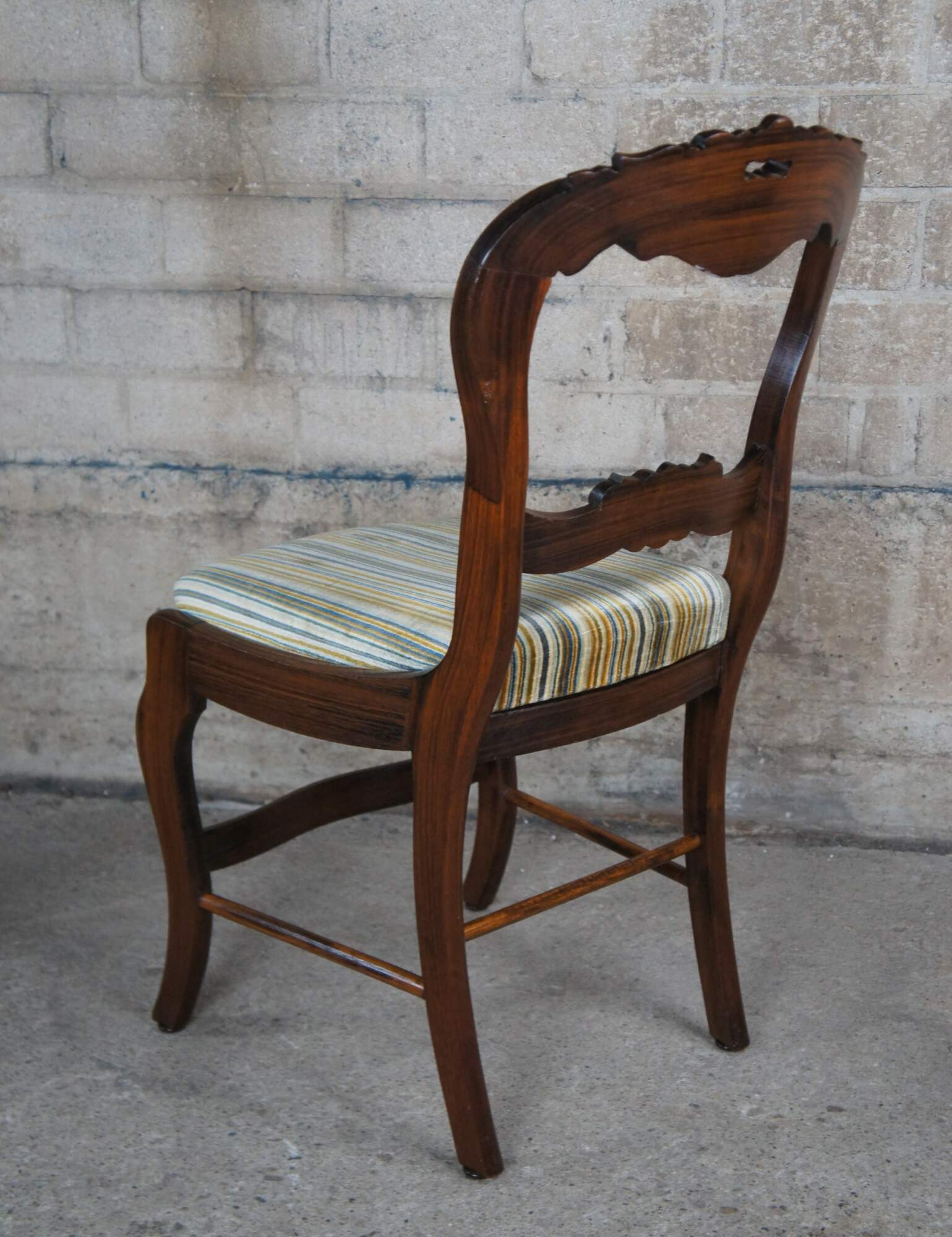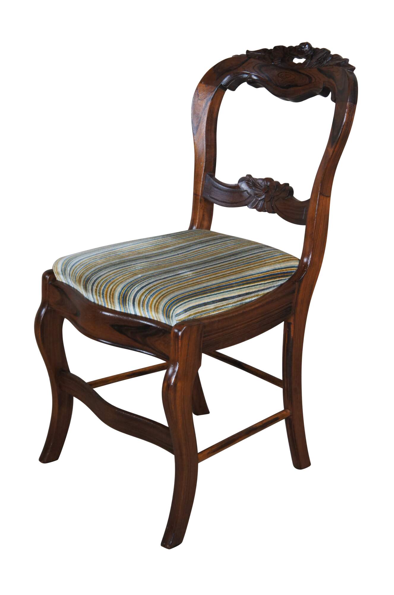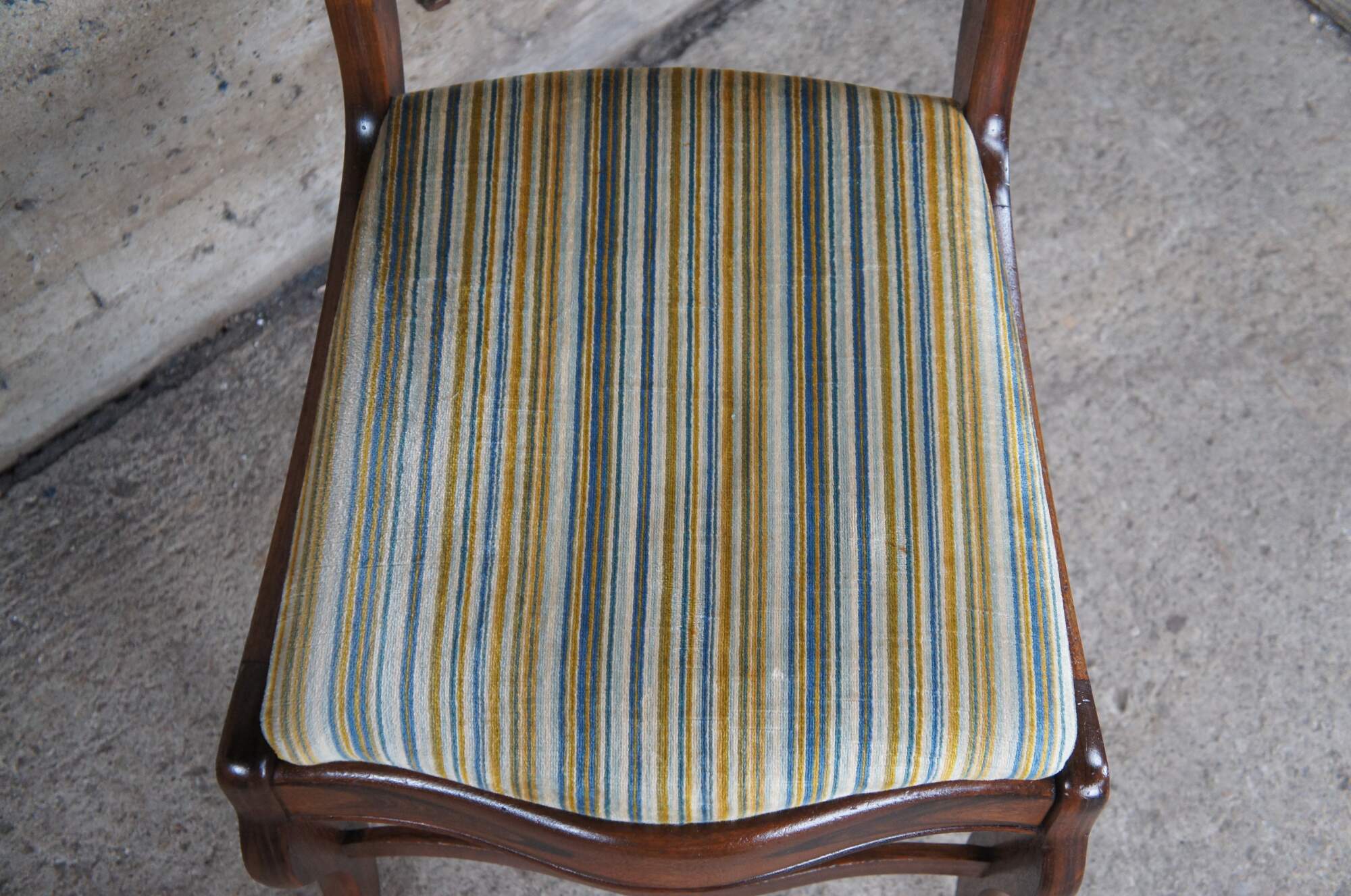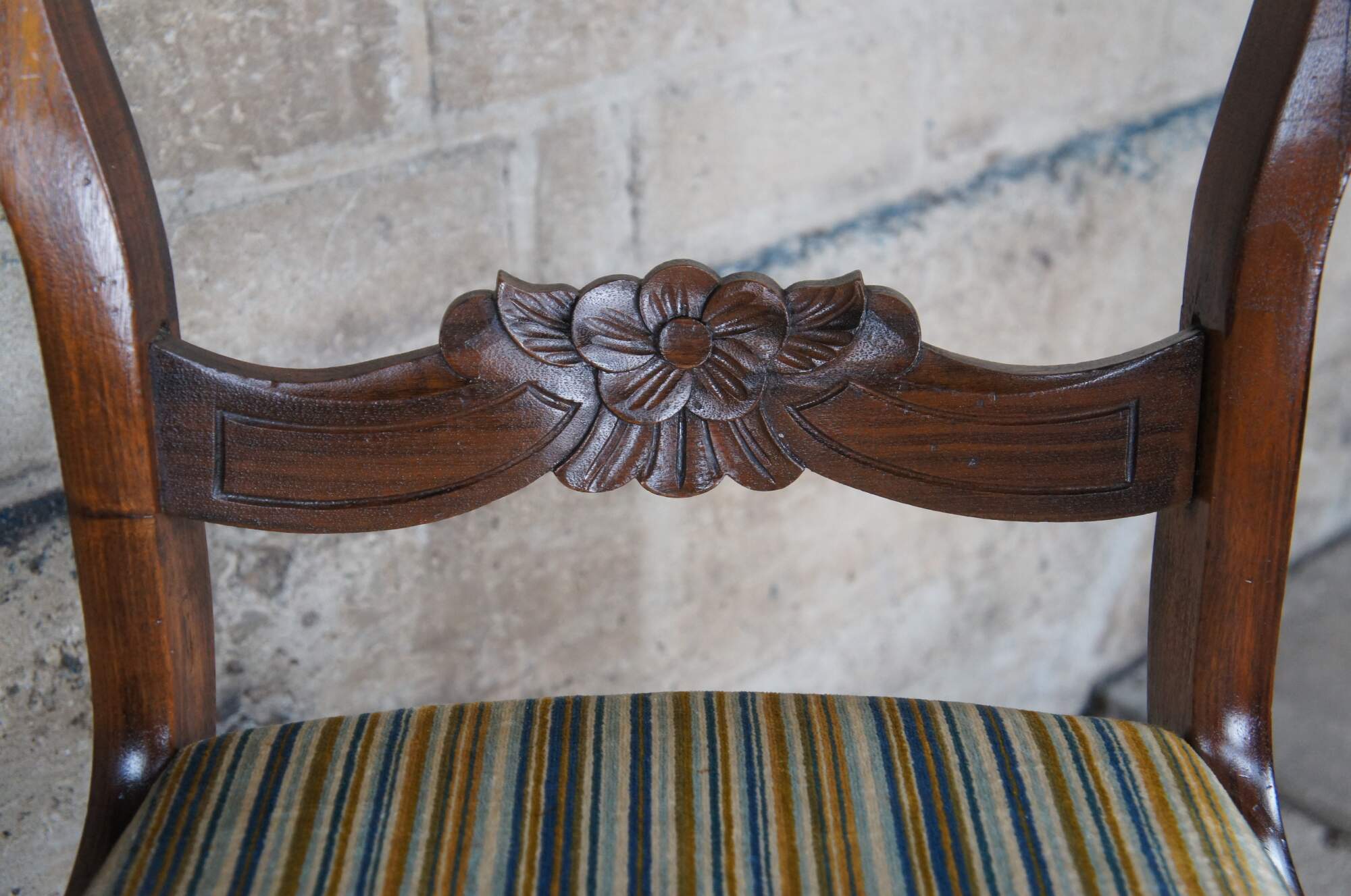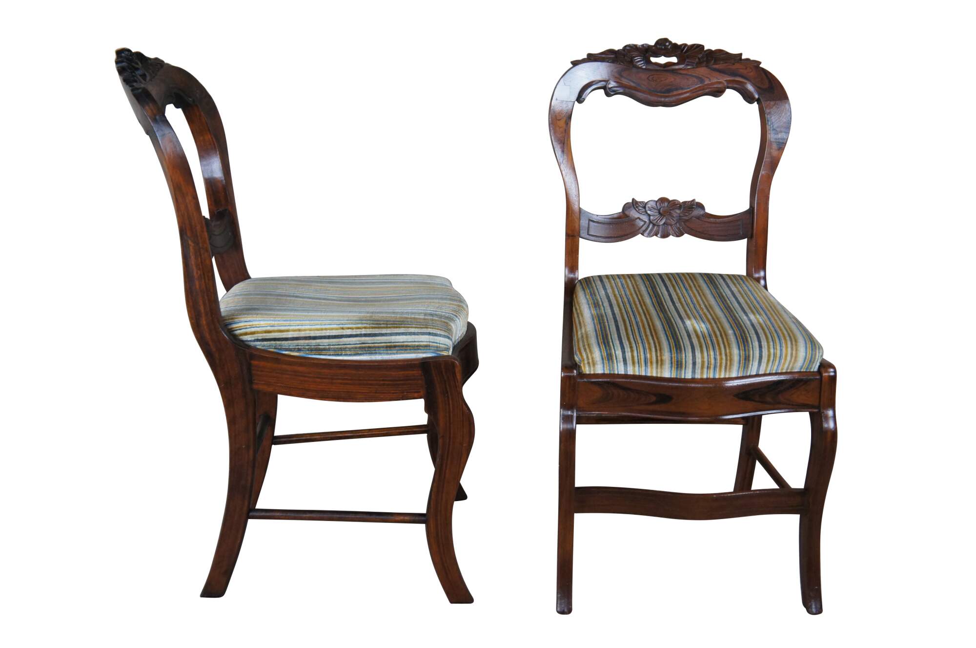 Two antique Duncan Phyfe / Balloon back style dining chairs. Made of rosewood featuring serpentine form with carved floral accents and striped upholstery.