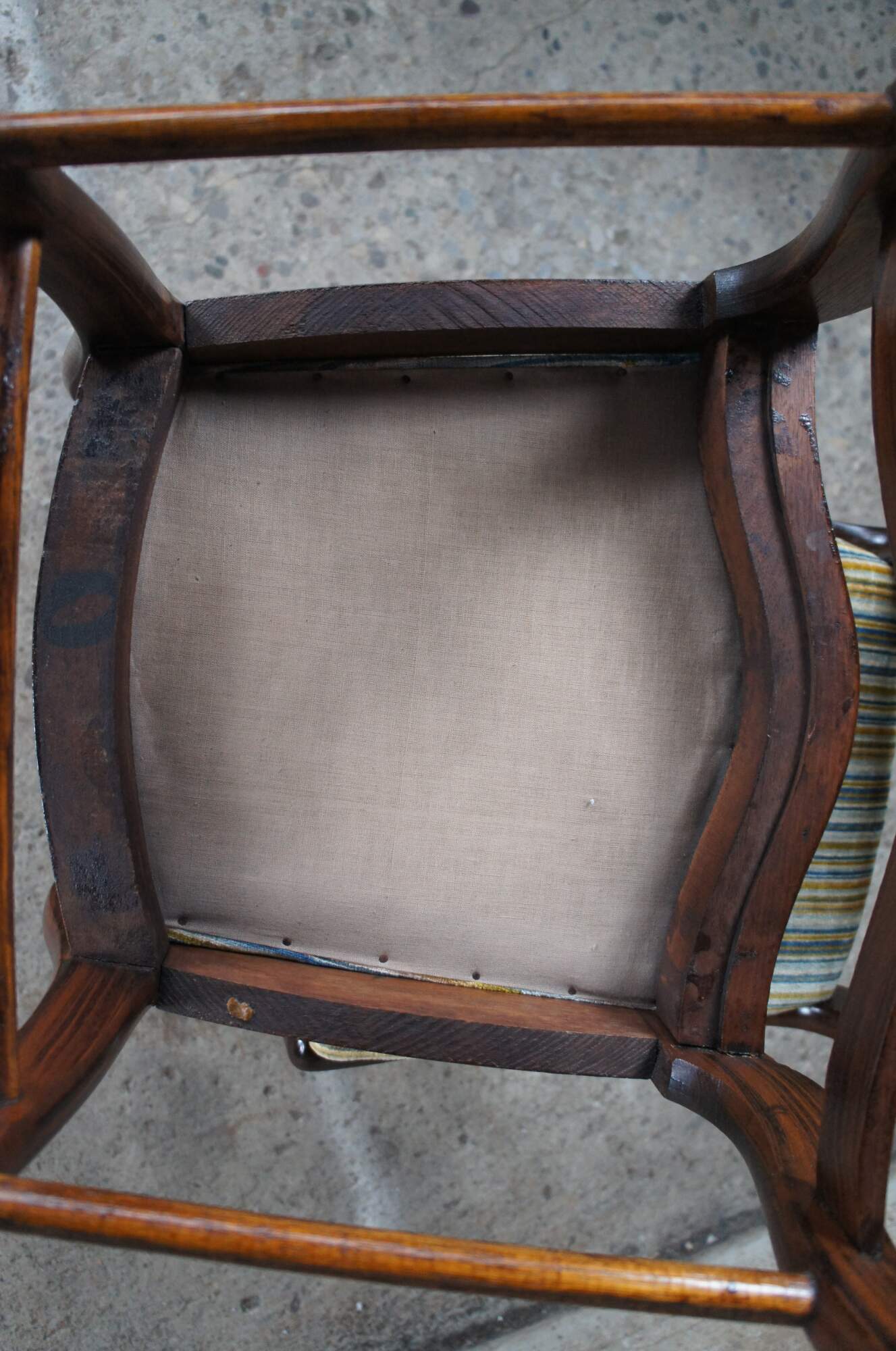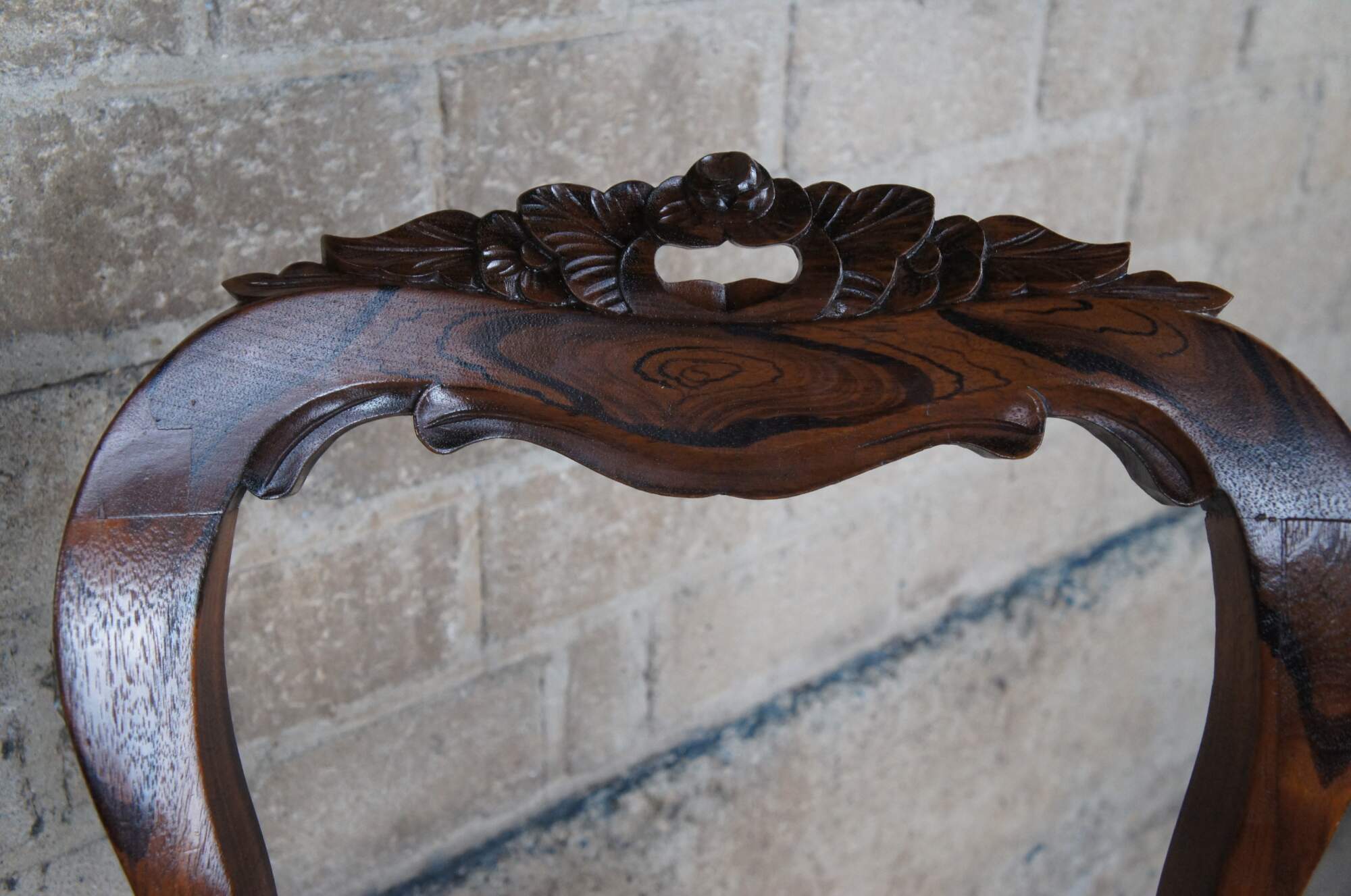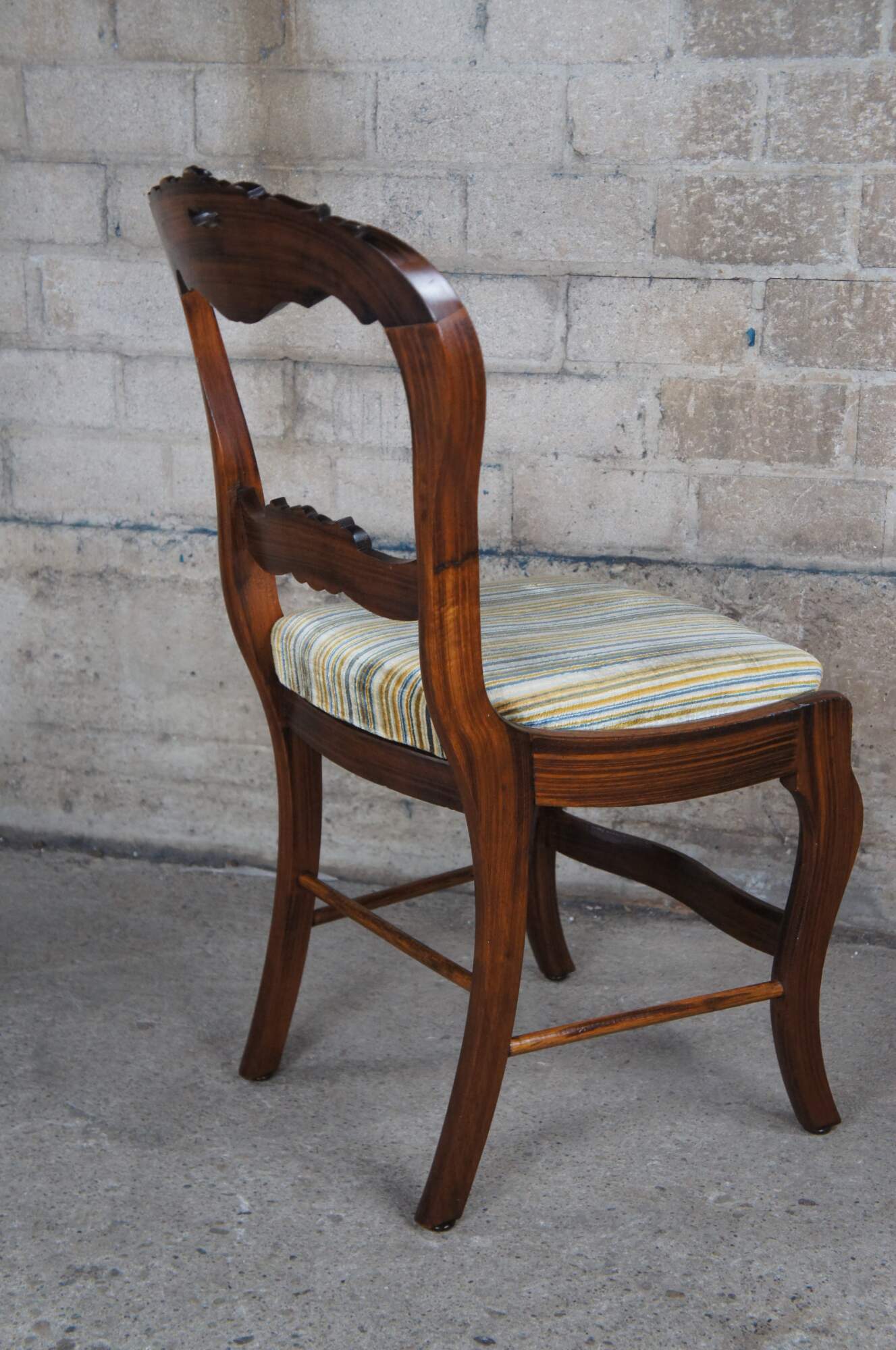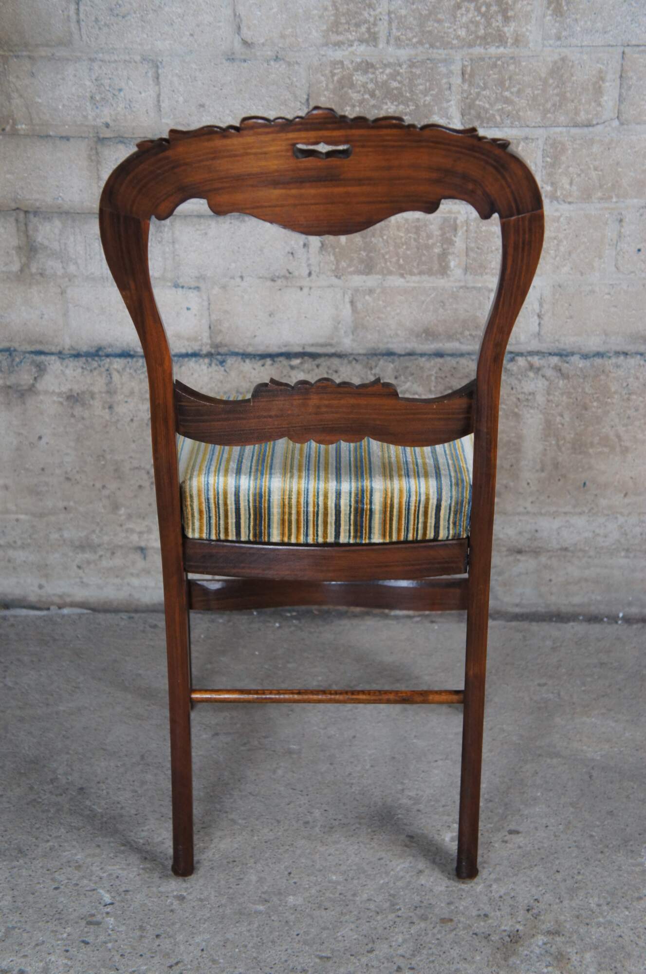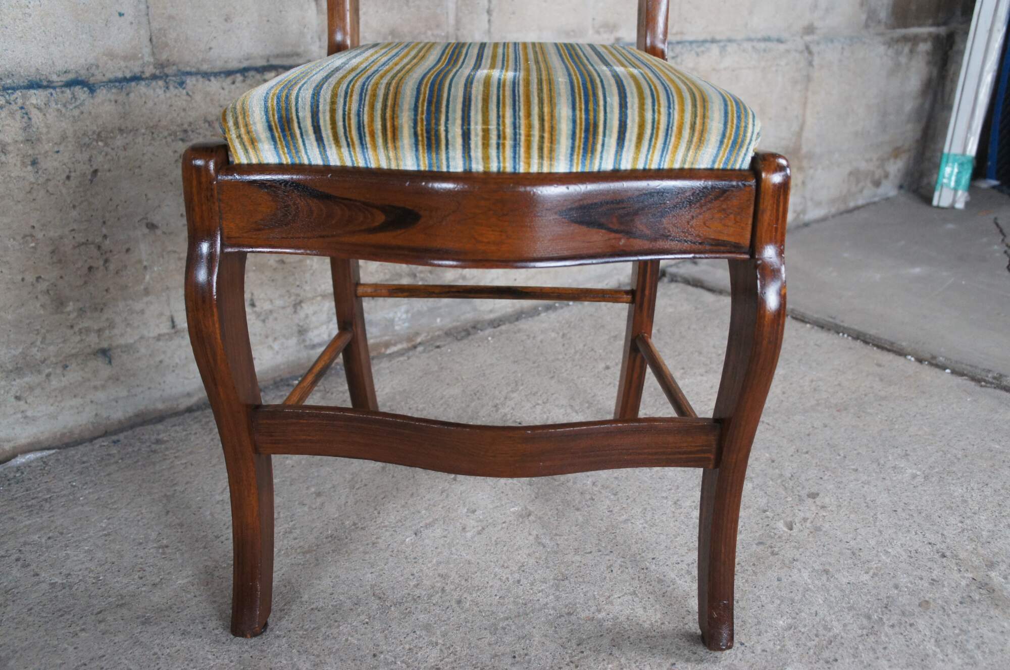Two antique Duncan Phyfe / Balloon back style dining chairs. Made of rosewood featuring serpentine form with carved floral accents and striped upholstery.
