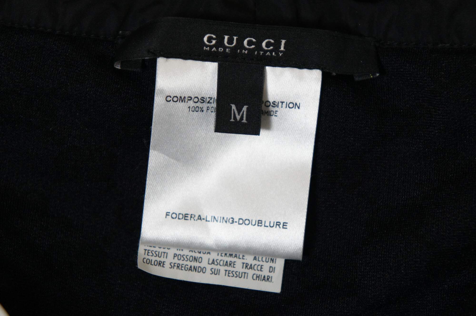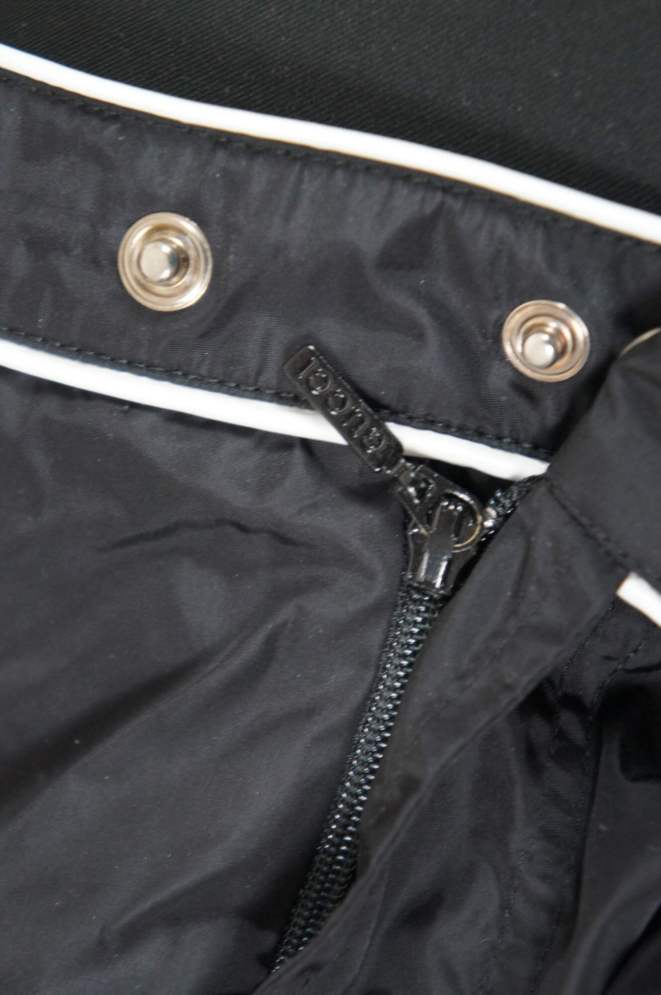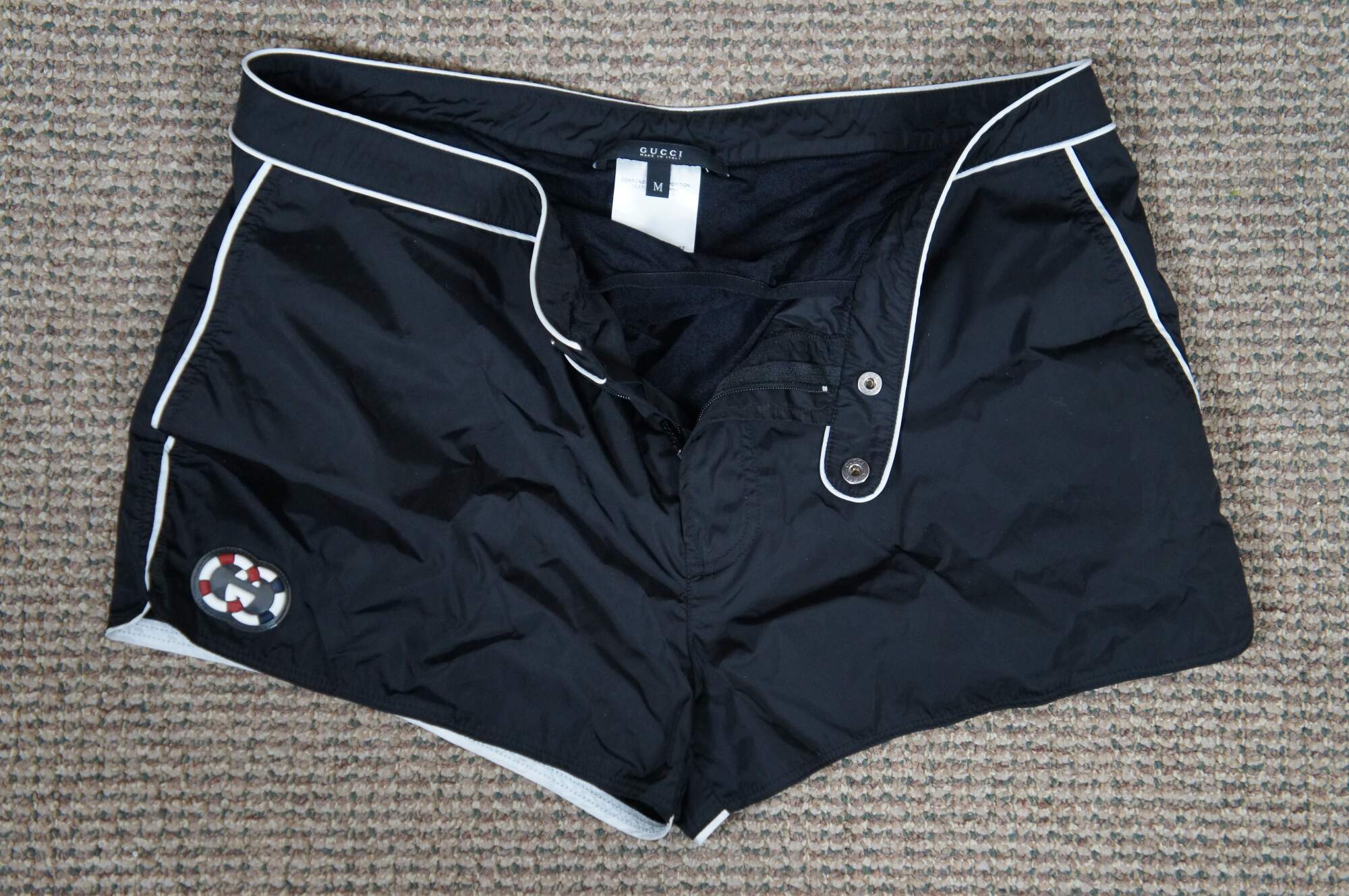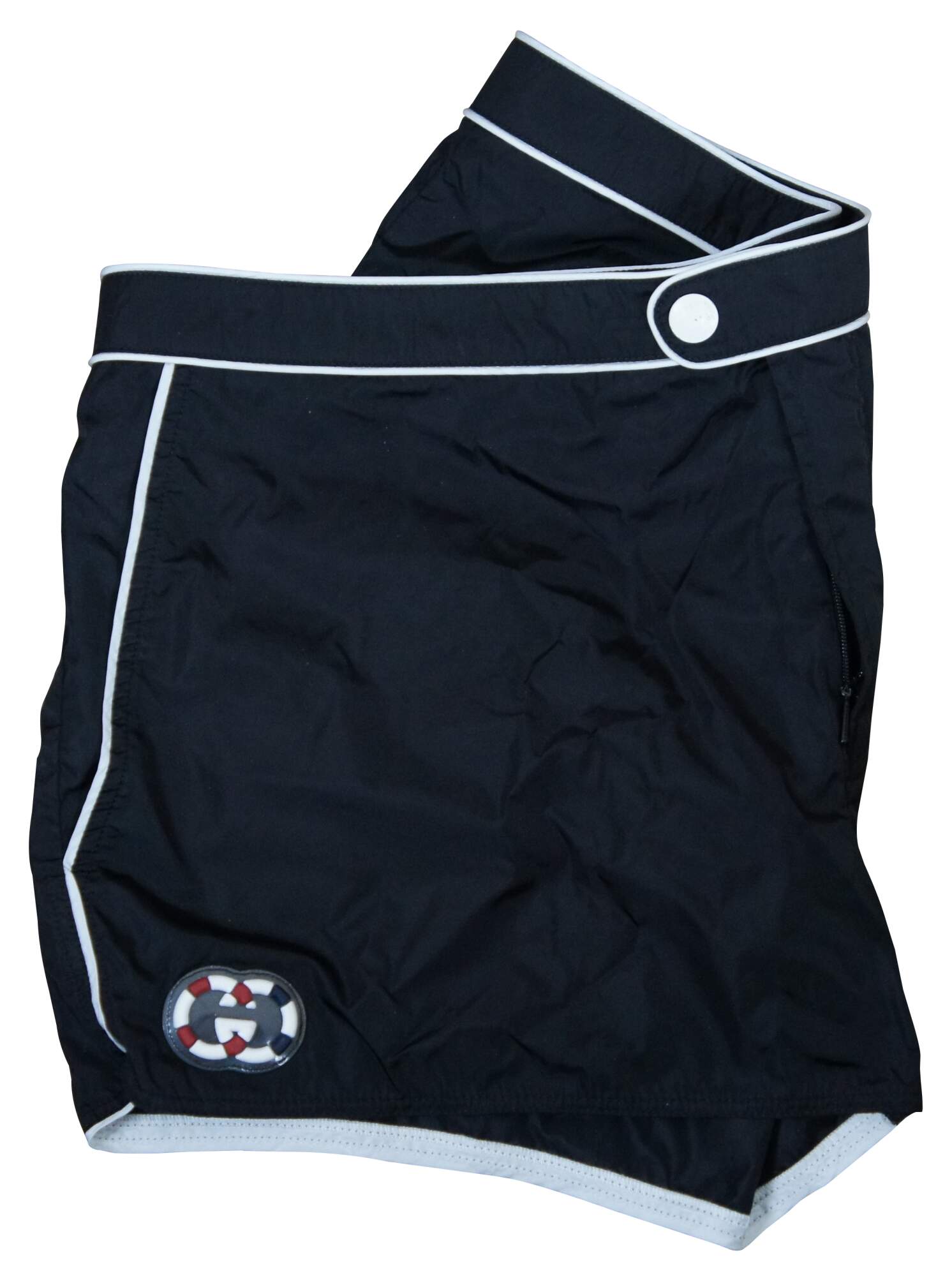 Rare vintage men’s Gucci black swim shorts / trunks with white piping, zip and button closure, side pockets and rubber life preserver interlocking double G Gucci initial logo.