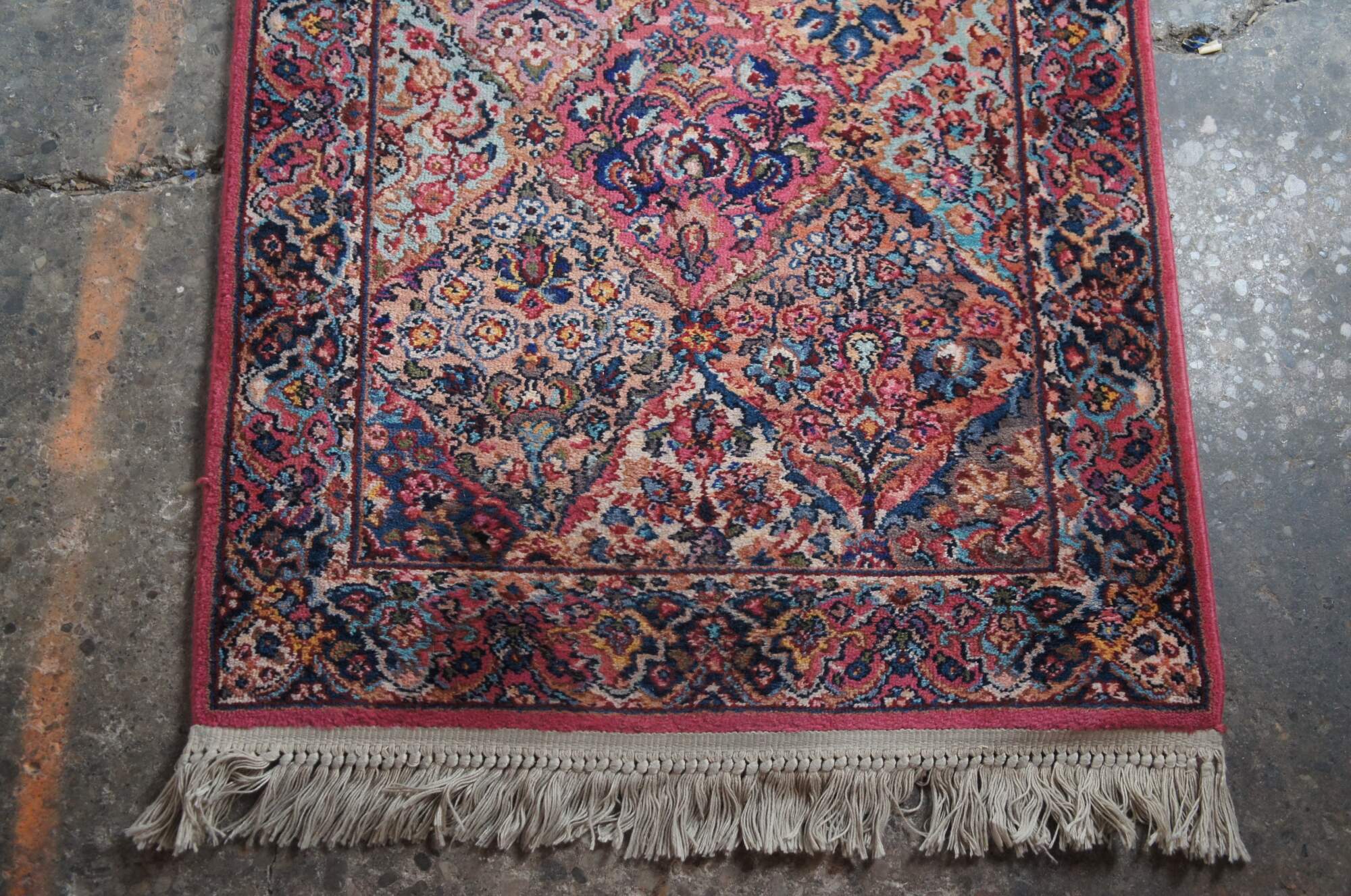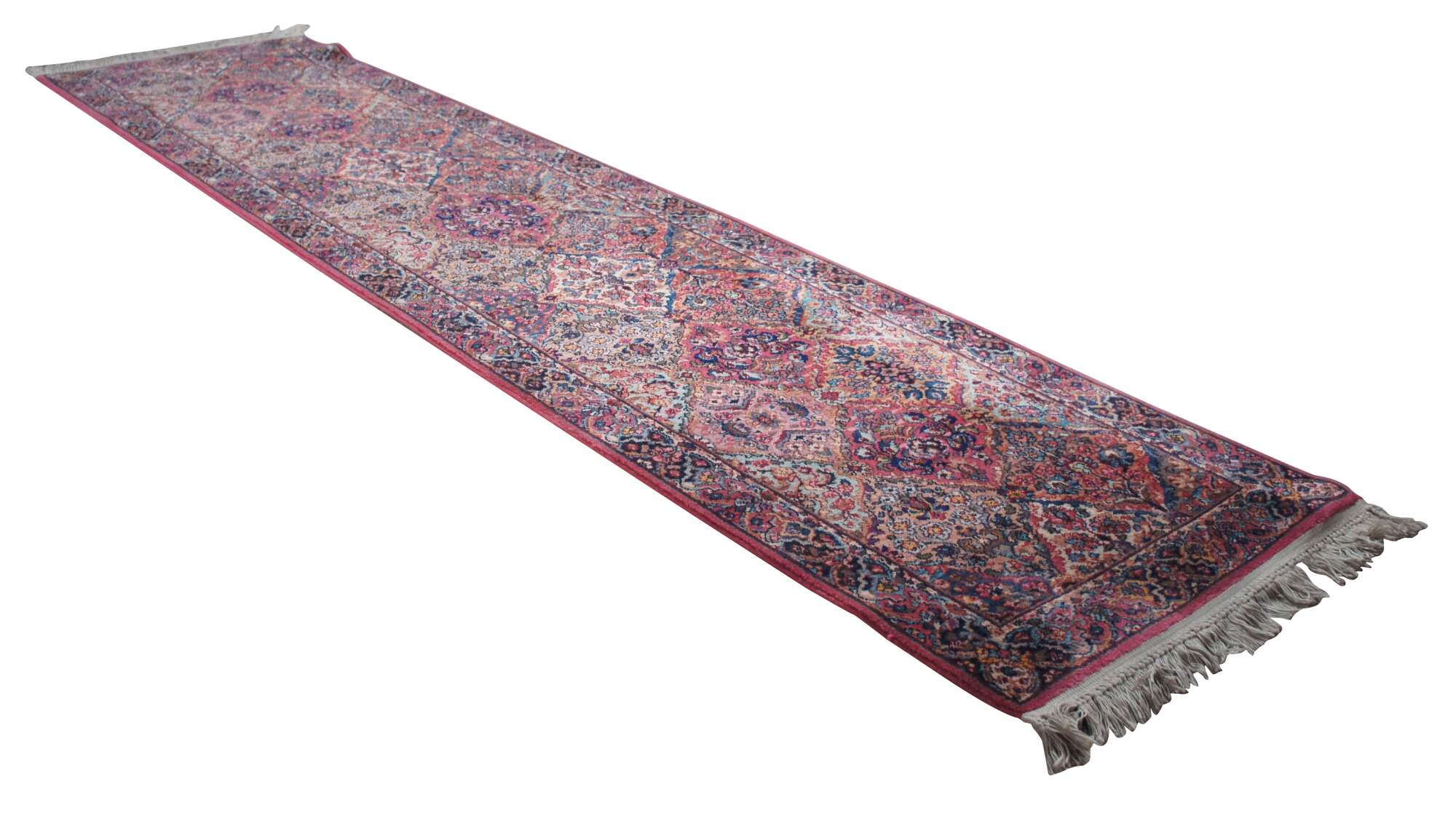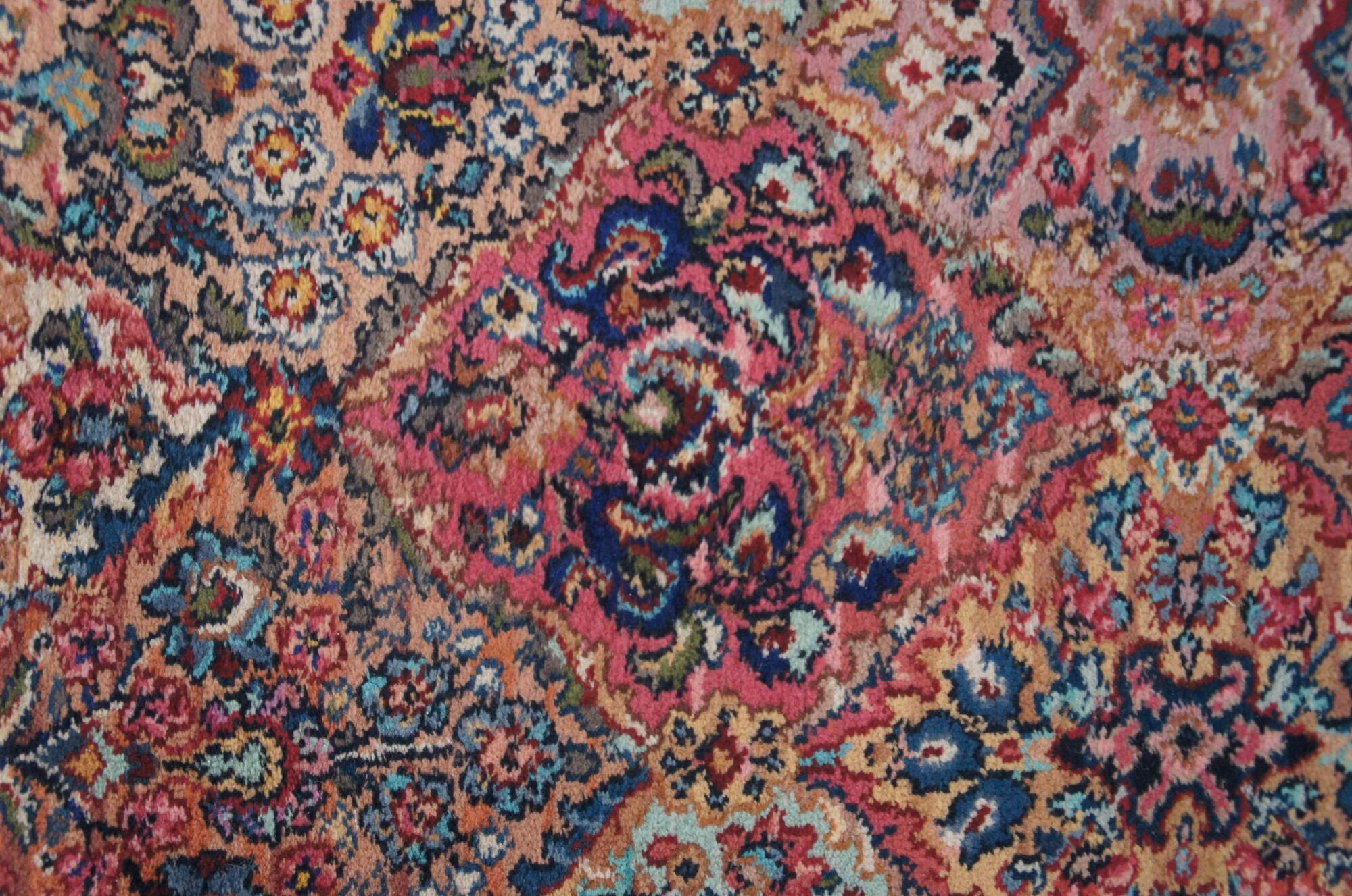Karastan Design No. 717, Kirman. Made of 100% Wool with a pink background and colorful floral geometric design.