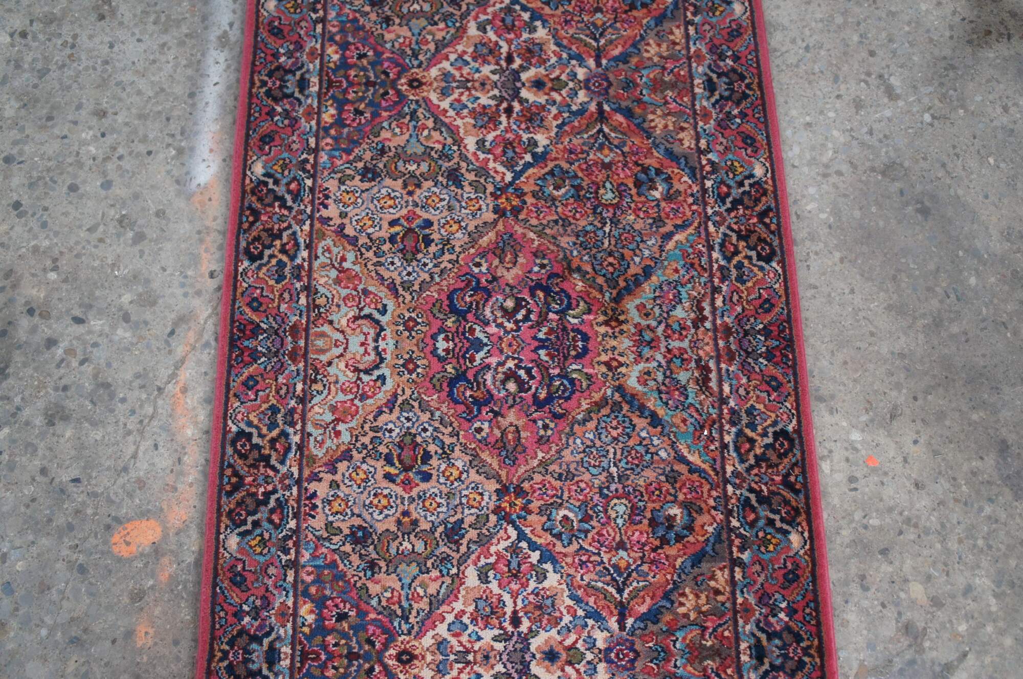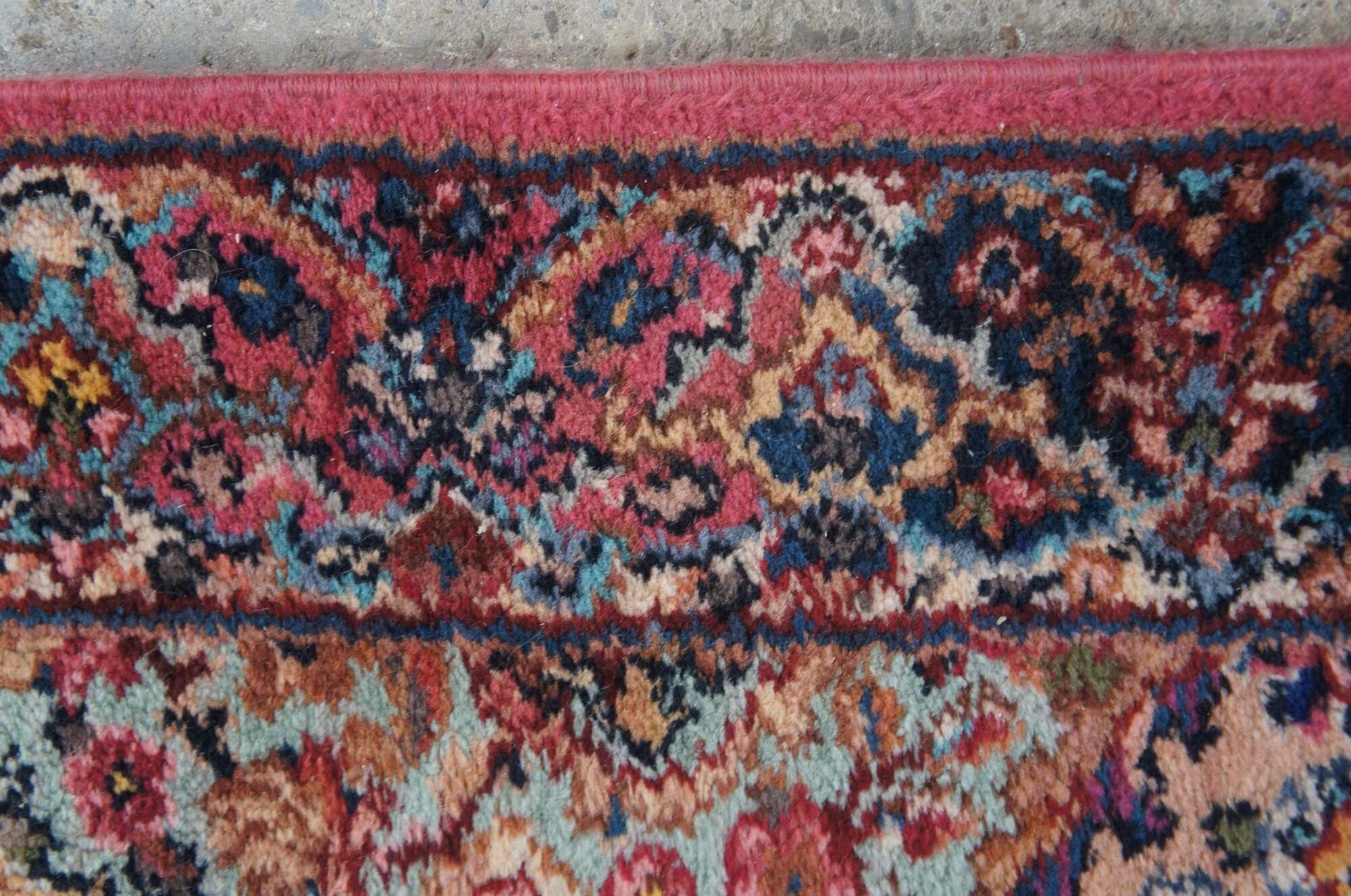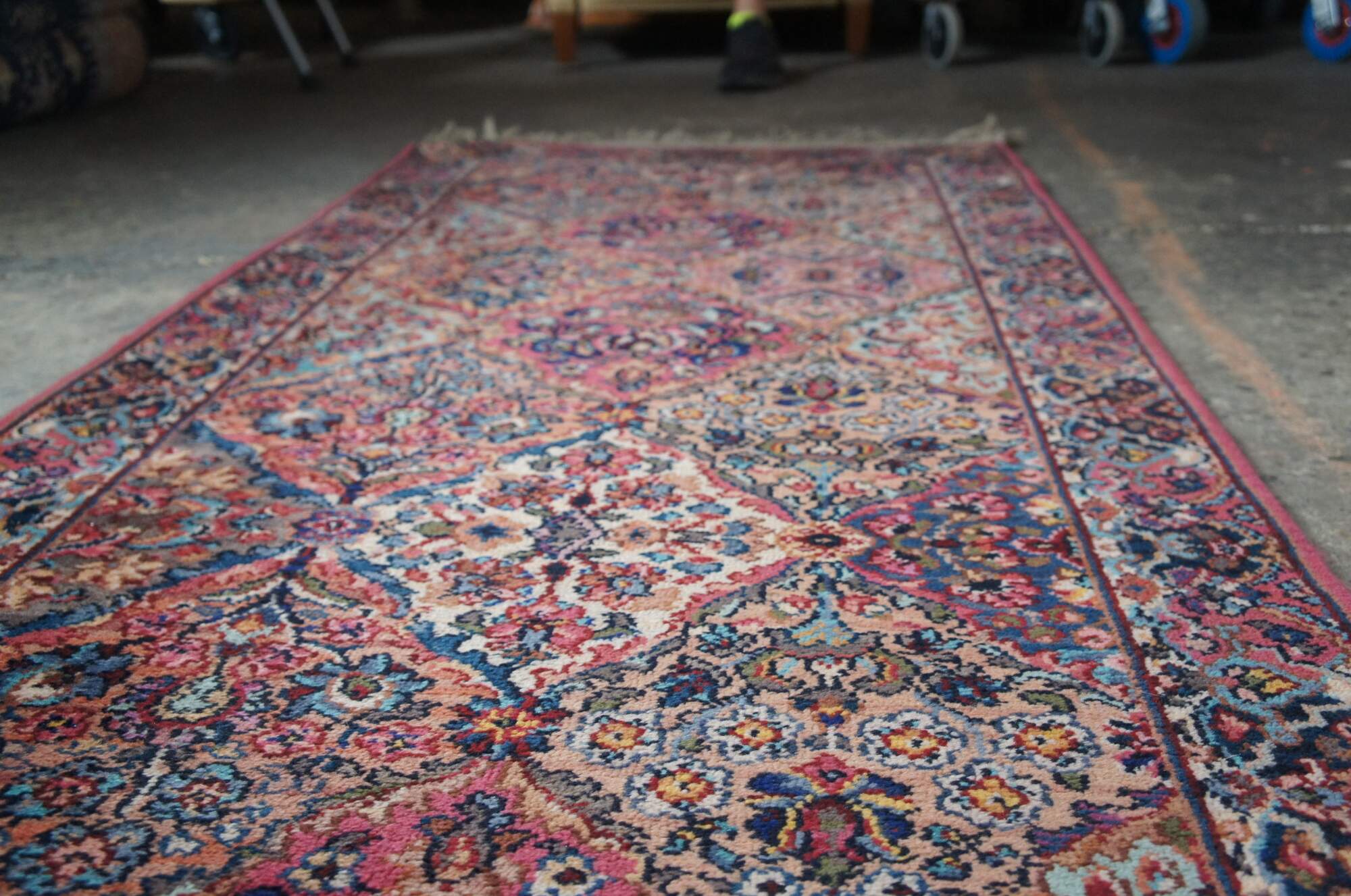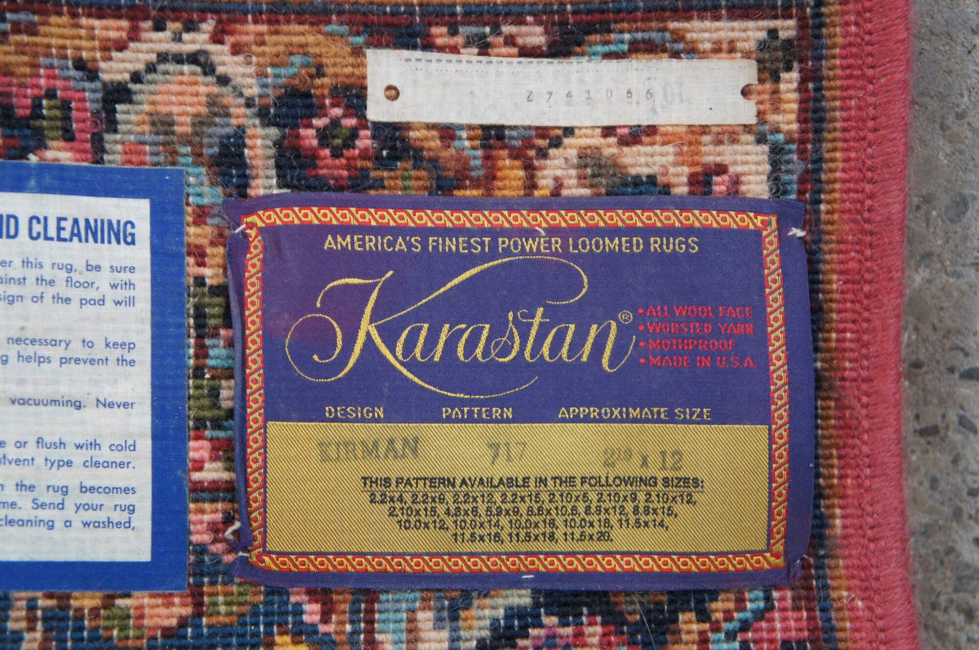 Karastan Design No. 717, Kirman. Made of 100% Wool with a pink background and colorful floral geometric design.