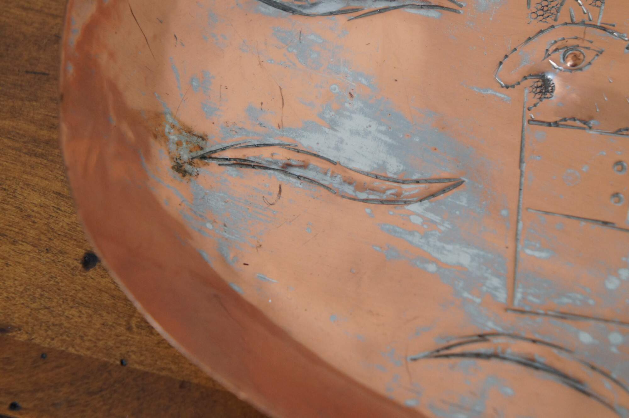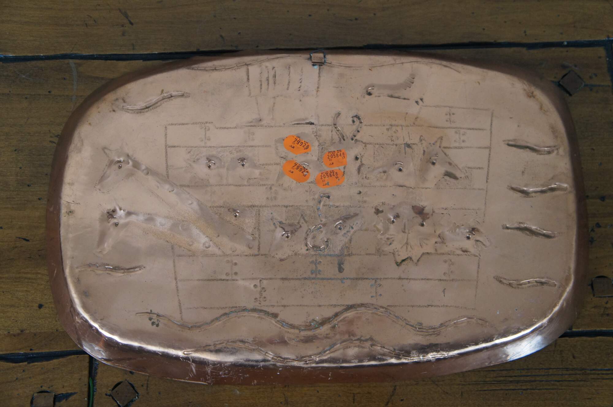 Vintage copper rectangular wall hanging tray or casserole style serving dish depicting the Jewish Torah / Christian Bible story of Noah’s Ark, with attached hook for displaying on the wall. Marked “Handmade in Israel” on hook. Attributed to Messica.