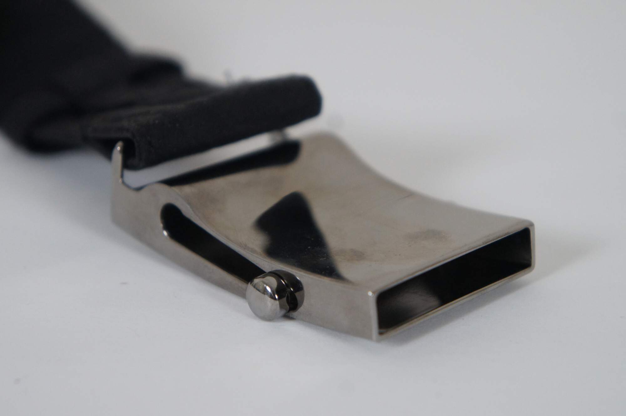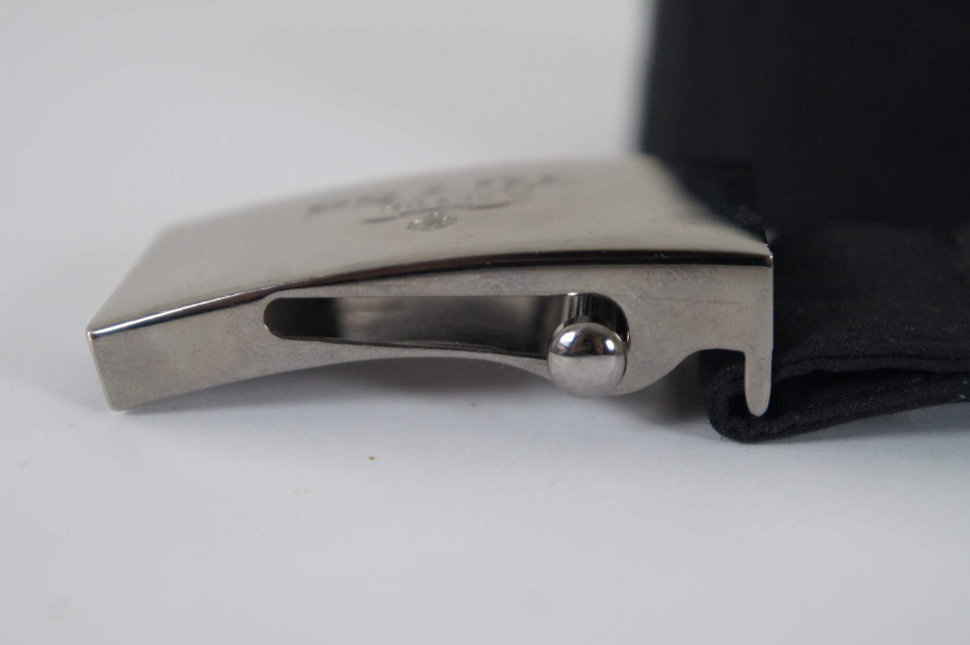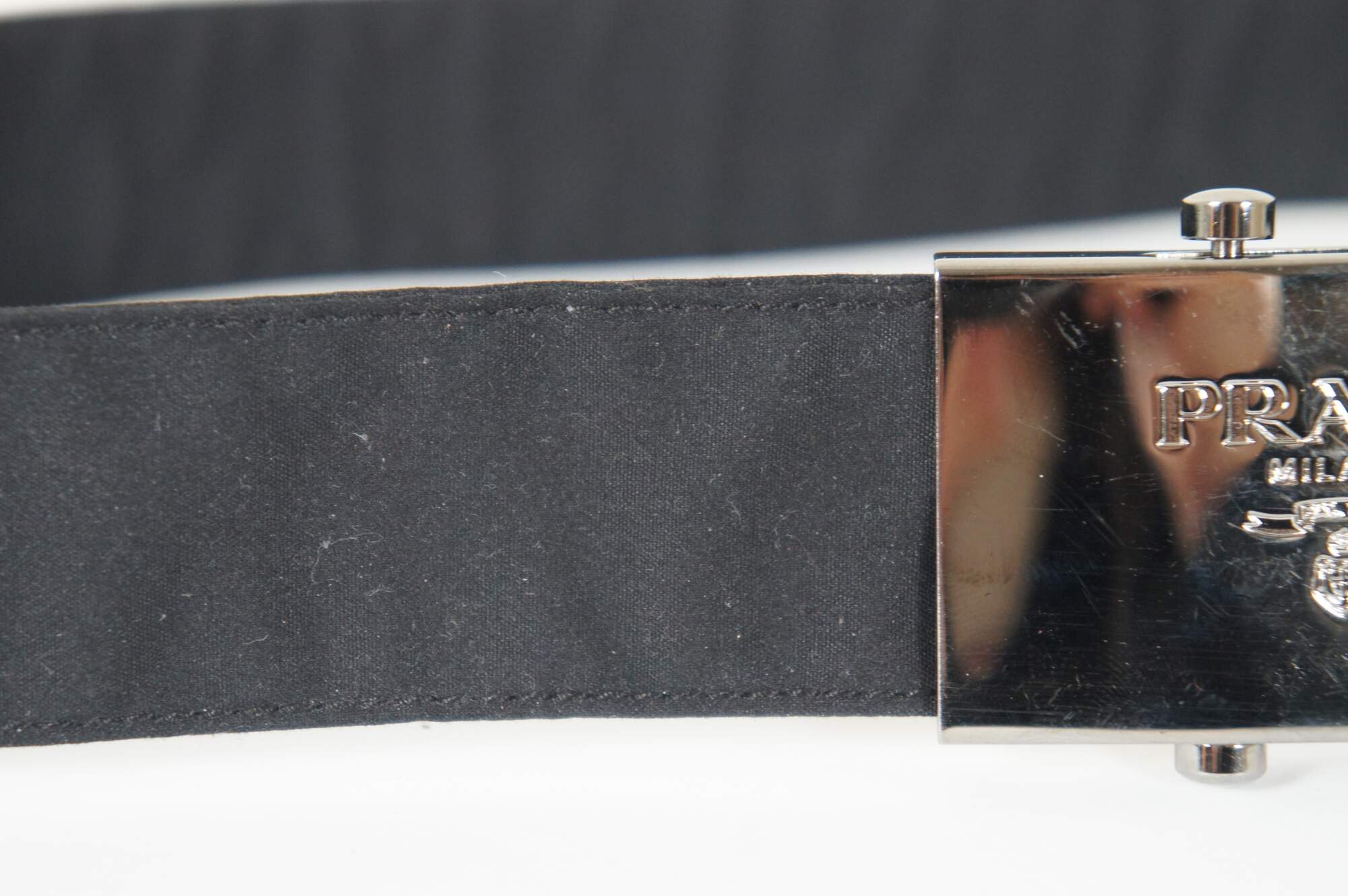 Vintage Italian black Prada belt featuring a fabric / cloth body and silver logo buckle. Made in Italy.
