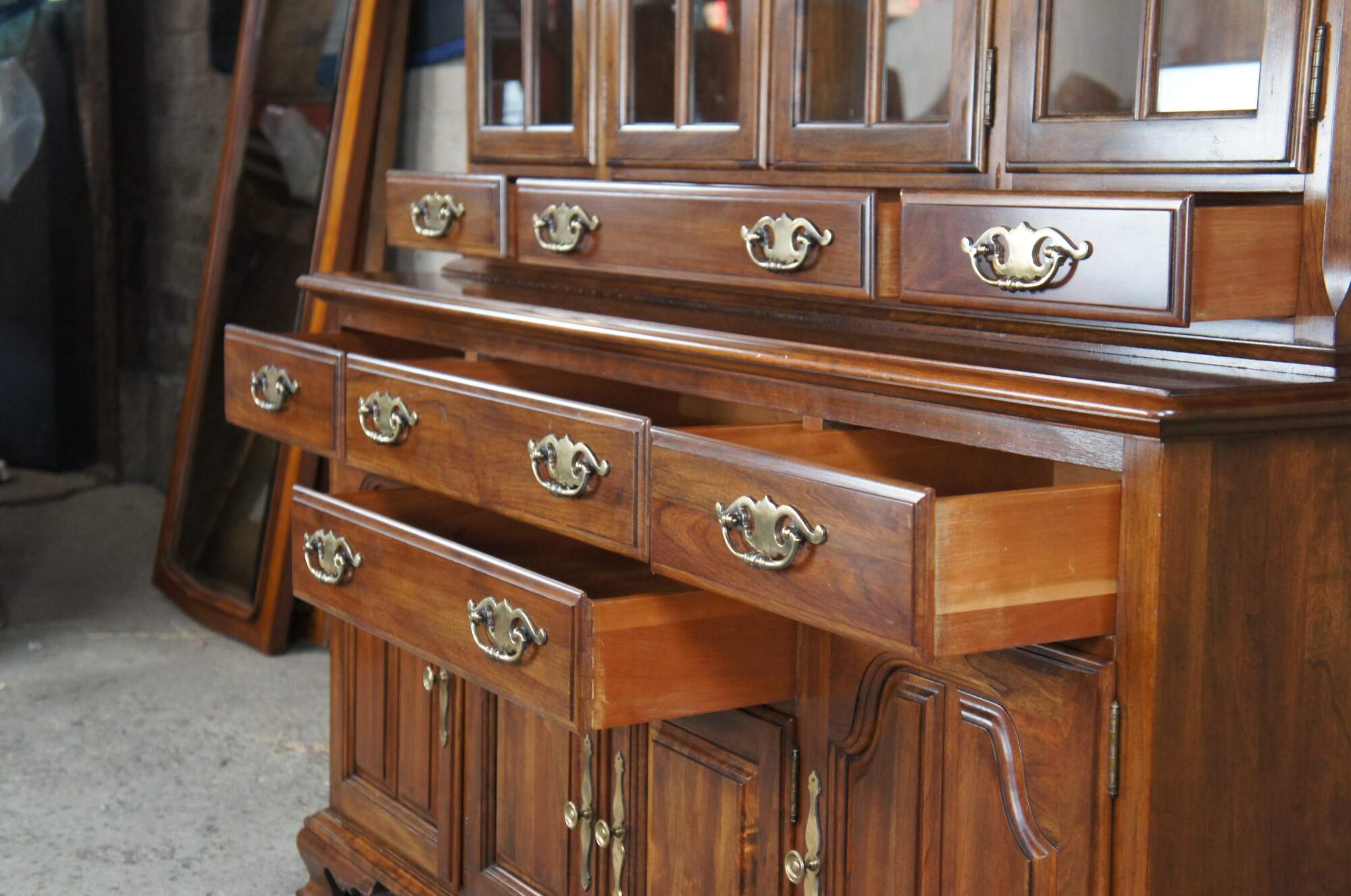 Circa 1970s Kling Colonial Solid Cherry China Cabinet. Features a stepback hutch with arched and fretted glass doors over 3 quaint drawers. Opens to three shelves and glass inserts. Bottom buffet portion has four dovetailed drawers over three cabinets for accessory storage. Drawer and door pulls are all brass. The cabinet is supported by bracket feet.
