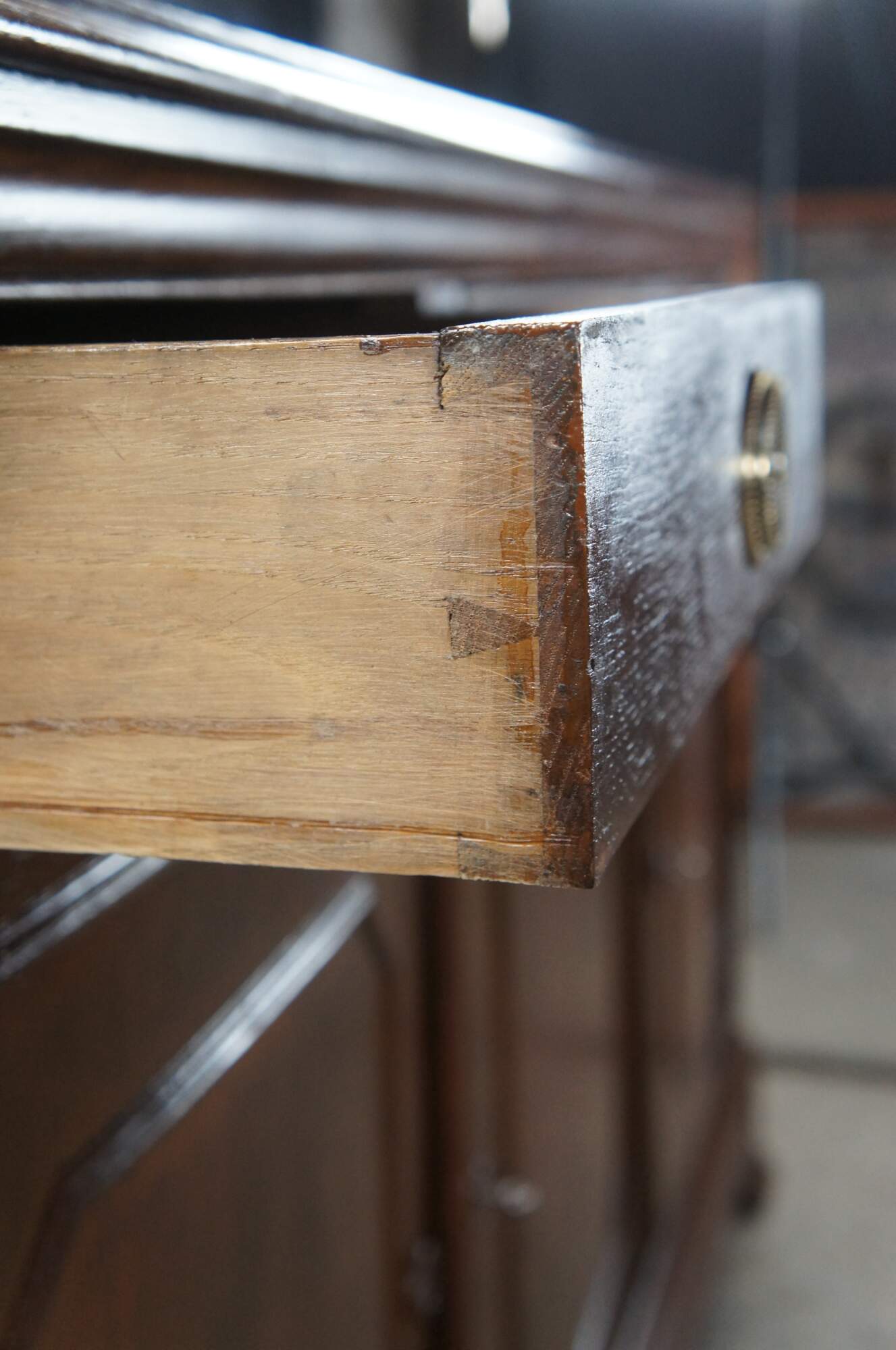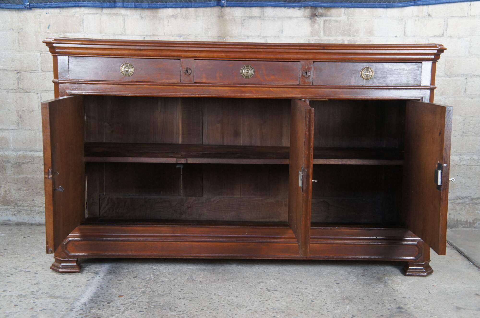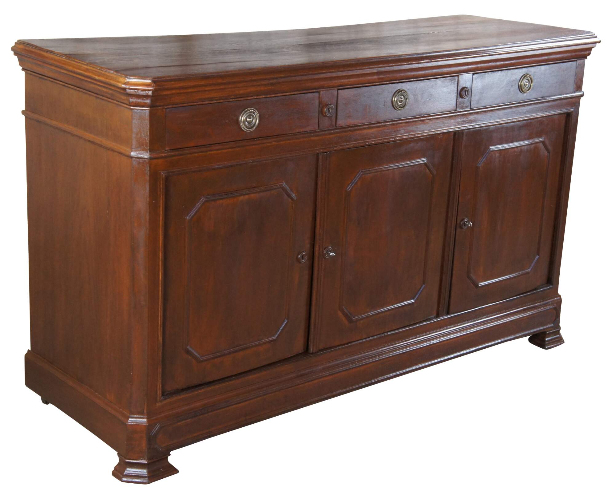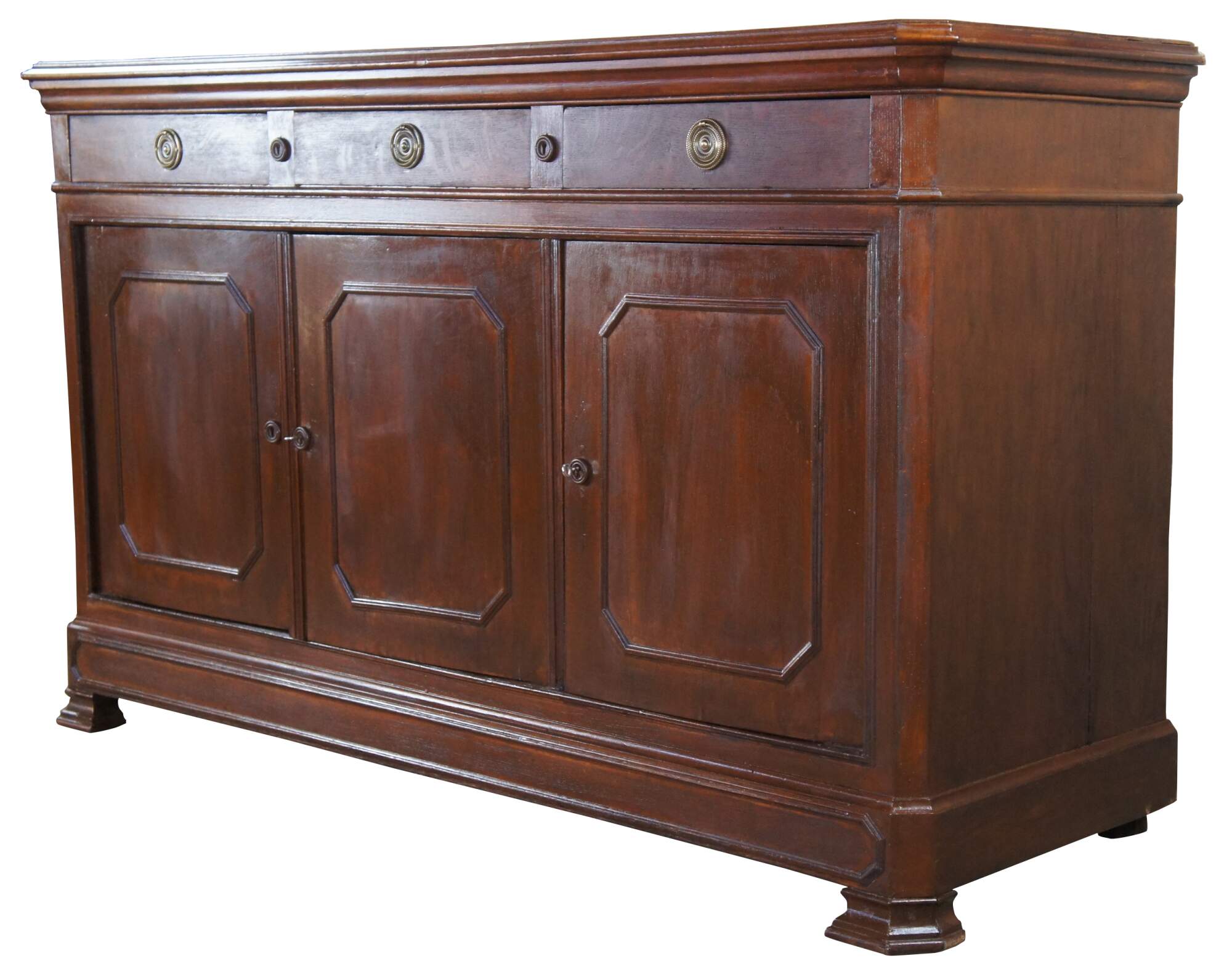 A lovely antique Louis Philipe style sideboard from Belgium. Made from quartersawn oak with three upper hand dovetailed drawers and lower cabinets with shelf. Cabinet moldings and lower apron feature a unique Octagonal design. Drawers are accented with brass ring pulls. Lower cabinets are lockable.