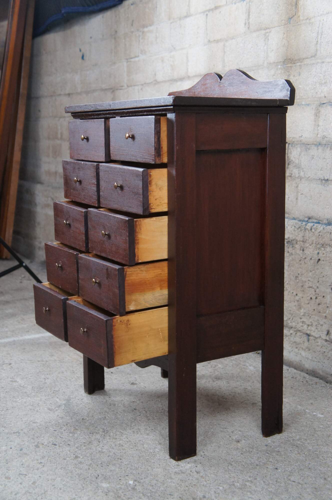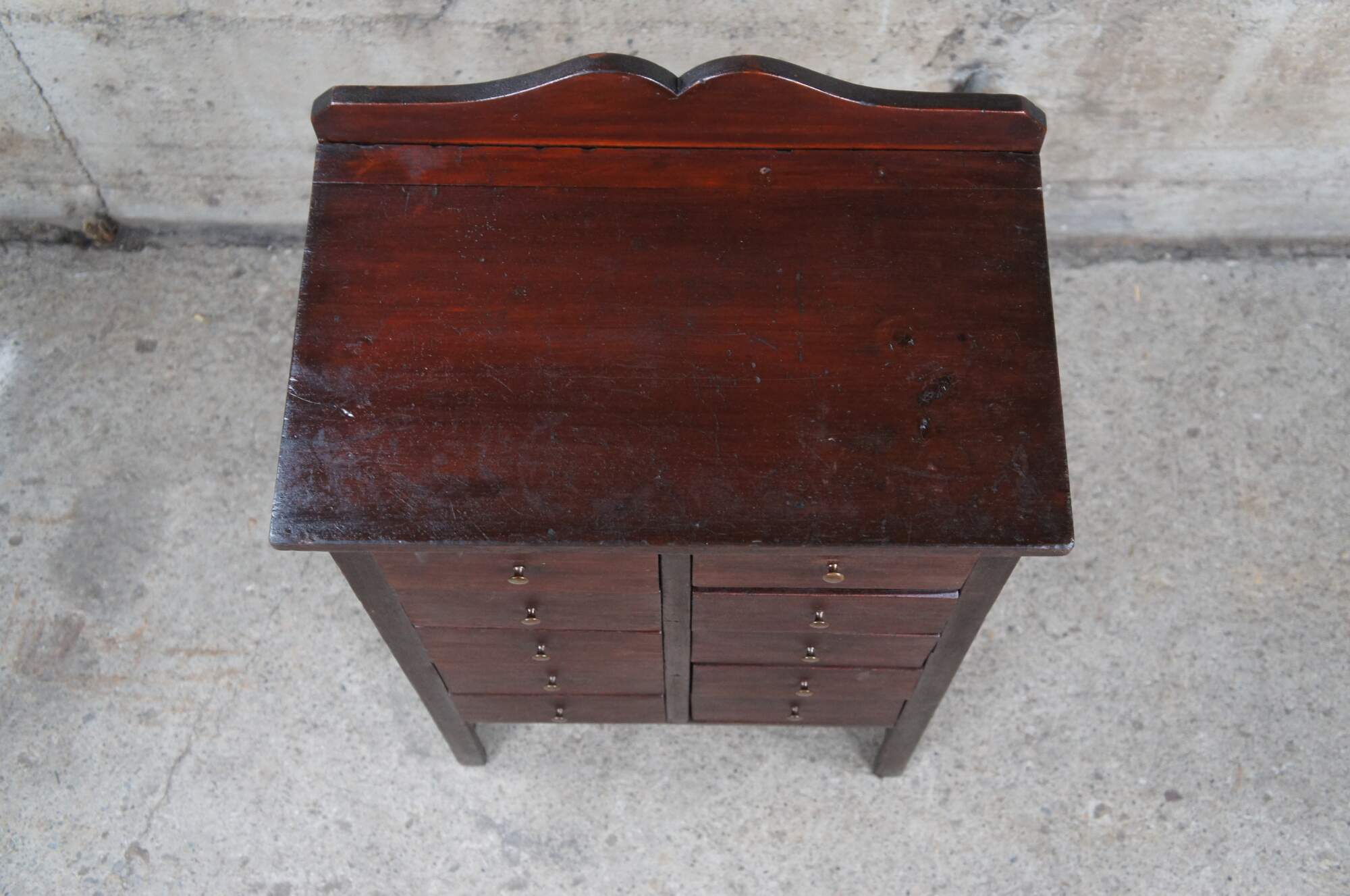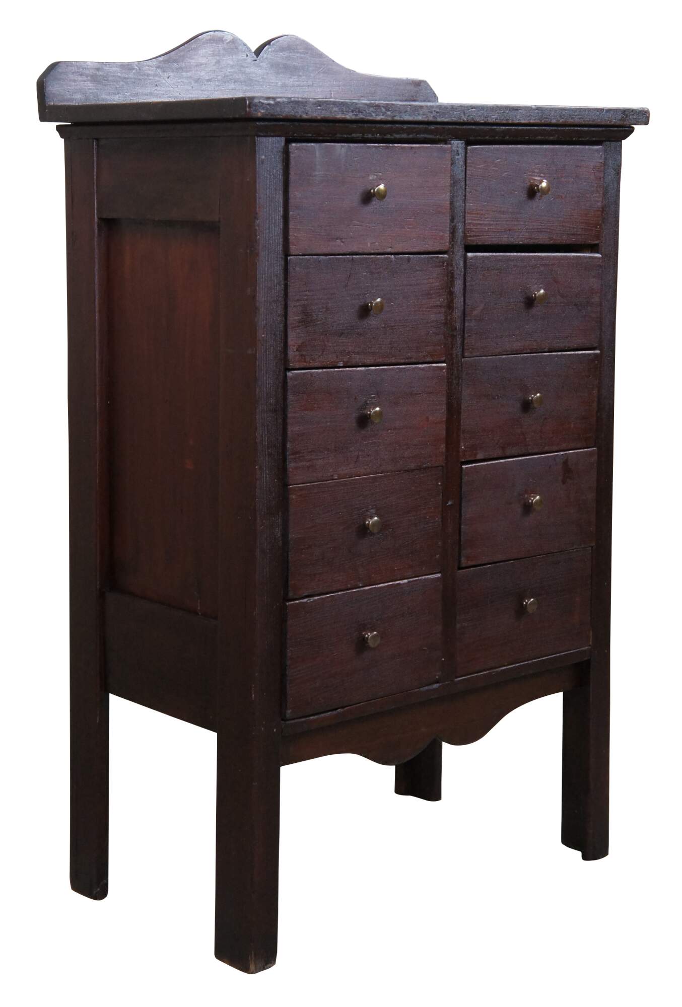 Vintage Apothecary cabinet or chest, circa 1940s. Made from pine with a mahogany color stain. Features a rectangular form with serpentine cut aprons and ten drawers with brass knobs.