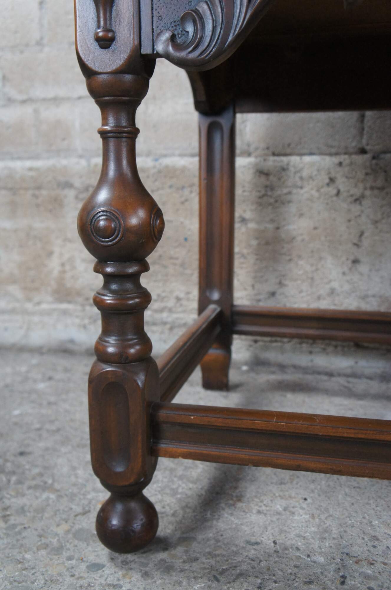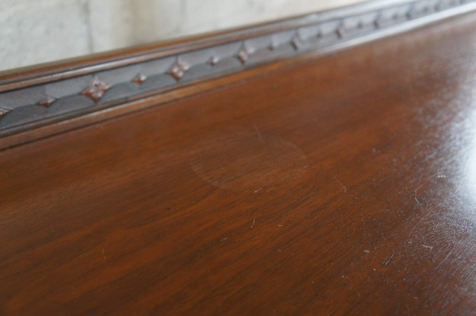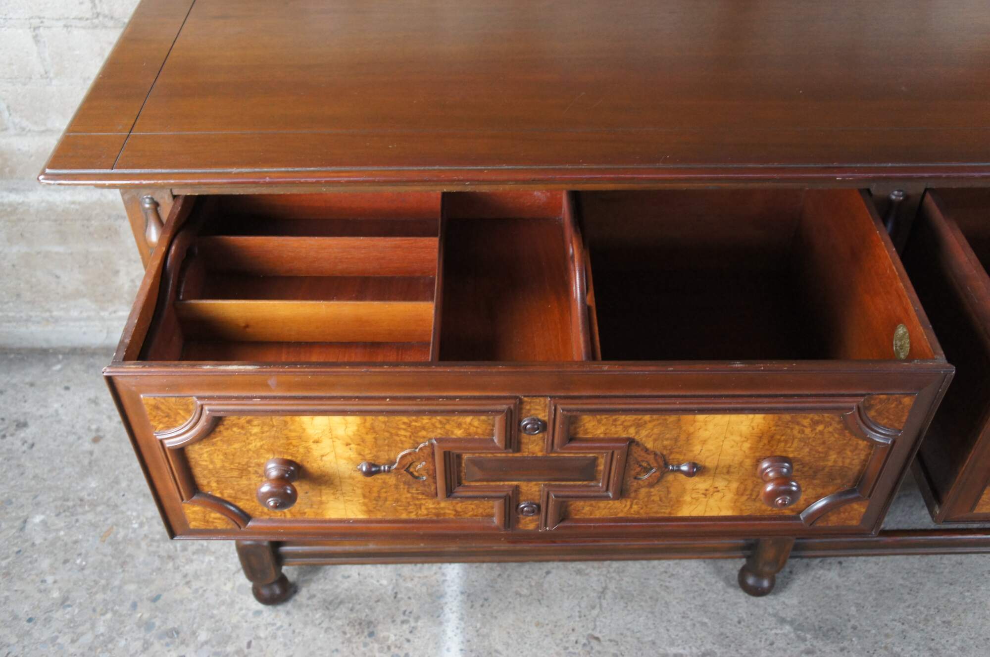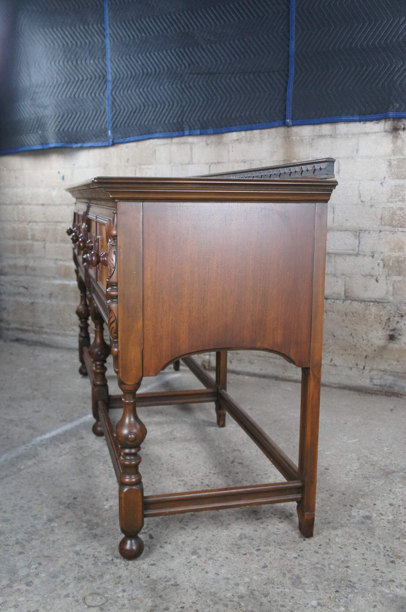 Antique Berkey & Gay Buffet or Server. A beautiful blend of William & Mary, Jacobean and Gothic styling. circa 1905-1929. Made of walnut featuring matchbook walnut burl panels. The two central drawers exhibit geometric molding, set between acanthus carved quarter cut finials resting over an apron of diagonal striping with lower ""S"" carved spandrals. The sideboard is supported by turned legs along the front with bun feet and straight legs along the rear with a tapered foot. Upper backsplash is removable with diamond carved accents. Interior of the drawer bares Berkey & Gay's first makers mark.