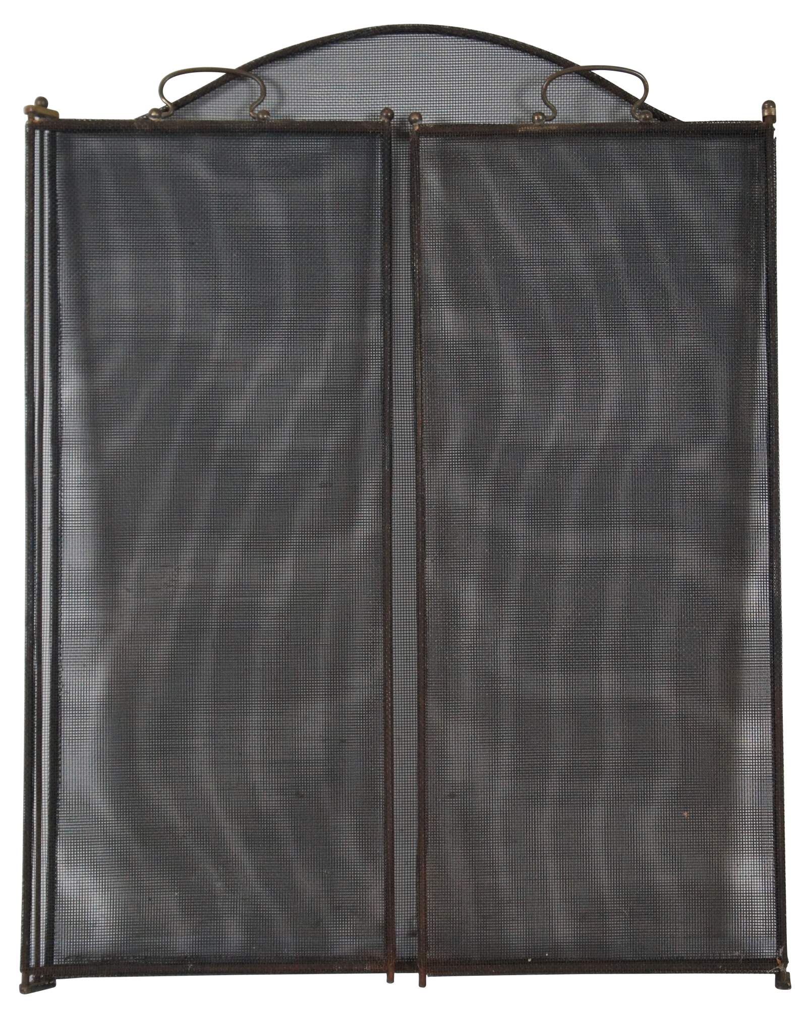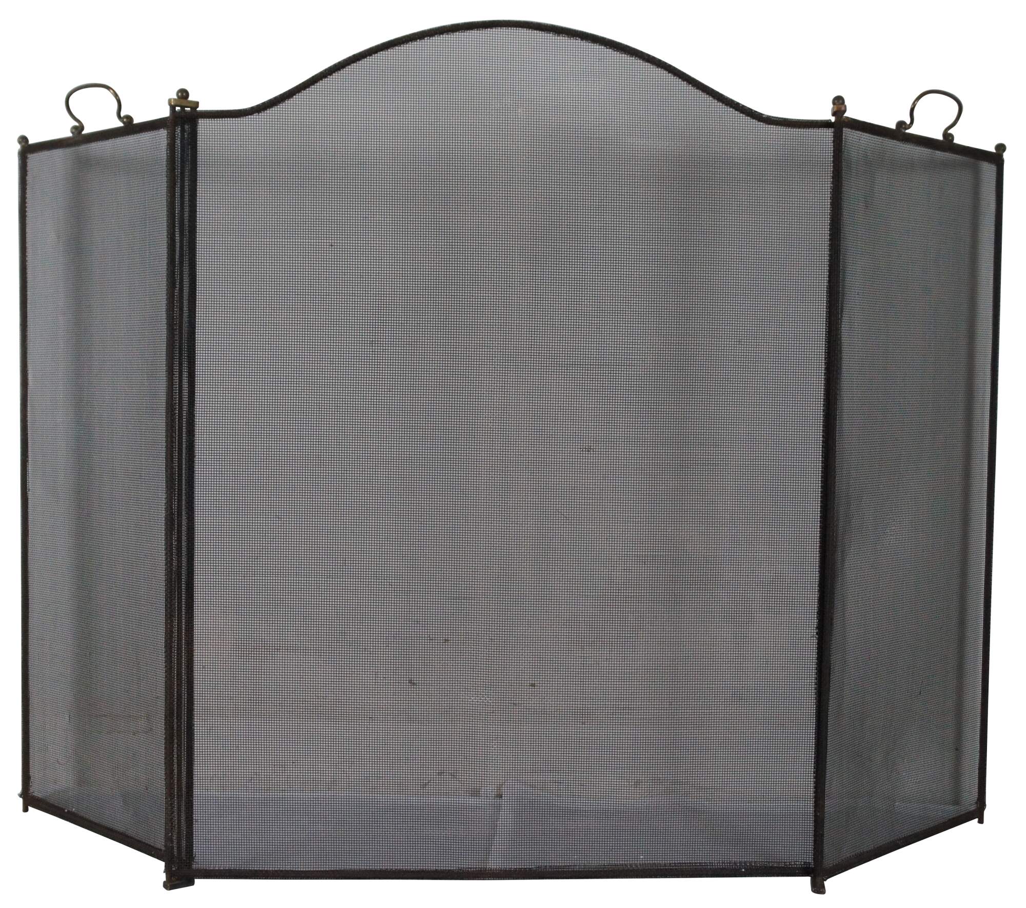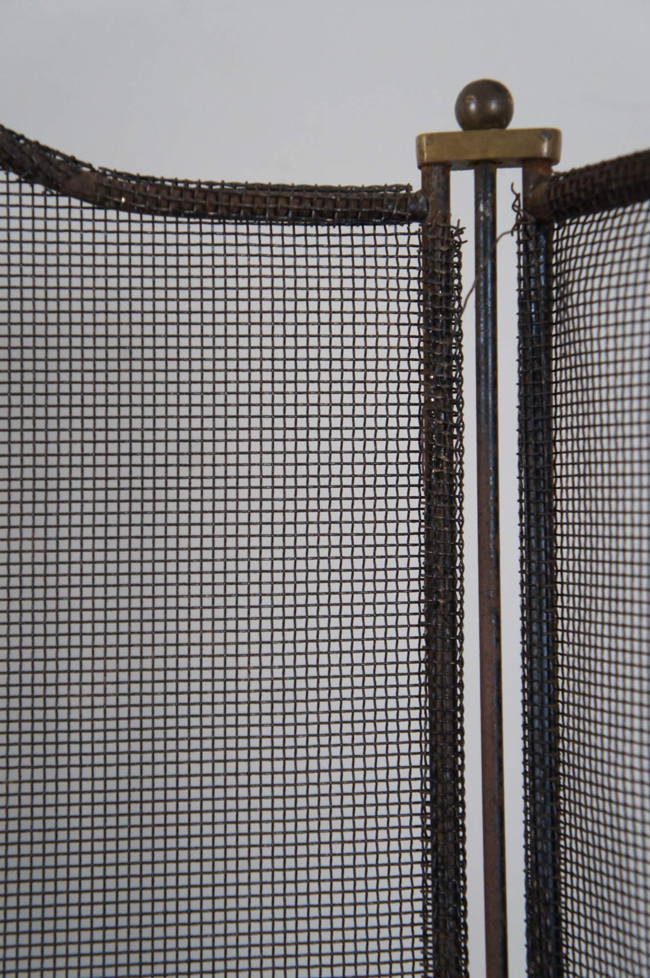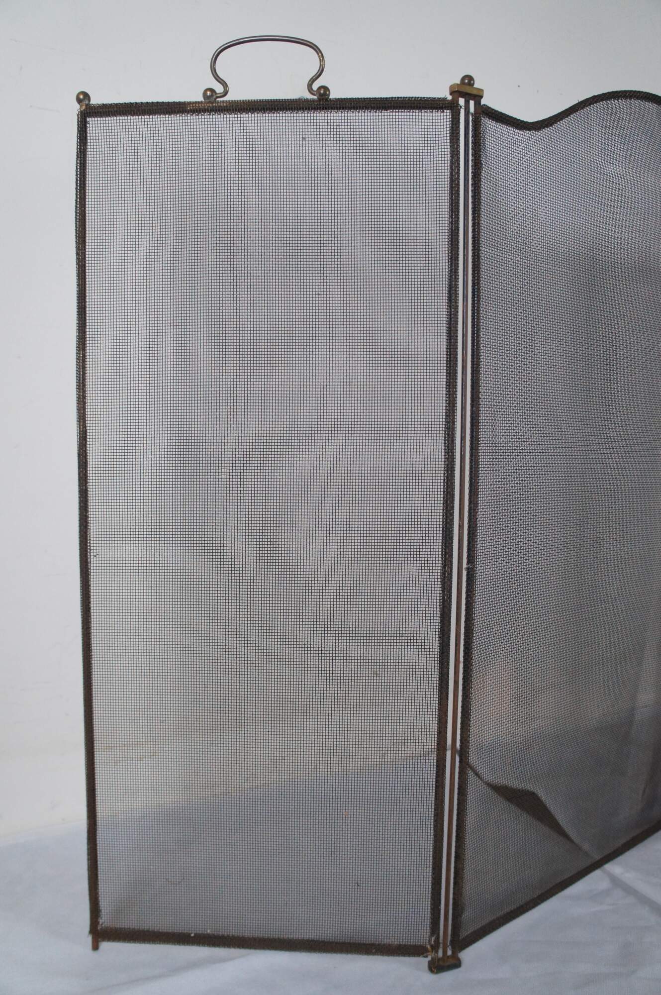 Antique three panel folding fireplace screen with arched top center panel, rectangular sides, brass frame and handles, and wire mesh screen.