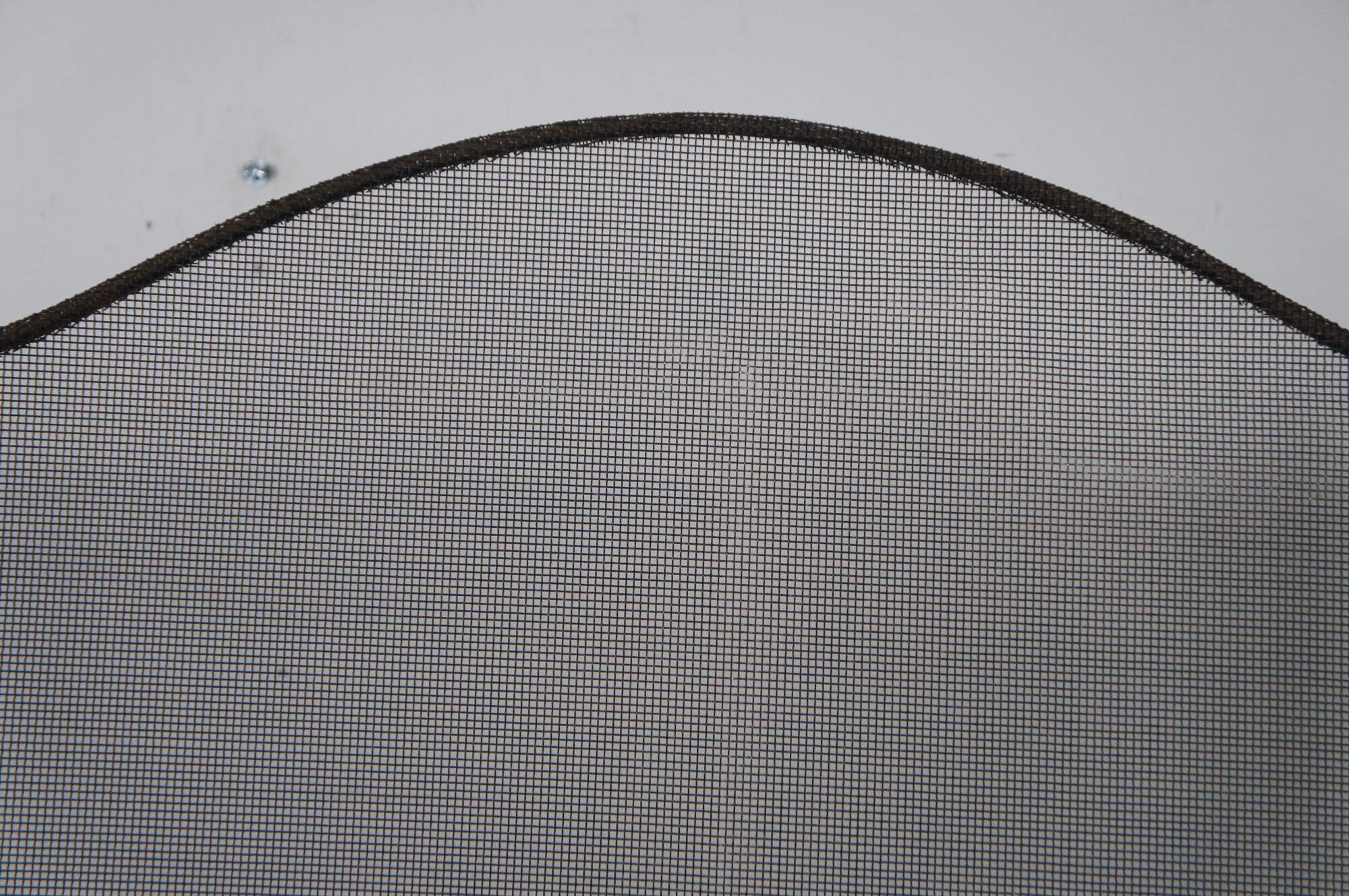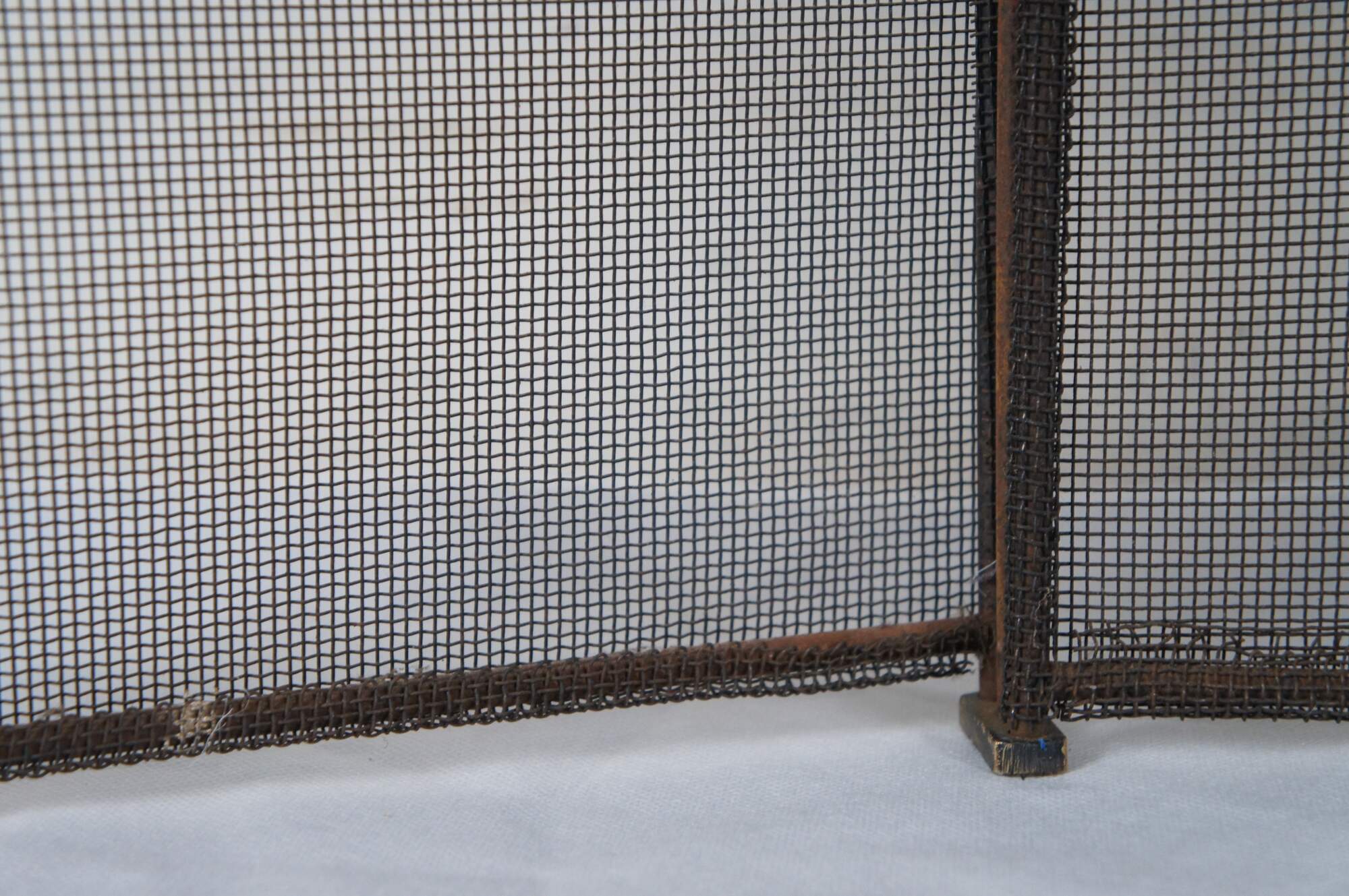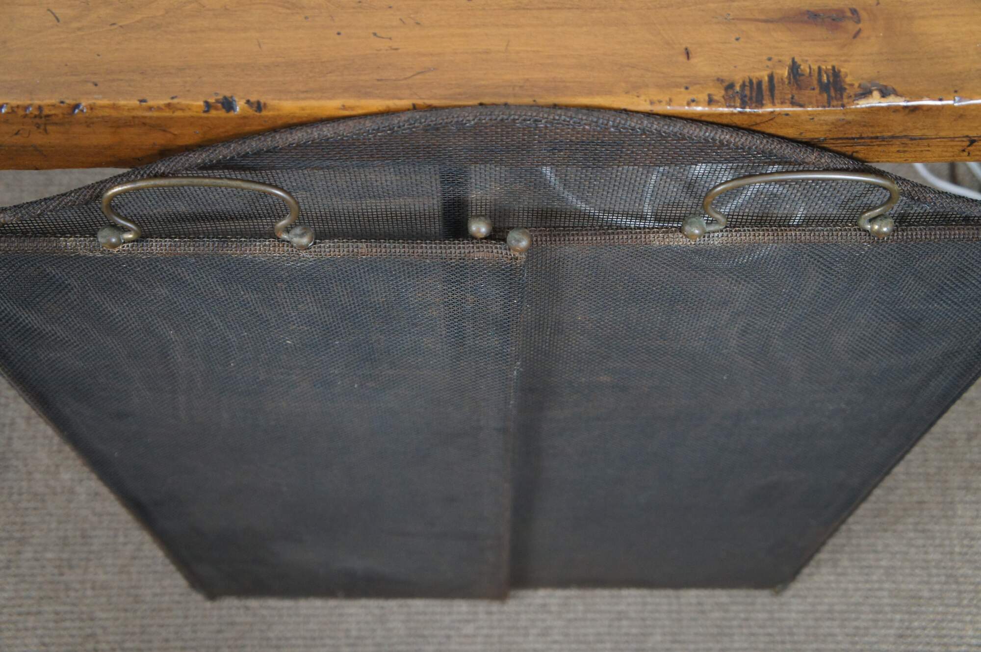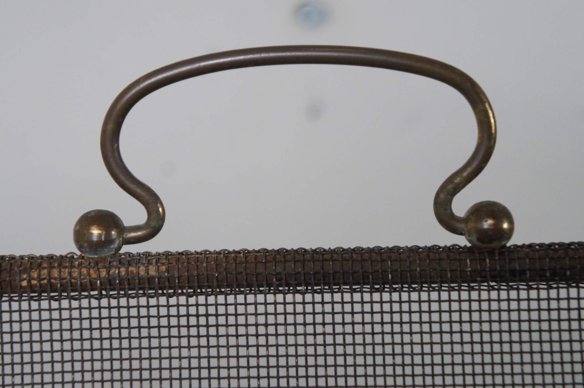 Antique three panel folding fireplace screen with arched top center panel, rectangular sides, brass frame and handles, and wire mesh screen.