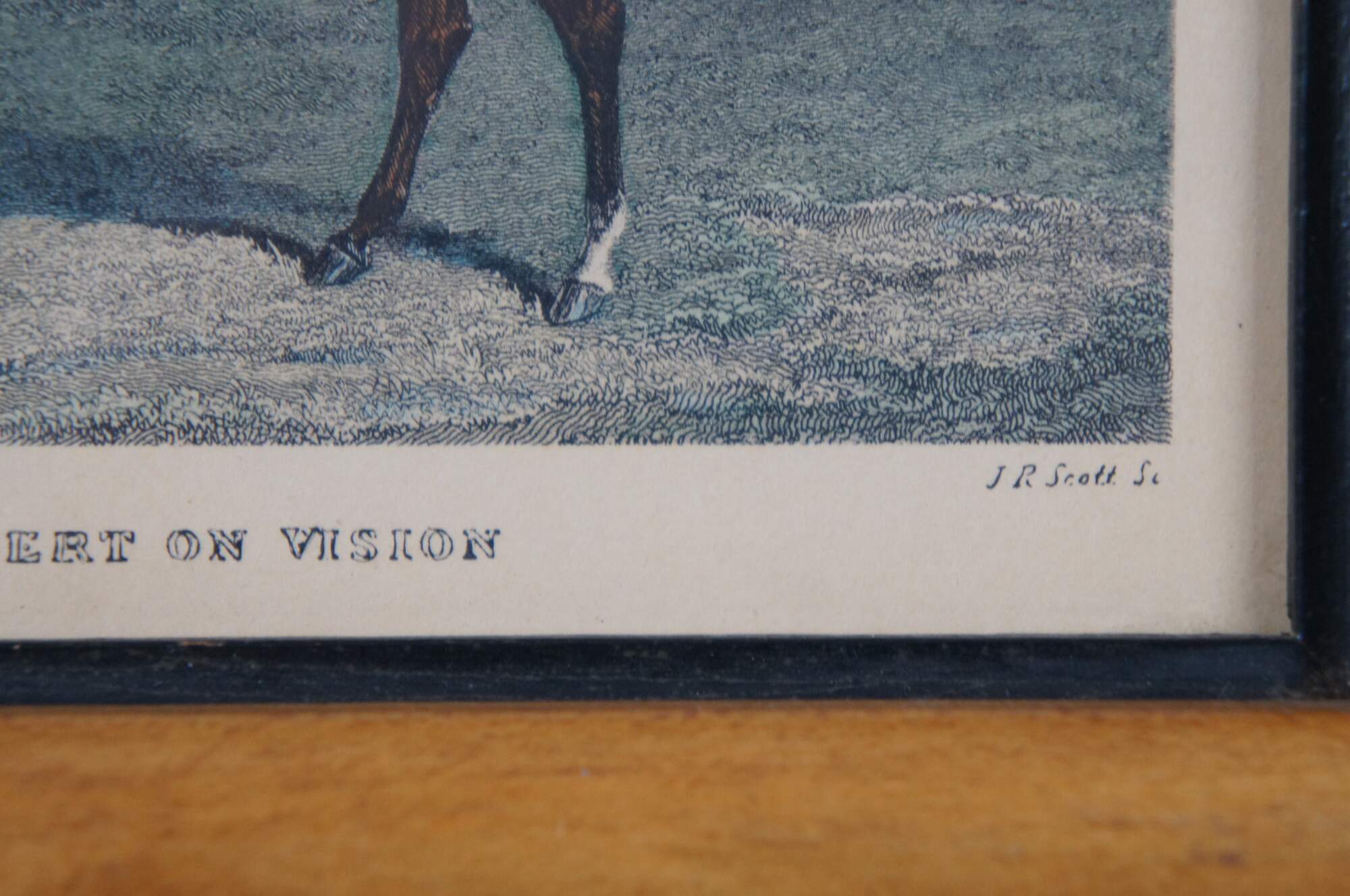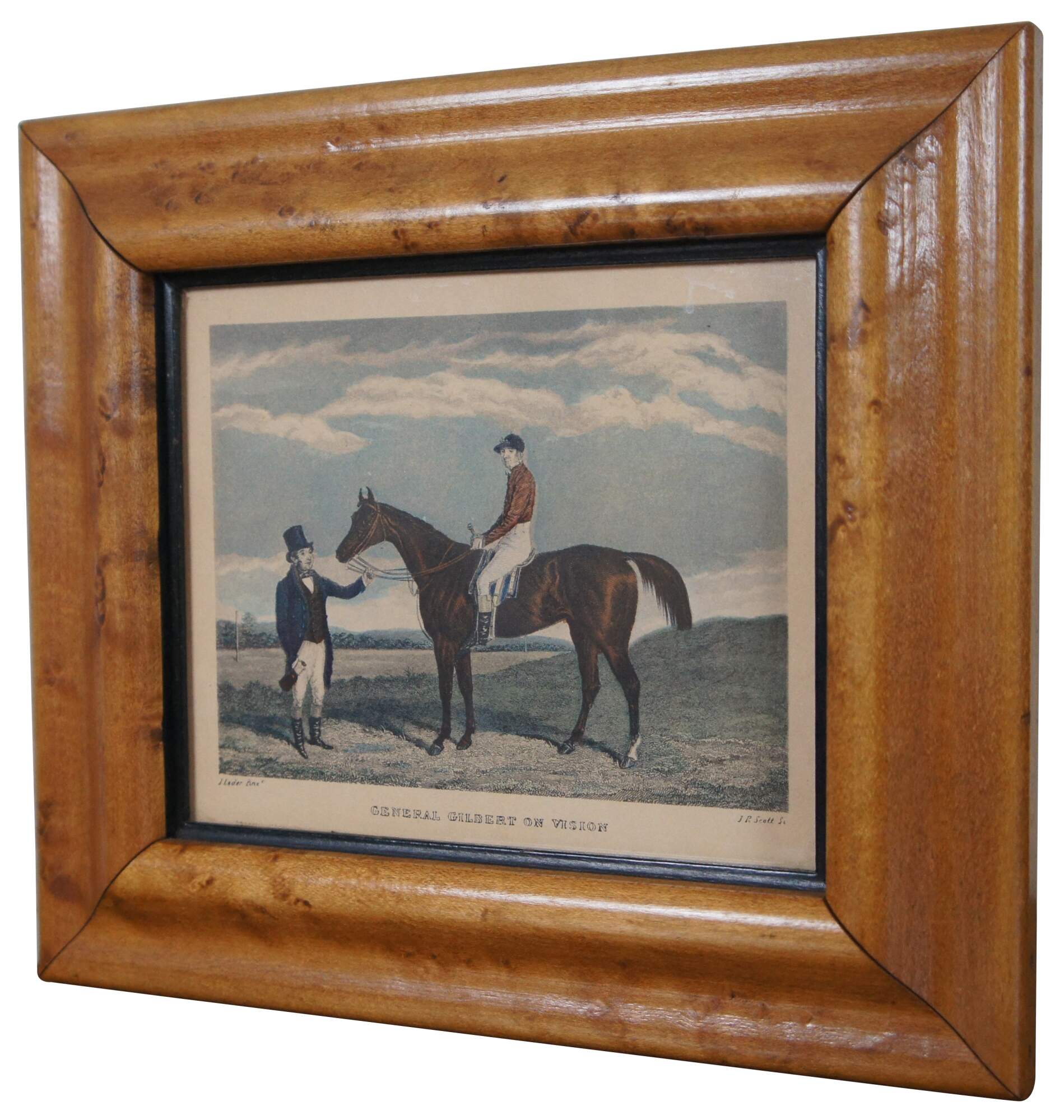 Antique 19th century hand colored equestrian engraving titled “General Gilbert on Vision,” showing General Gilbert in jockey or fox hunting attire mounted on a brown horse, held by a man servant holding a bottle of liquor. Original painted by James Loder; engraving by J.R. Scott. Published by Pittman, Warwick Square, London. Antique walnut frame.