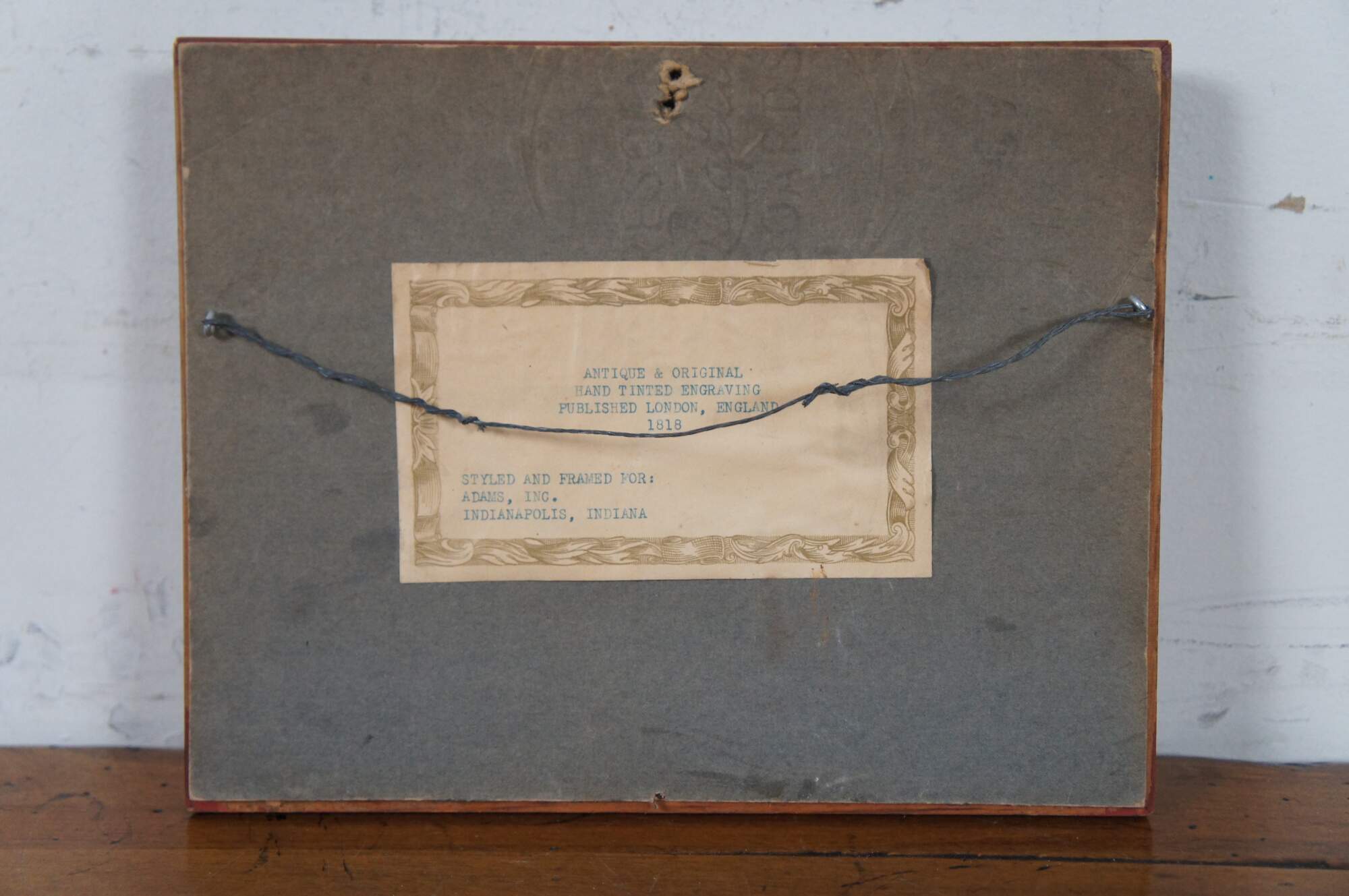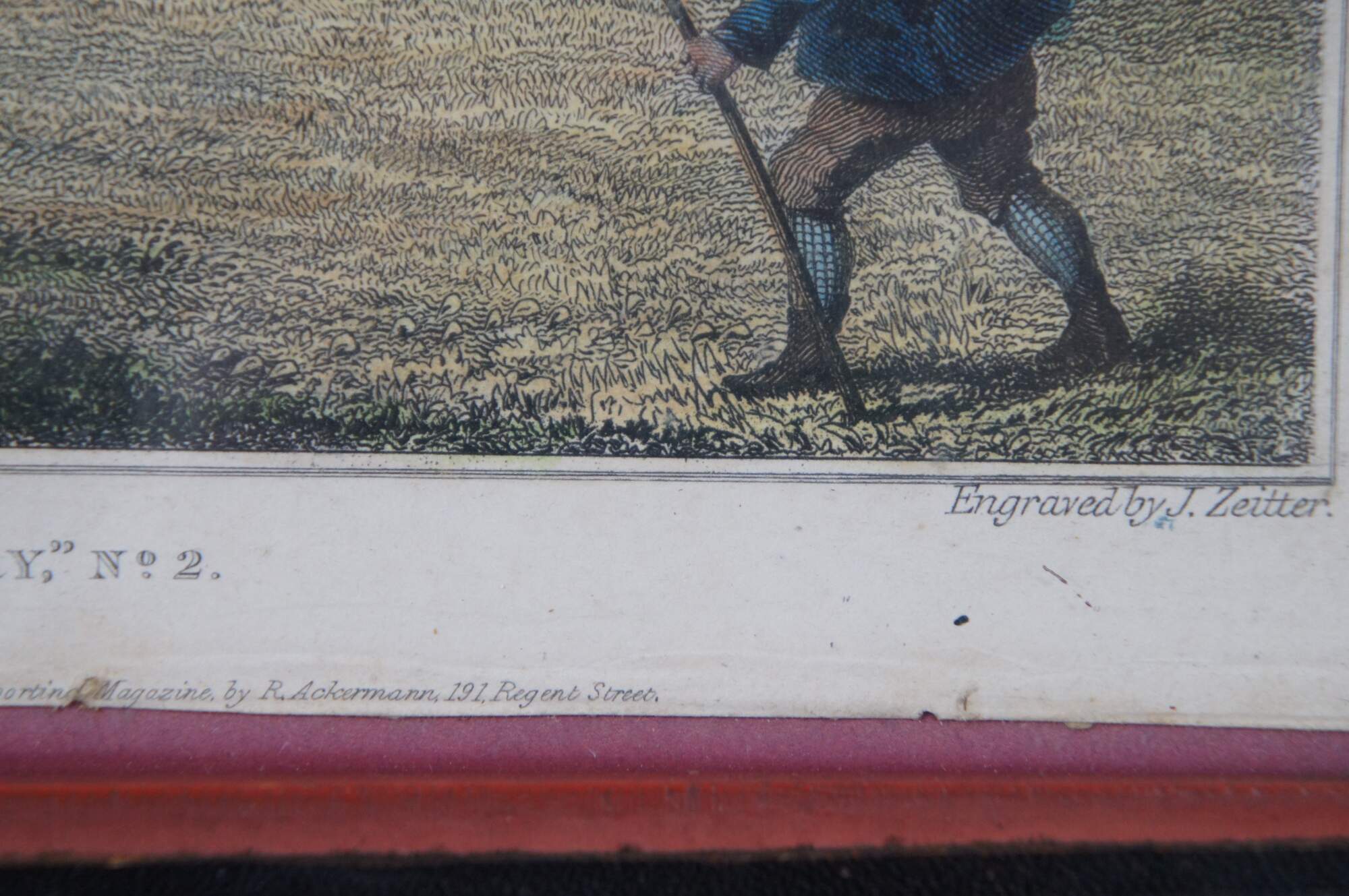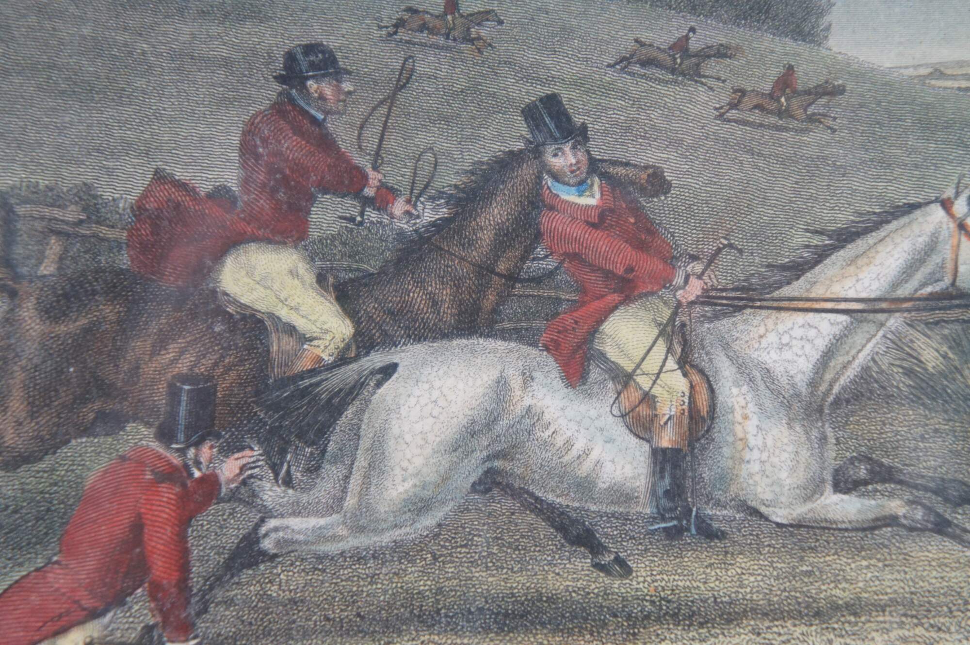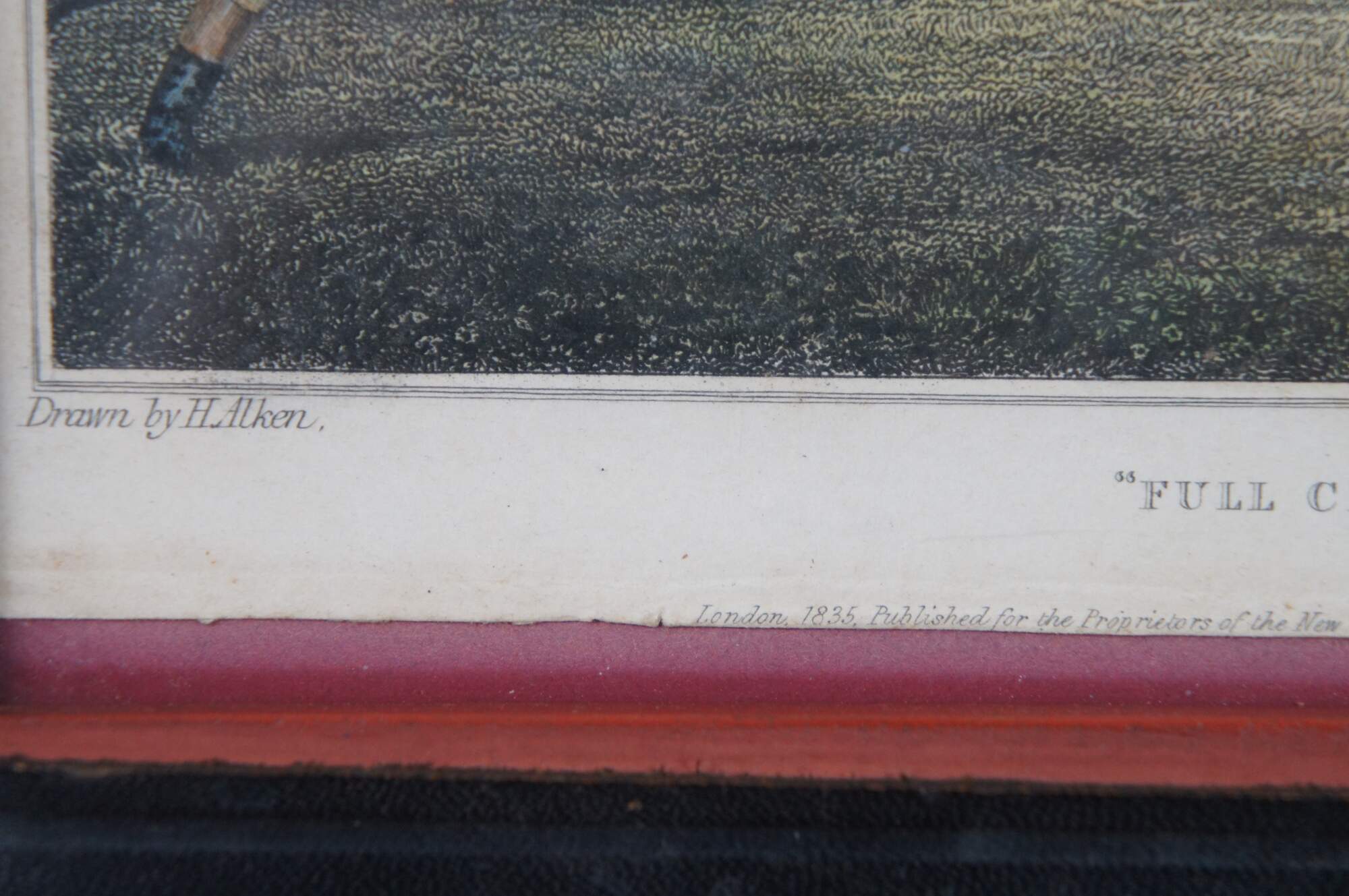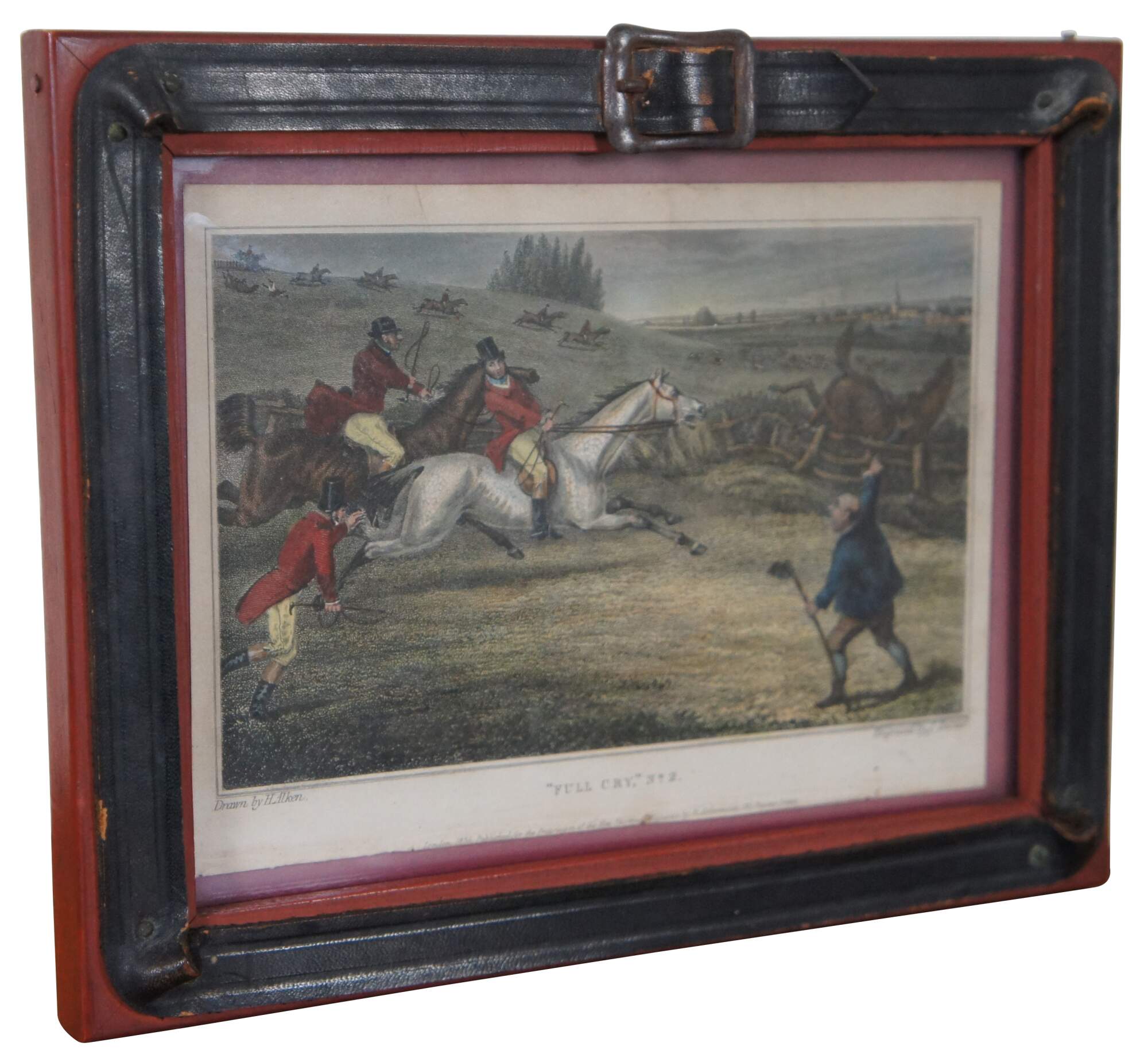Antique 19th century hand colored fox hunt engraving titled “Full Cry No. 2,” showing a landscape of fox hunters, one of whom has fallen off and chases his horse on foot. Framed in a unique belt buckle bordered frame. Drawn by H. Alken; engraved by J. Zeitter; published in London 1835 for the proprietors of the “New Sporting Magazine” by R. Ackermann.