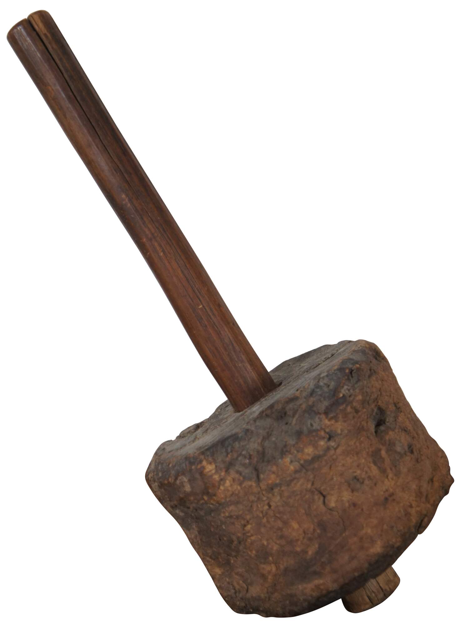 Antique hand crafted primitive / rustic wooden mallet with heavily distressed round burl wood head and handle.