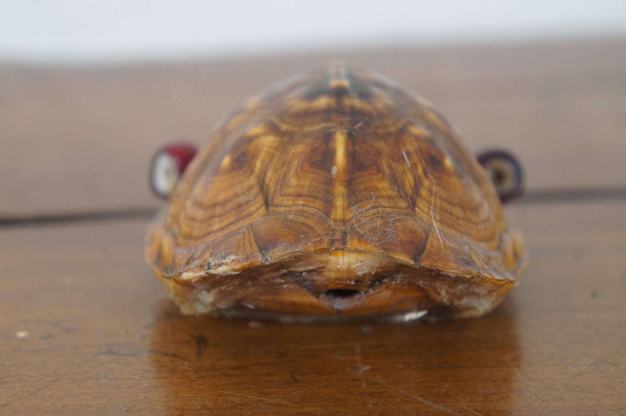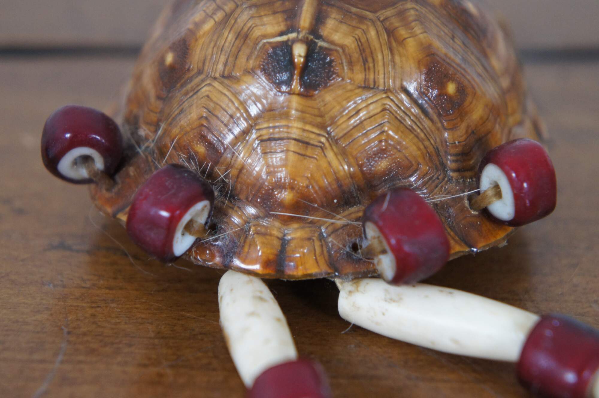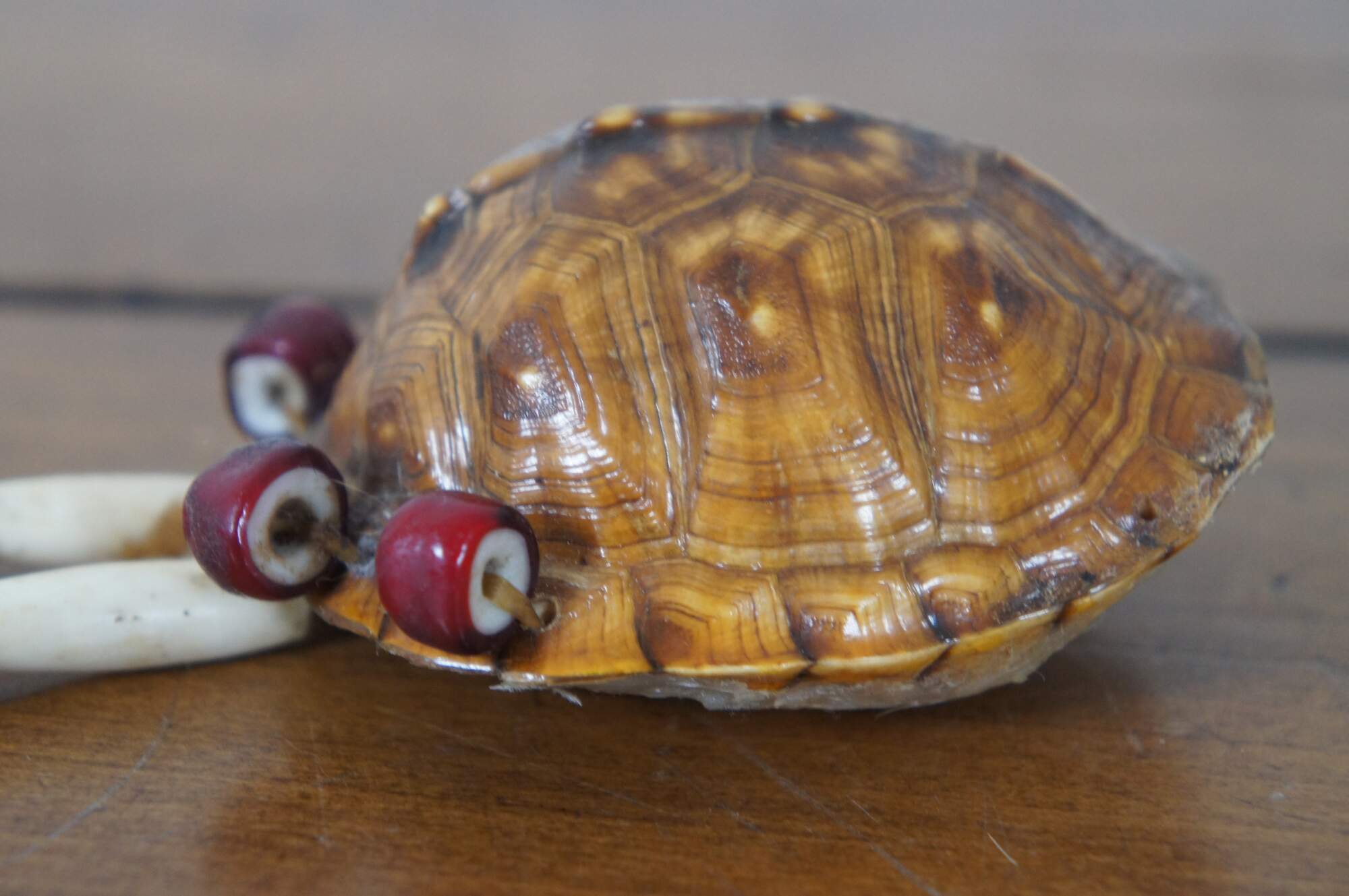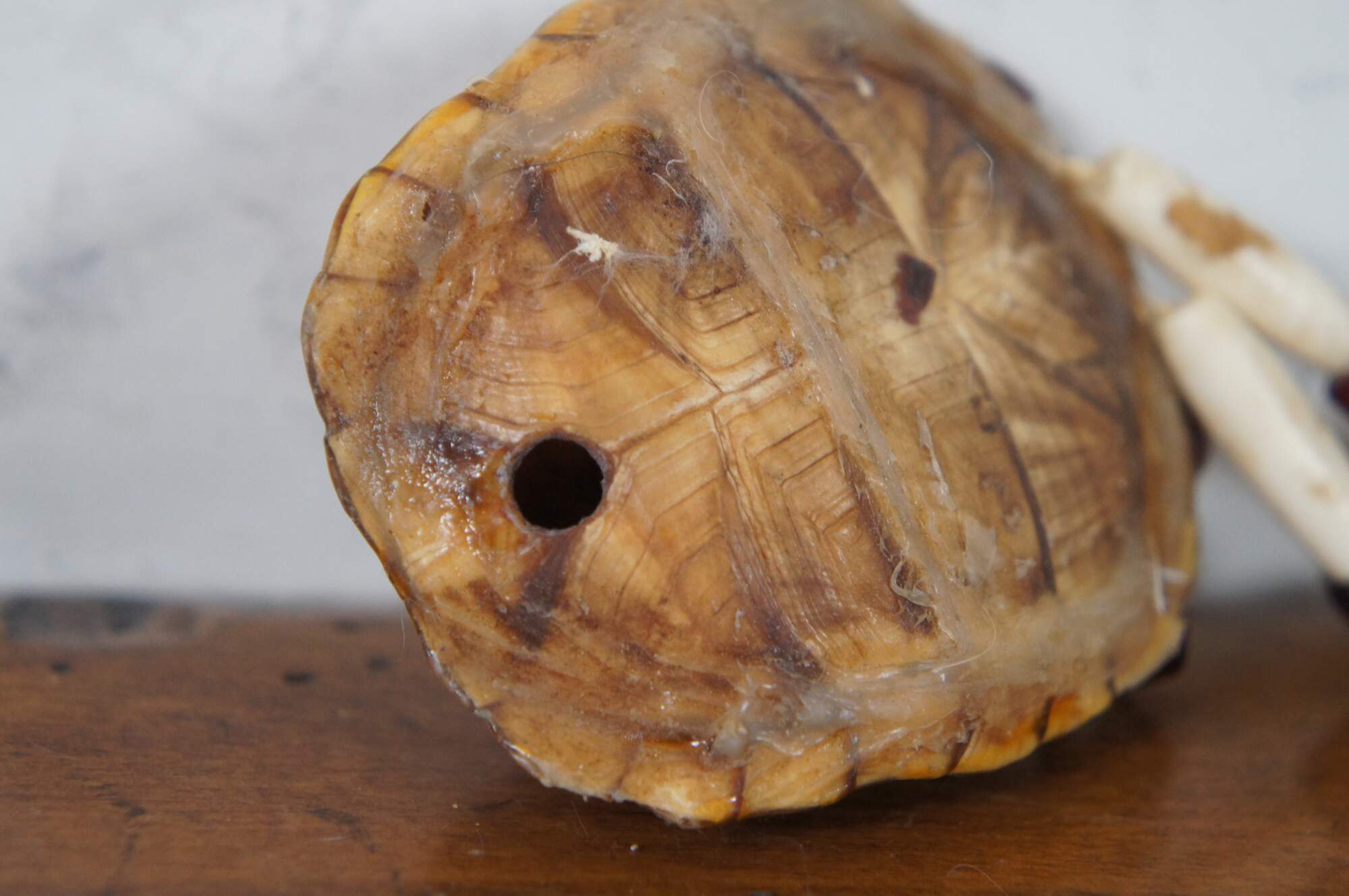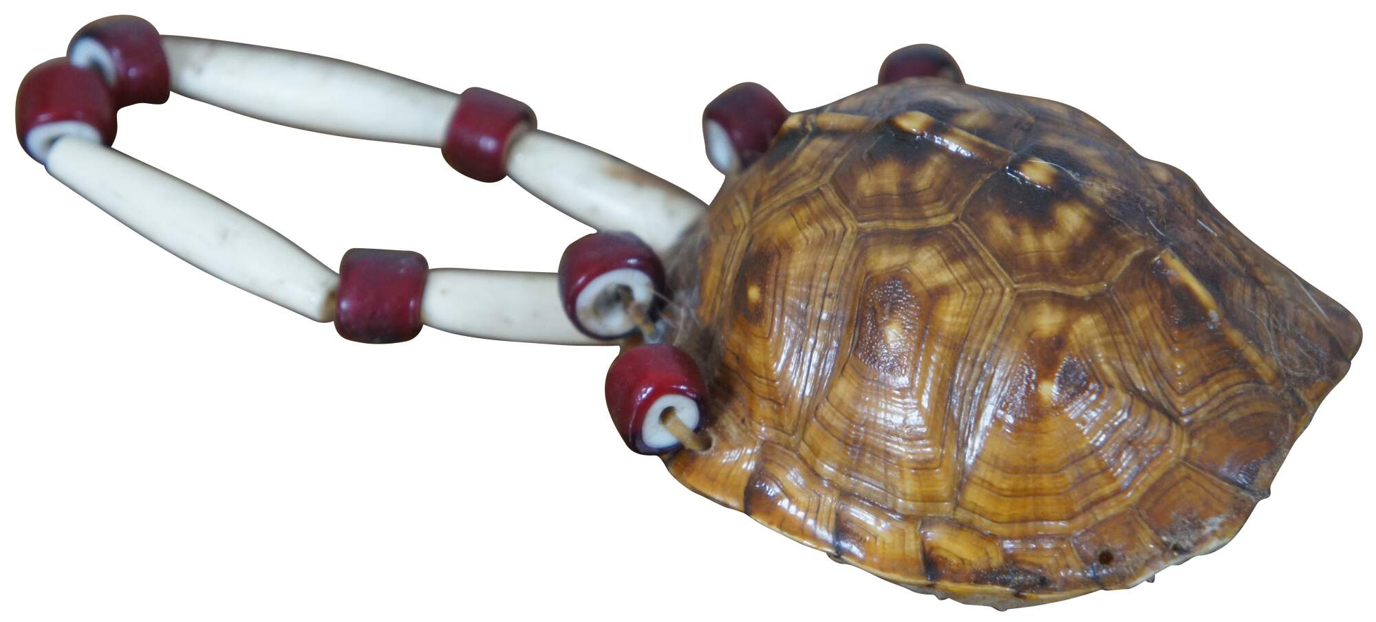 Vintage piece of Native American dance regalia fashioned from the taxidermy shell of some variety of box turtle shell with beaded accents. Hole in the back suggests it was once the top of a ceremonial rattle. As is, could be hung decoratively from clothing or on a wall.