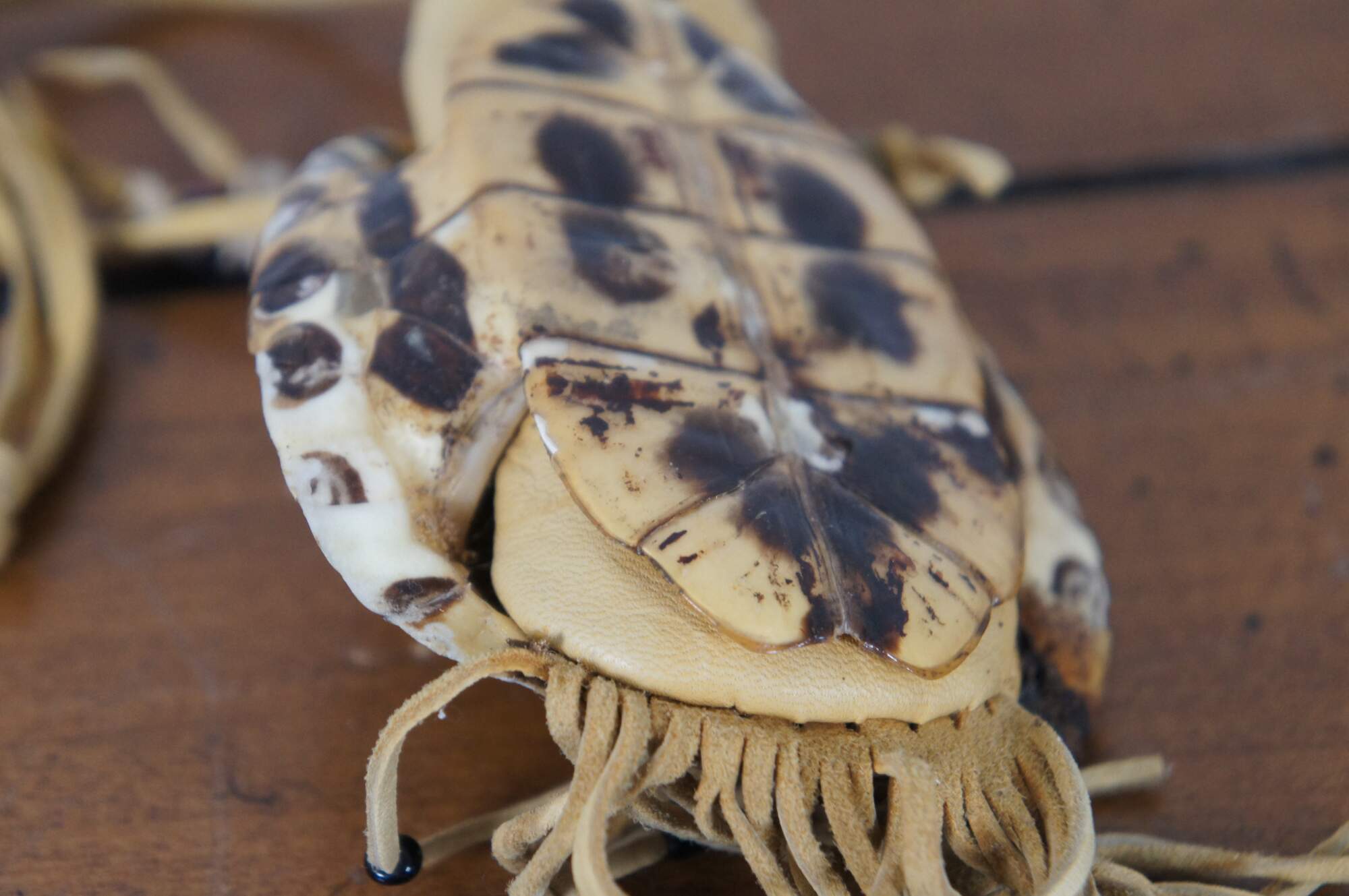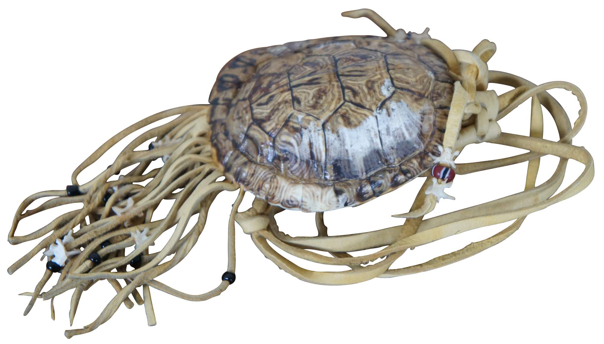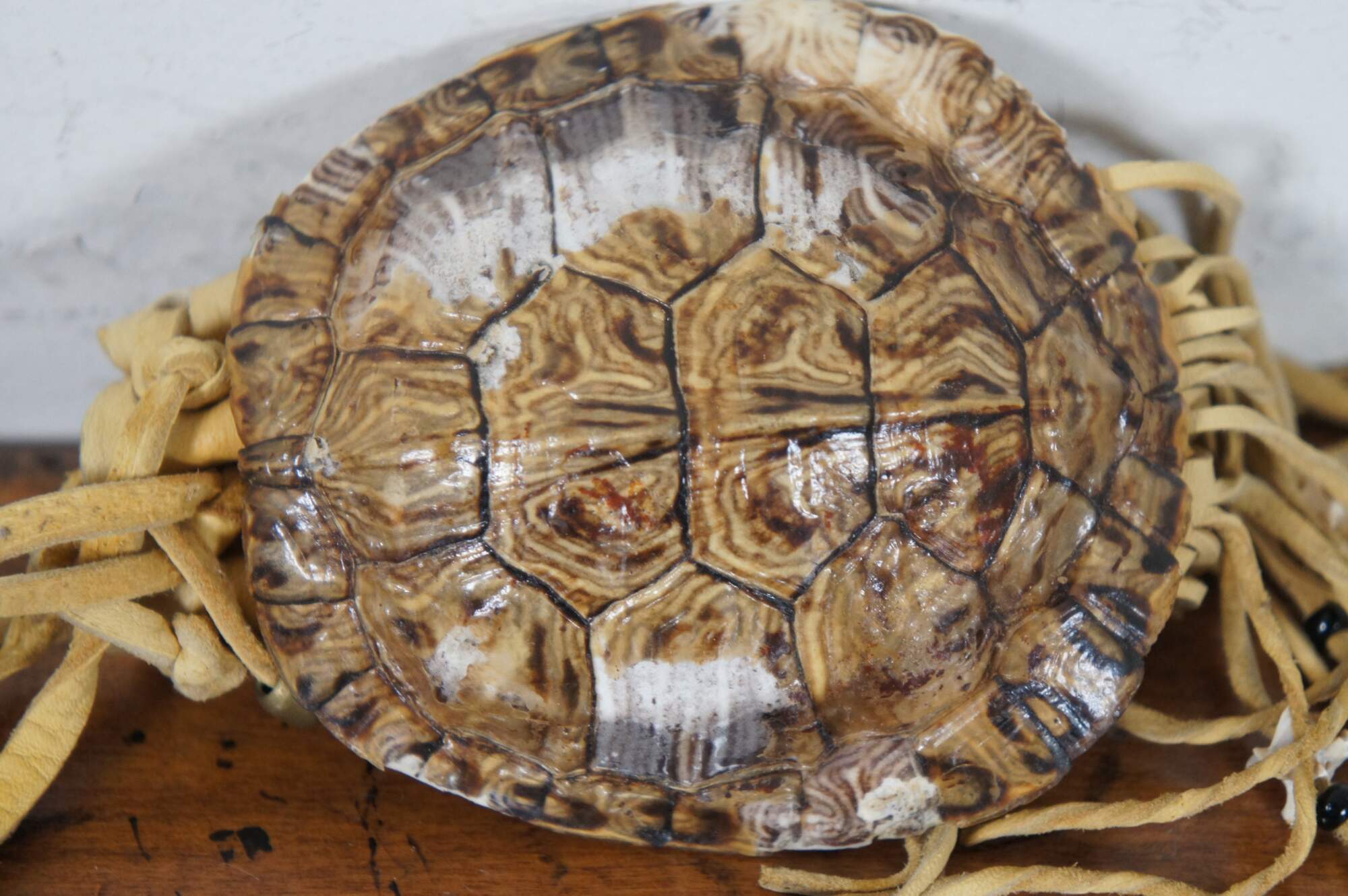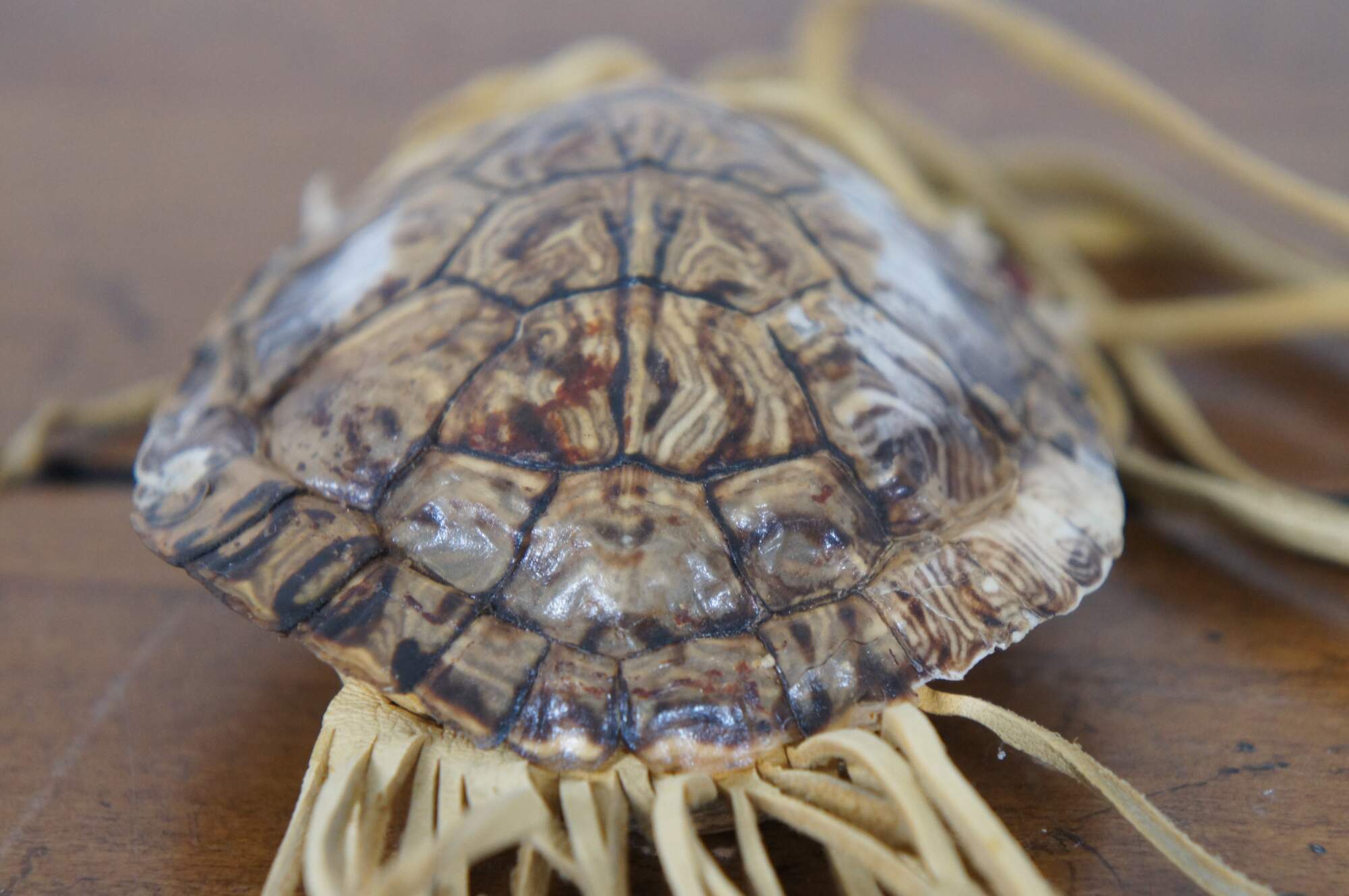 Vintage Native American medicine bag or pouch fashioned out of the shell of a box turtle and buckskin leather with cords and fringe accented with beads and miniature vertebrae bones.