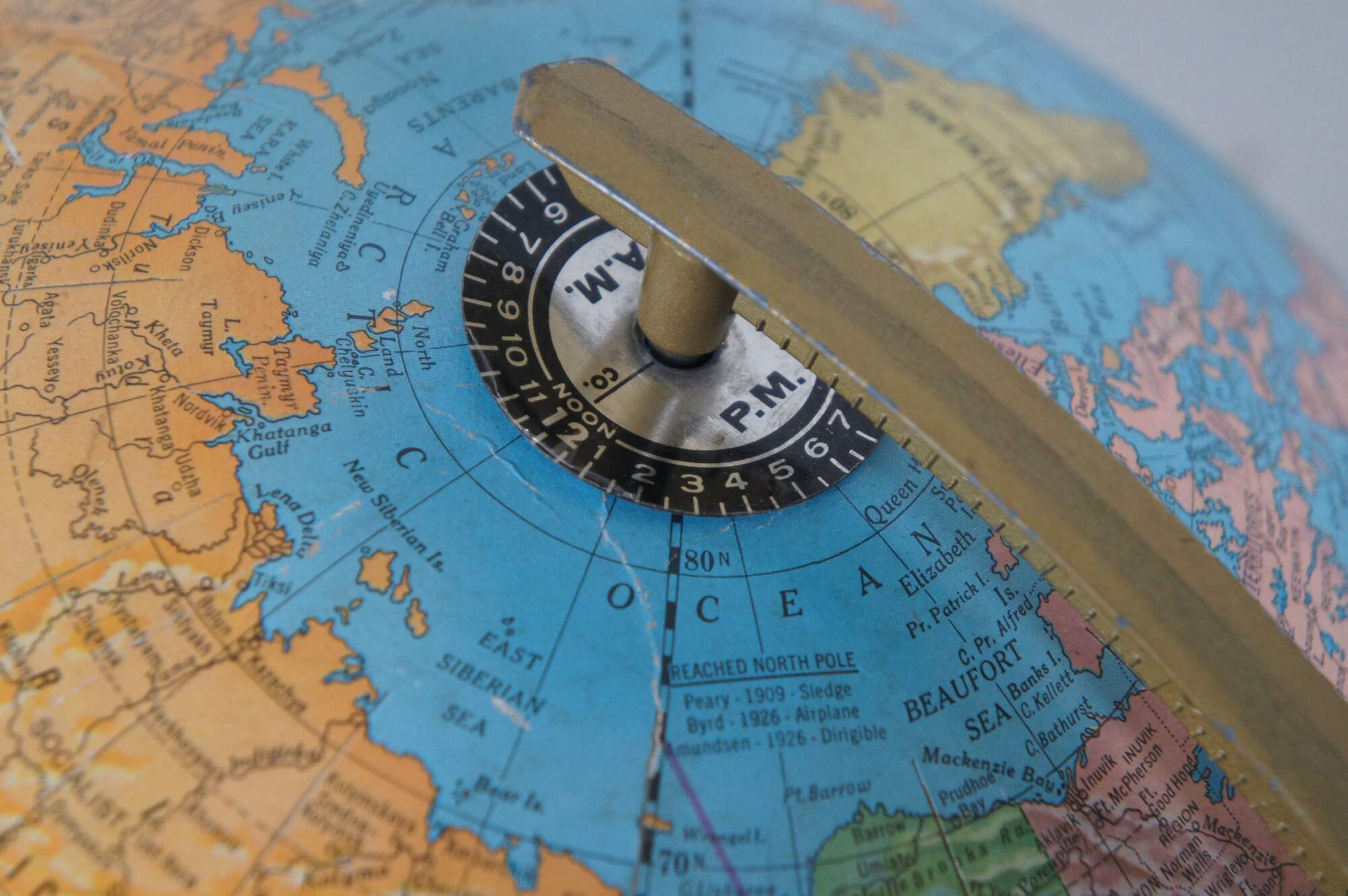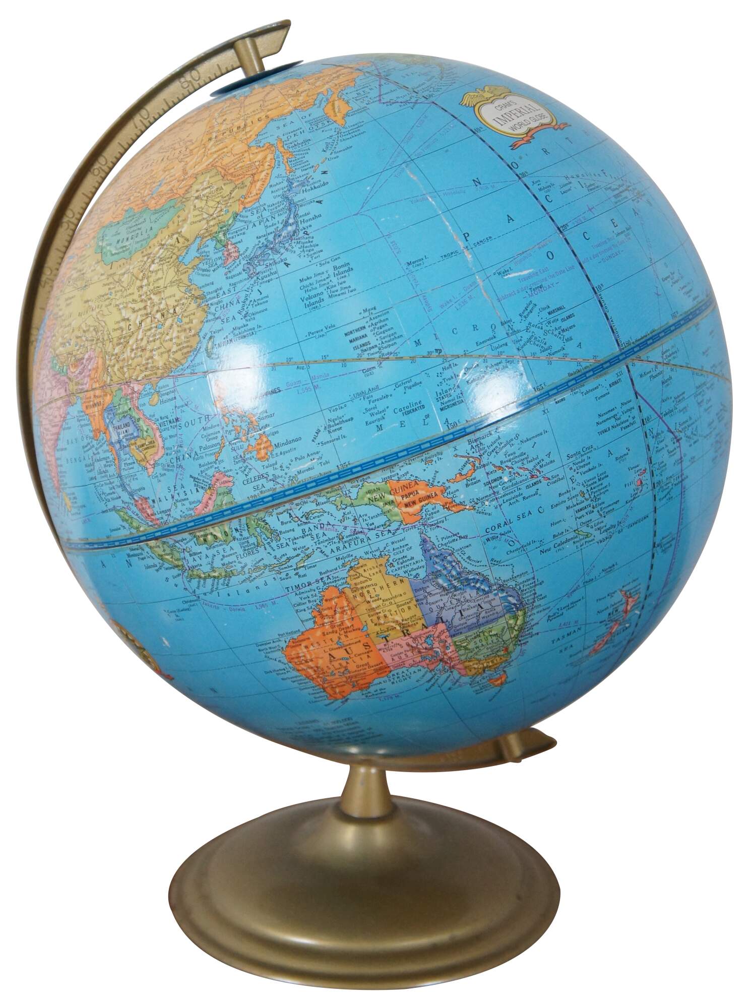 Vintage mid to late 20th century George Crams Imperial World Globe with multicolored countries, set on a brass / gold metal stand.