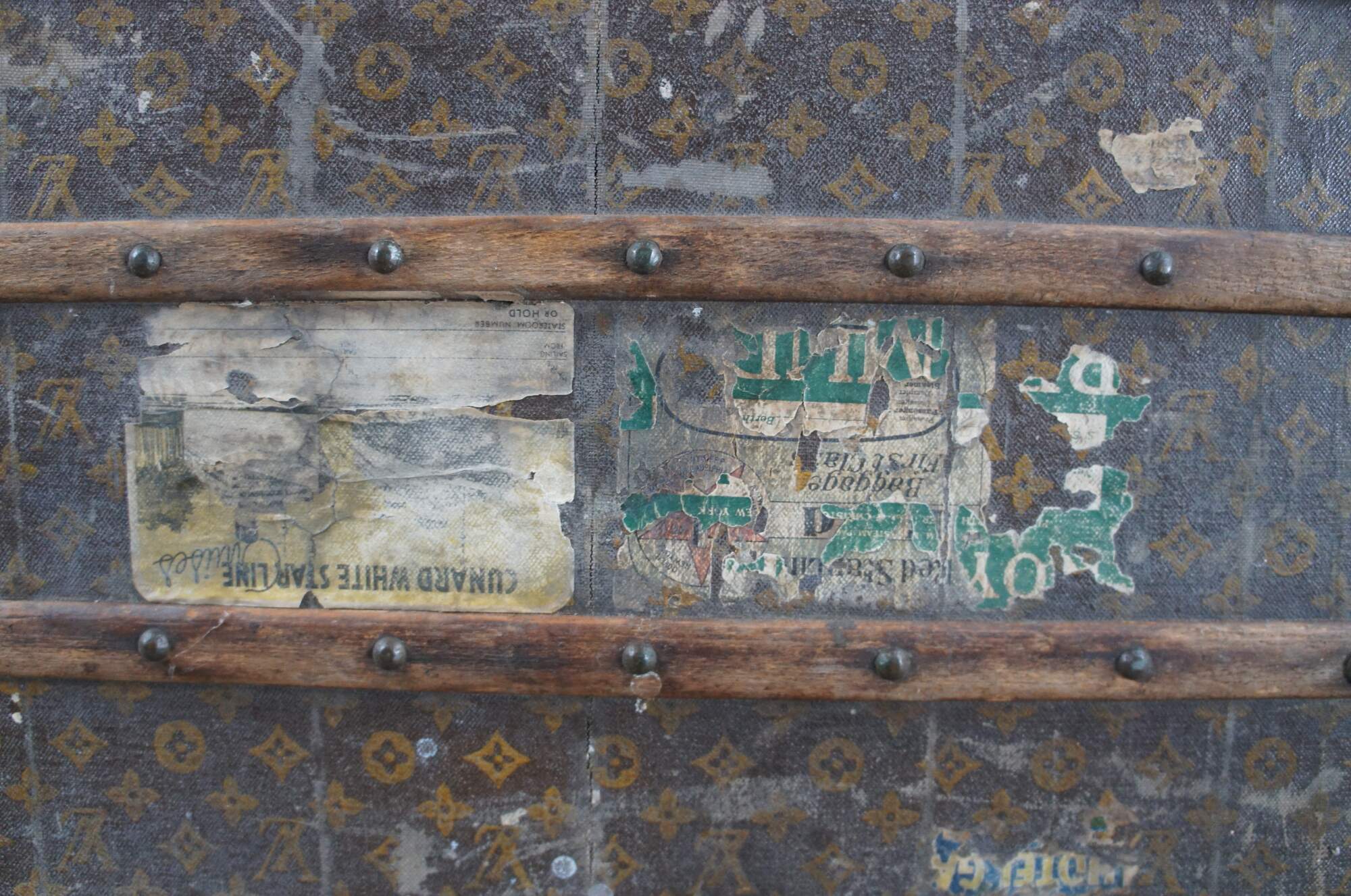 An original early 20th century Louis Vuitton steamer trunk, circa 1910s. Feautures the original monogrammed canvas with quilted top along the interior. Marked along the interior LOUIS VUITTON, 1. RUE SCRIBE PARIS, 149. NEW BOND ST. LONDON' Serial number 190221. The store on Bond St. in London was established in 1885. This beautiful chest is in original unrestored condition, rich with character, baring stickers and labels from traveling the world. Belonged to Mrs C A Schanok of Oakwood, Ohio. The schanok family were builders in the Dayton, Ohio region