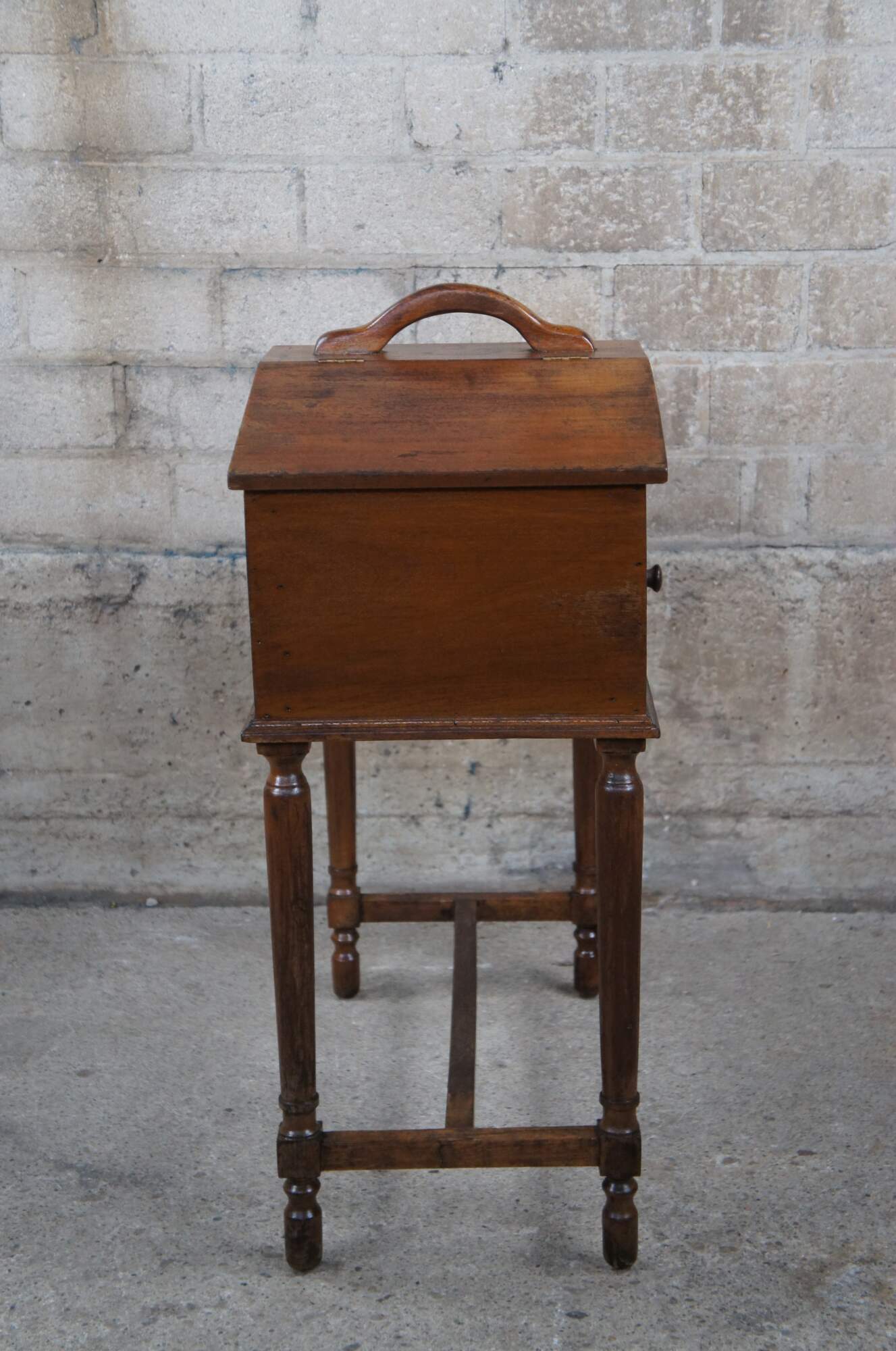 An unusual early 20th century sewing box or stand. Drawing inspiration from William & Mary styling. A rectangular form made from walnut with a house shaped body featuring two lidded boxes for storage, a handle for moving and two petite drawers at the center. The cabinet is supported by tapered and turned legs connected by an H stretcher with peg feet. The unique shape and design allow for it to also be used as an end table or smokers cabinet.