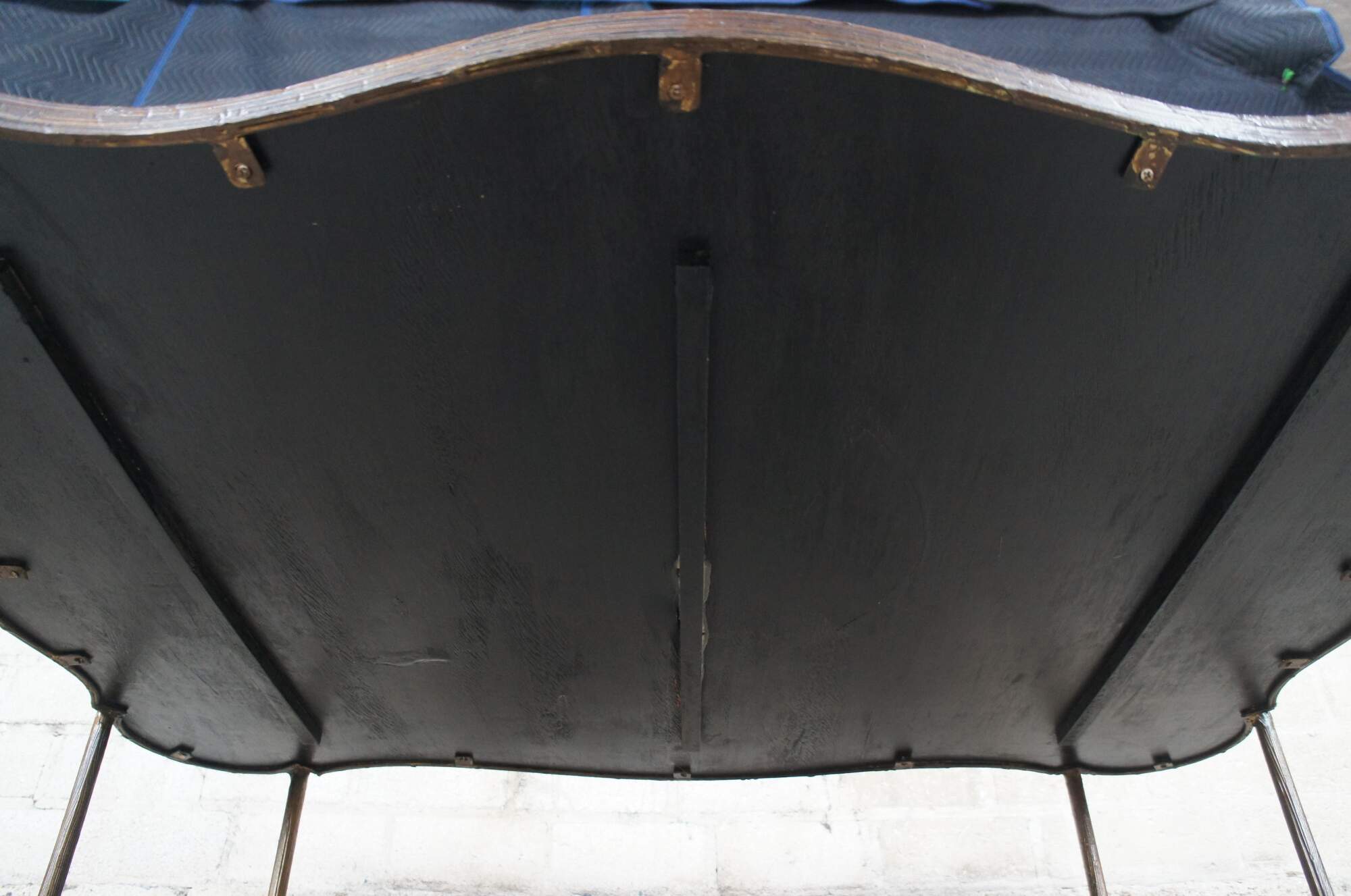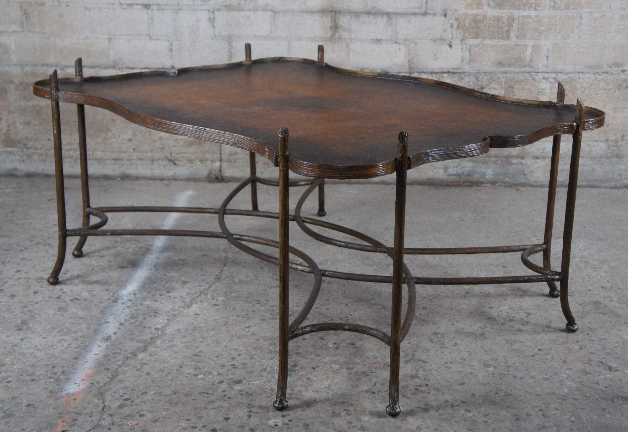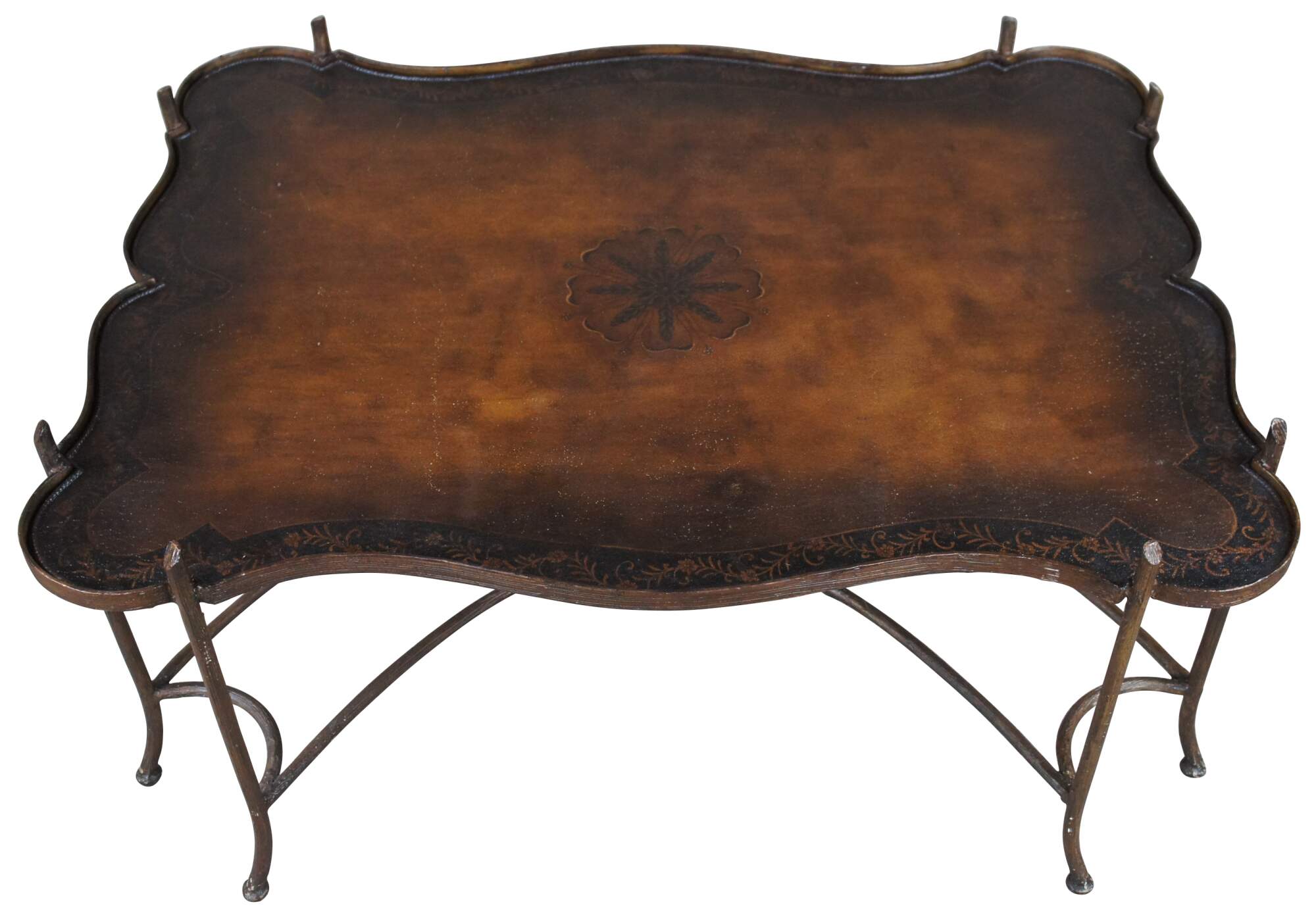 This stunning gilt iron faux bois coffee table features a double curved x-base, double corner faux bois legs, and a beautiful tole painted scalloped tray style top. The top is painted in a faux leather finish with a central stylized flower design and gold leaf and flower vines in the black border around the outer edge.