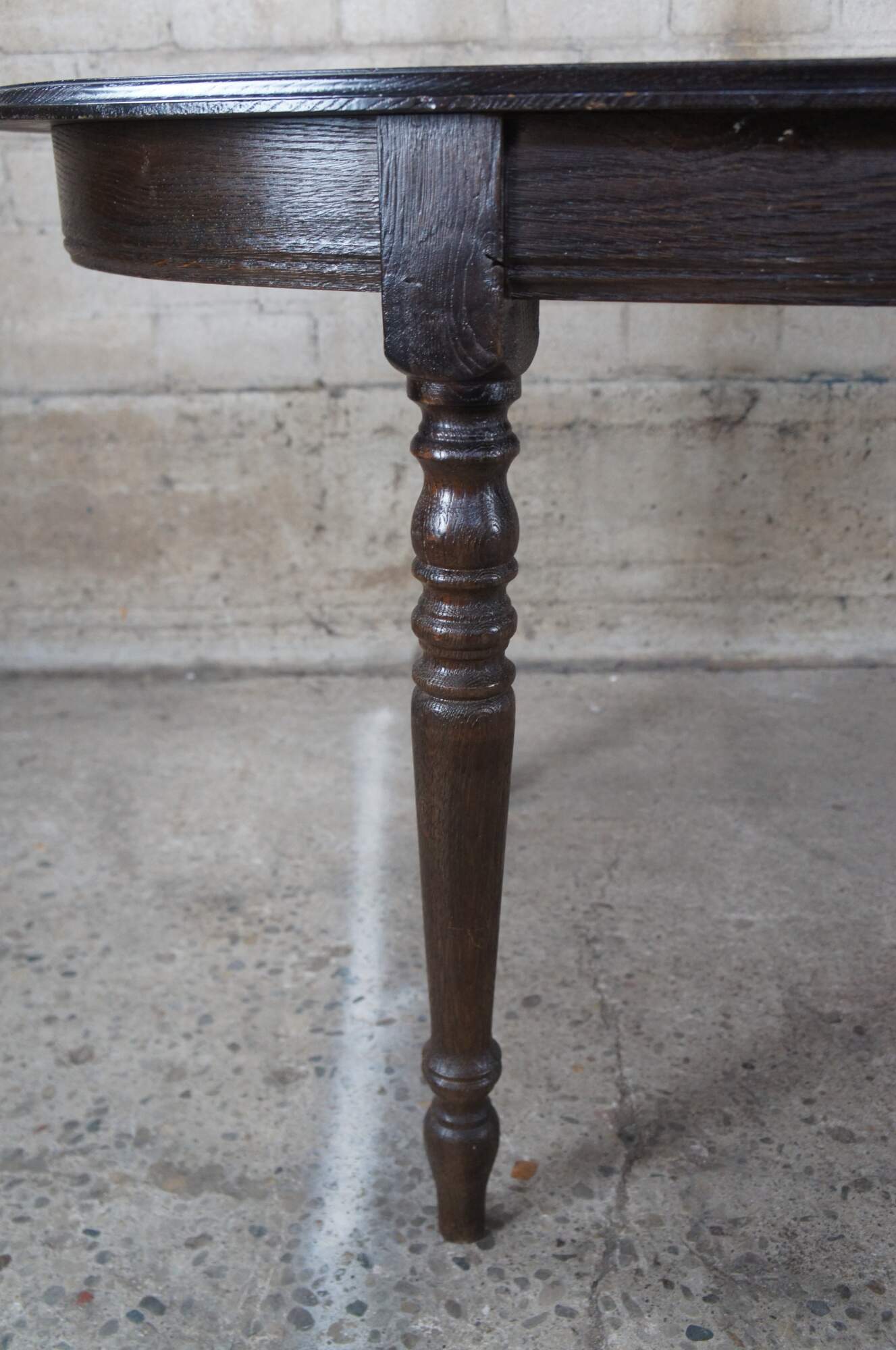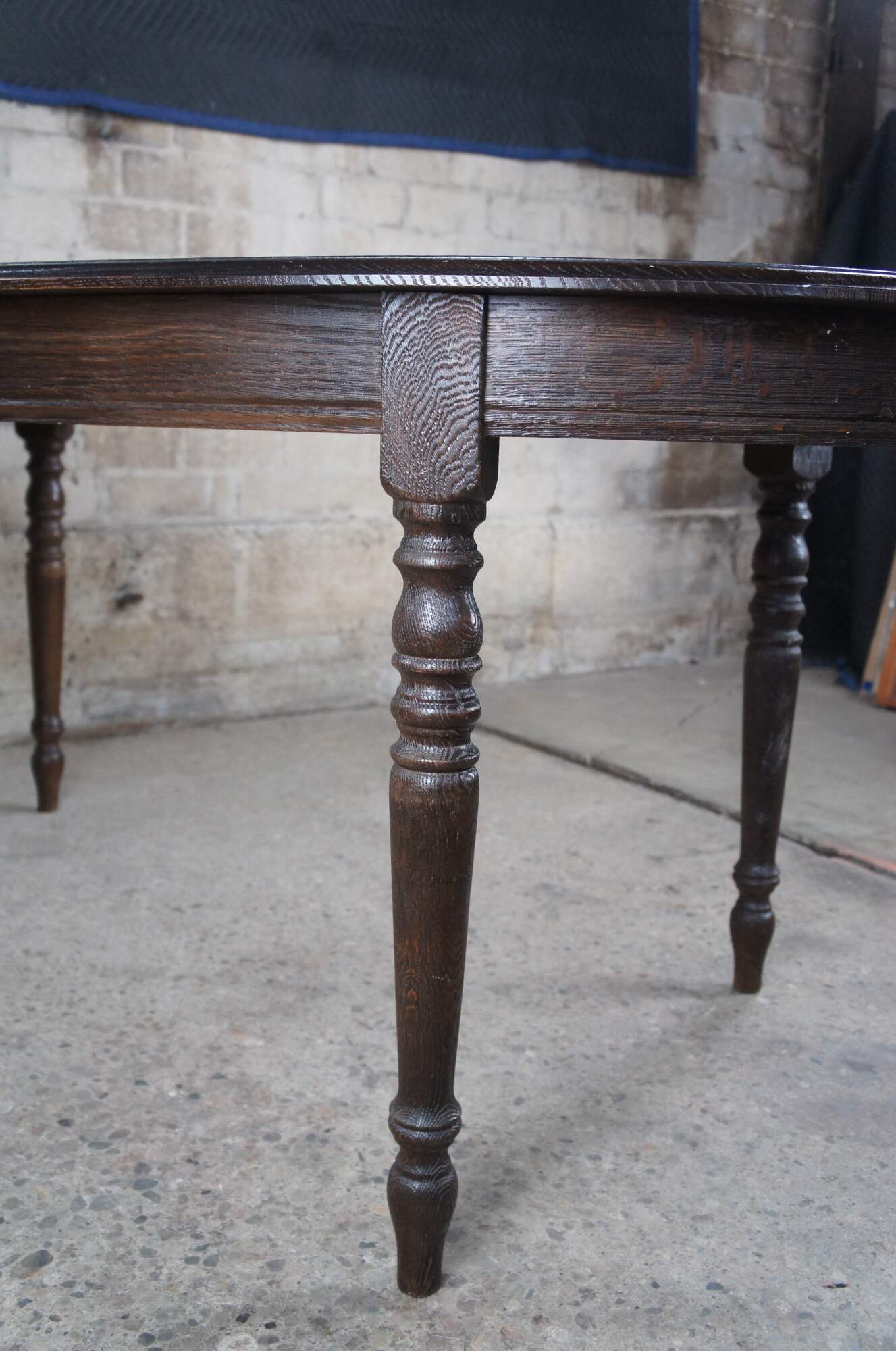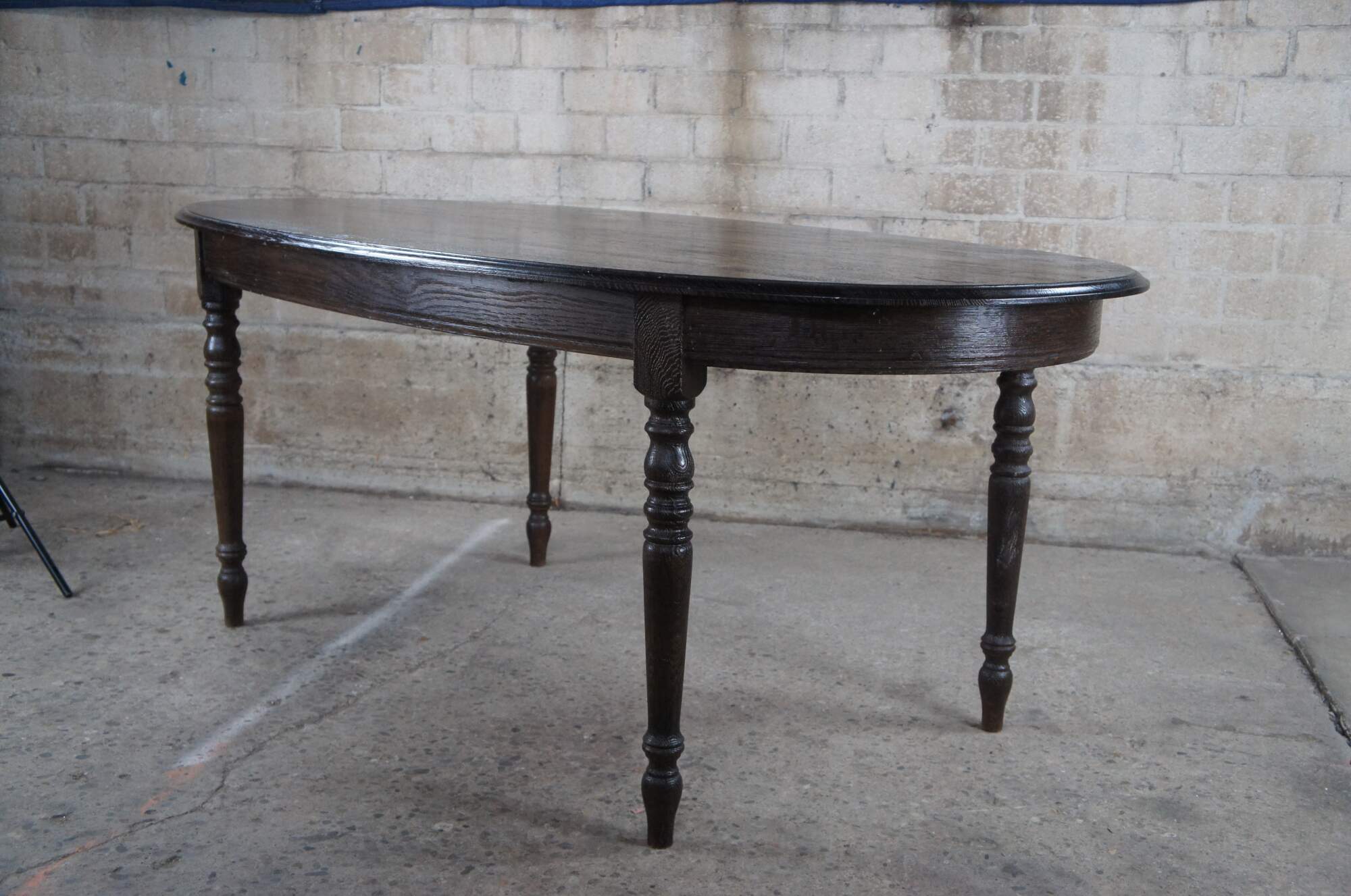 A simple yet beautiful European dining or library table. Made from oak with turned legs leading to turnip feet. Finished in a medium brown stain.